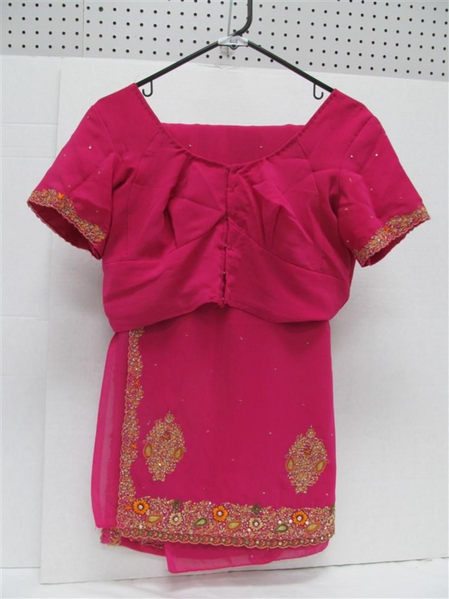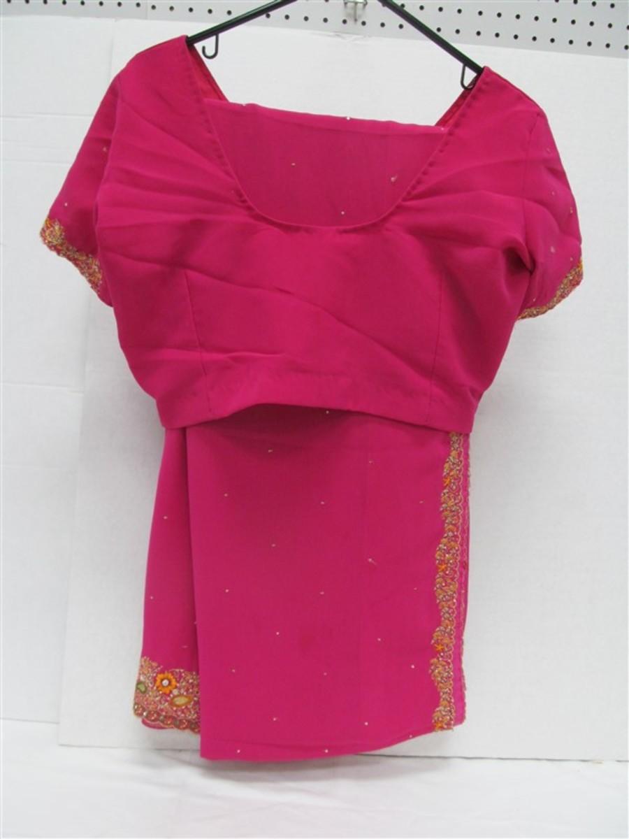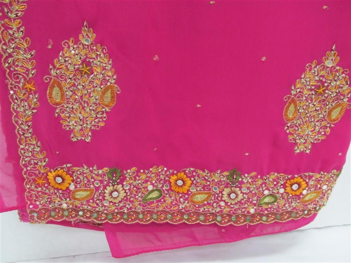 INDIAN SARI SAREE BRIGHT FUSCHIA WITH SEQUINED & BEADED FLORAL TRIM BONUS TOP