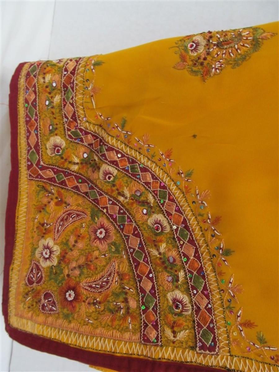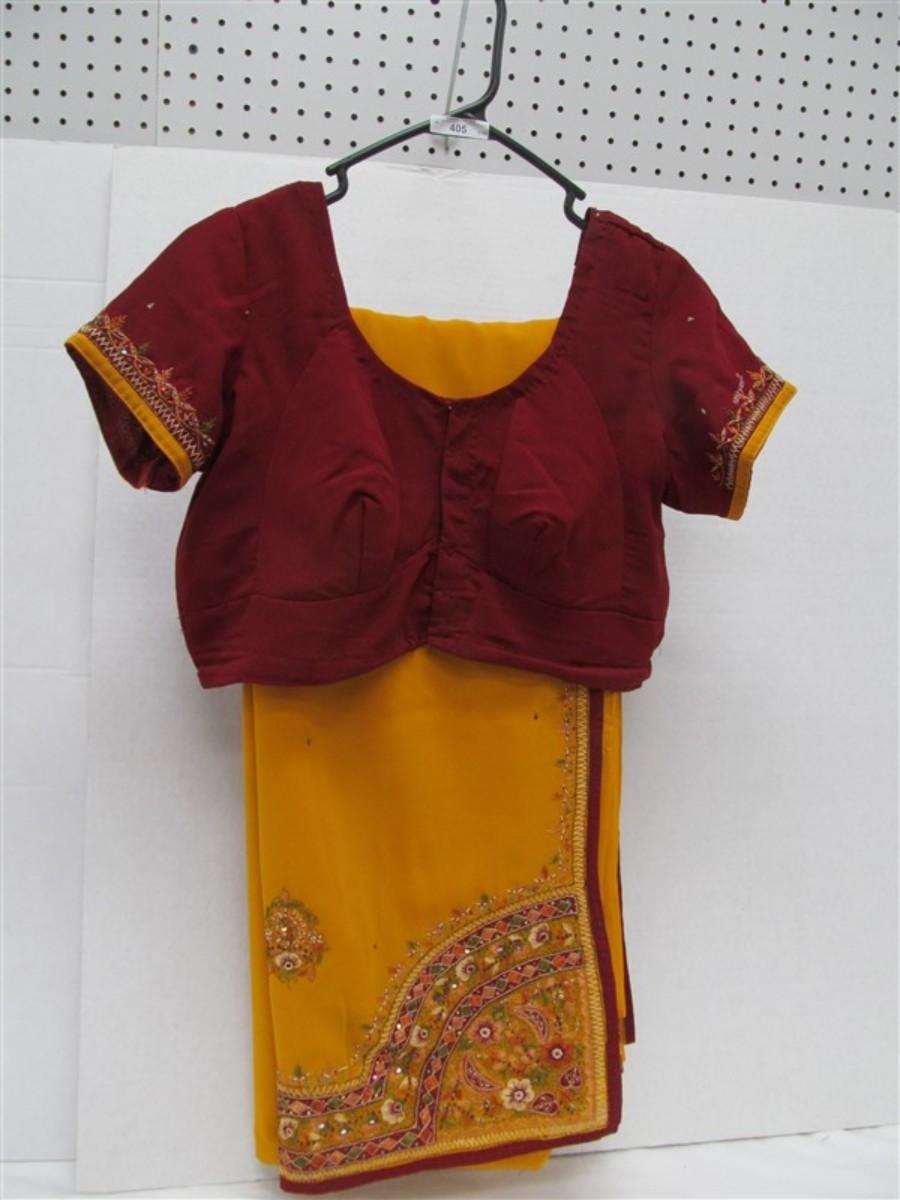 INDIAN SARI SAREE BURGUNDY & MUSTARD BEADED WITH SEQUINS BONUS TOP note small spot in photo
