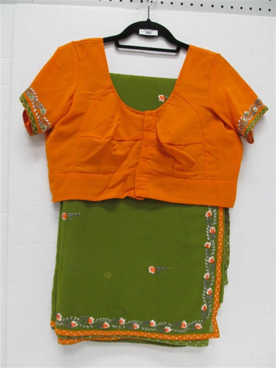 INDIAN SARI SAREE ORANGE & AVOCADO GREEN WITH EMBROIDED FLORAL TRIM BONUS TOP