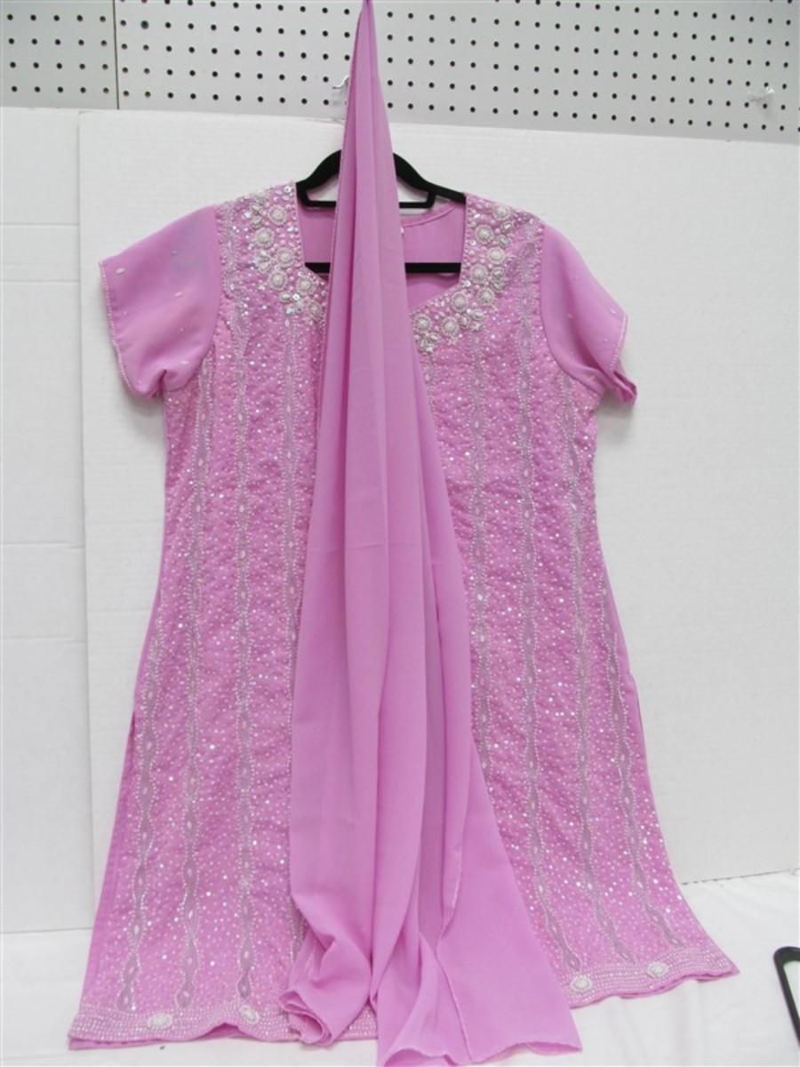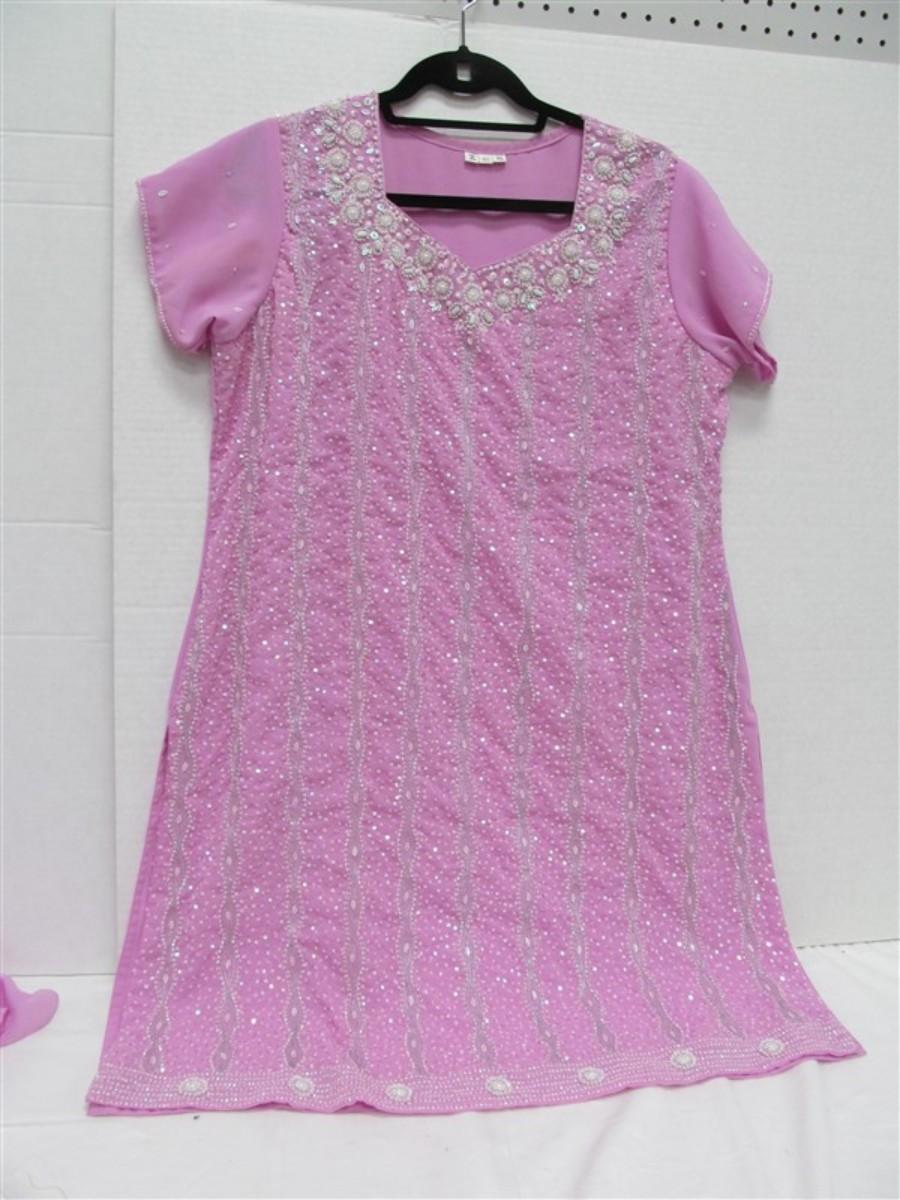 INDIAN TUNIC 3 PC. LIGHT PINK WITH RHINESTONES & SEQUINS TUNIC SCARF PANTS