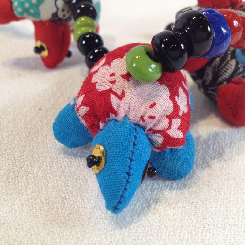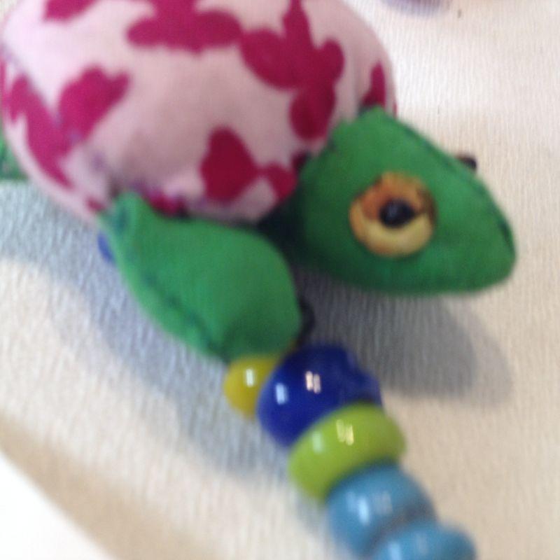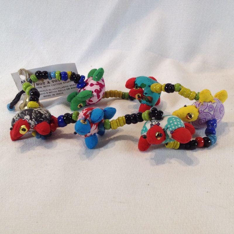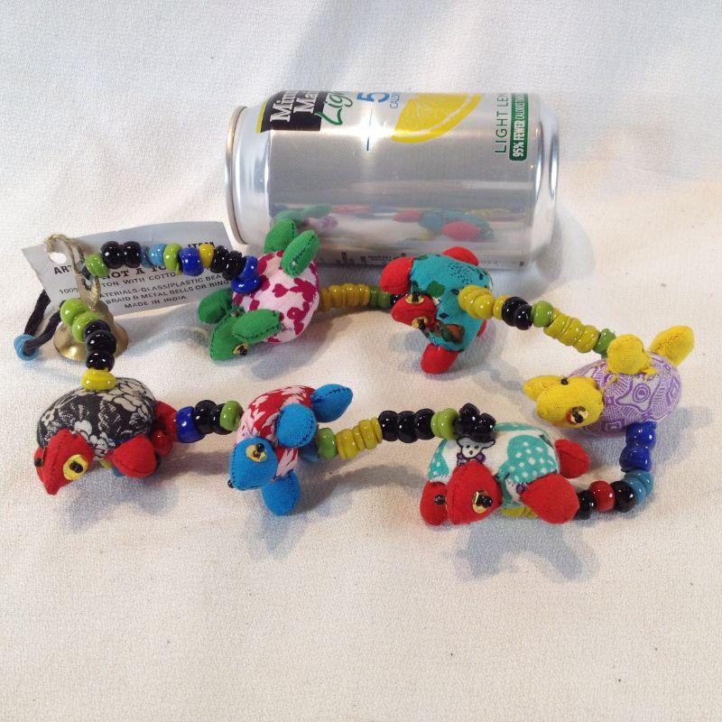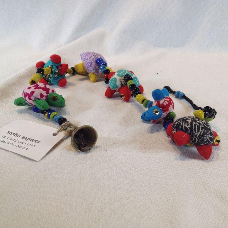 This offering is a Bangle String of Cloth with Handmade Turtles and Beads with a Bell on the End. Nicely made. Quite pretty and unique. Ready for your window or sun room.