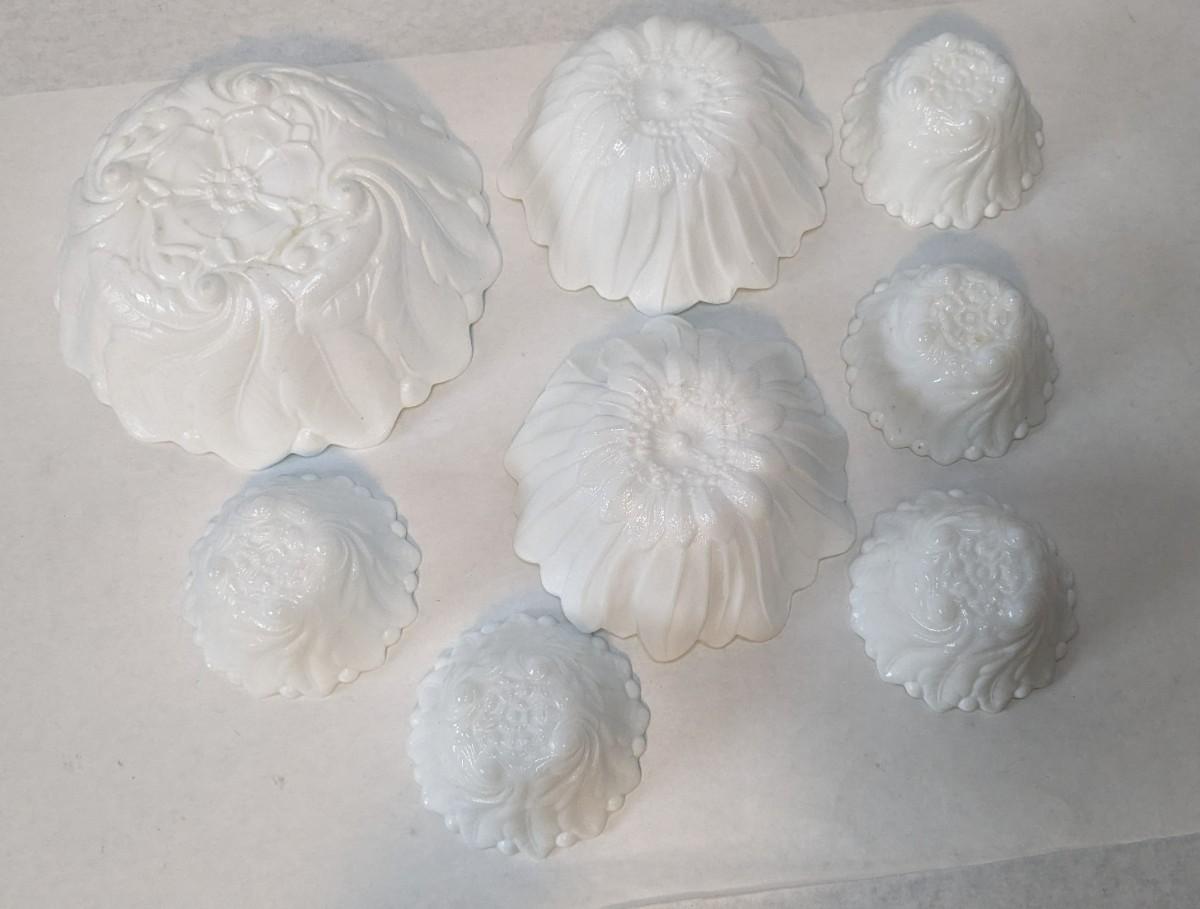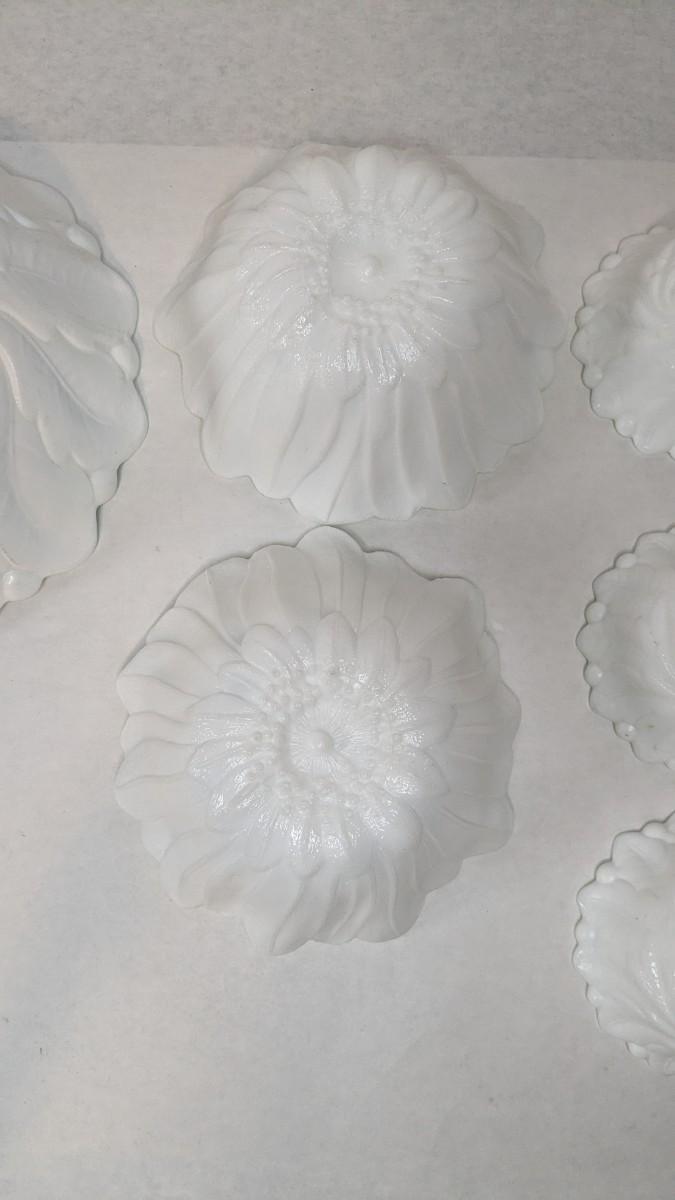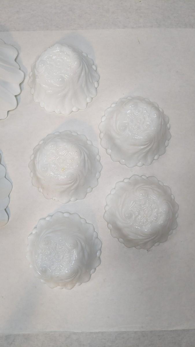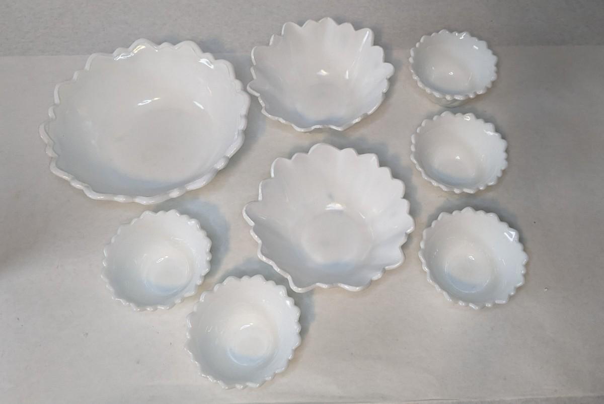 an incredible milk glass bowl set featuring (1) 9 1/8" serving bowl, (2) Fenton 7" bowls, and (5) 4.5" dessert dishes. All pieces show no chips, cracks, or structural damage with some bowls showing some slight discoloration on exterior. Some truly beautiful vintage dishes!