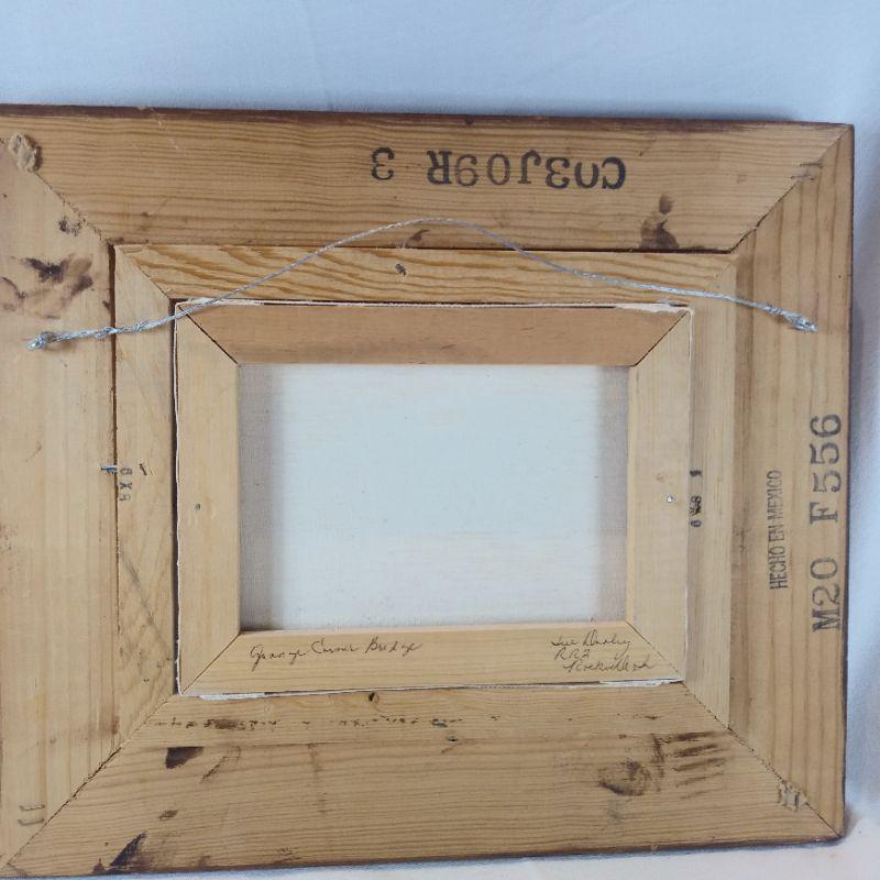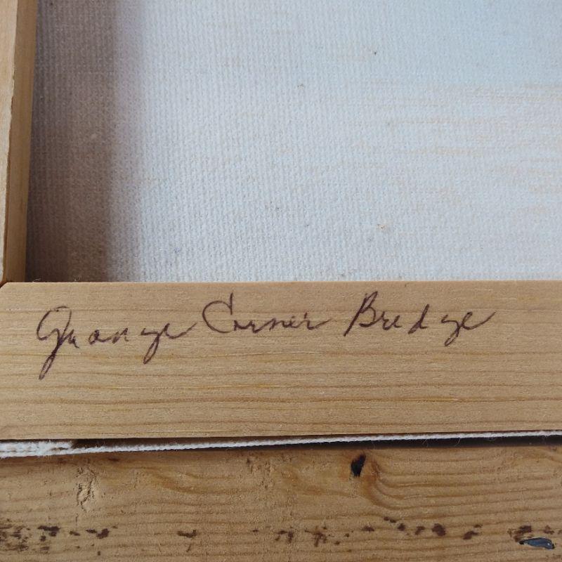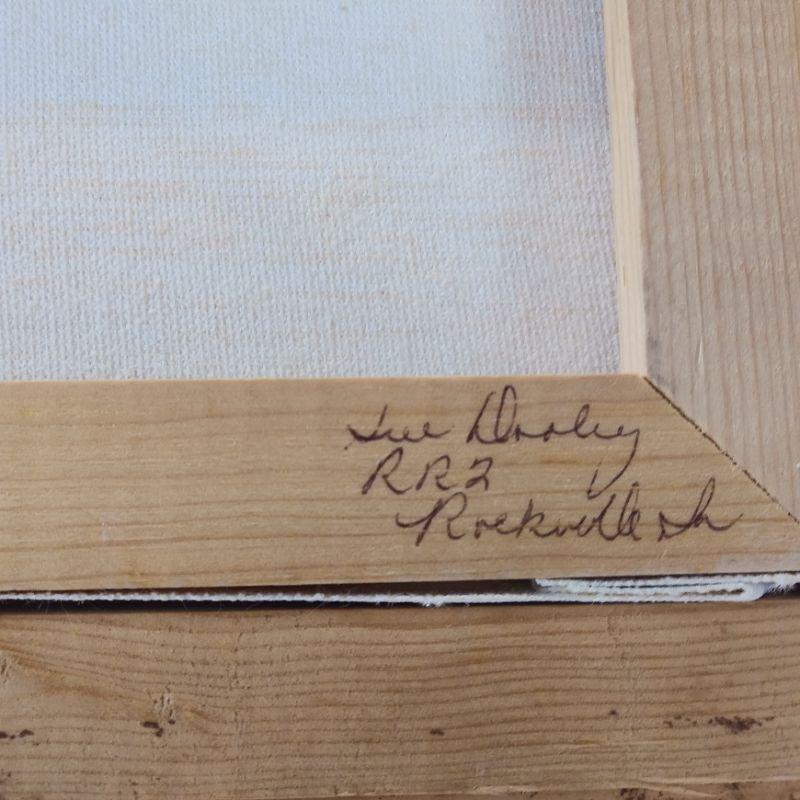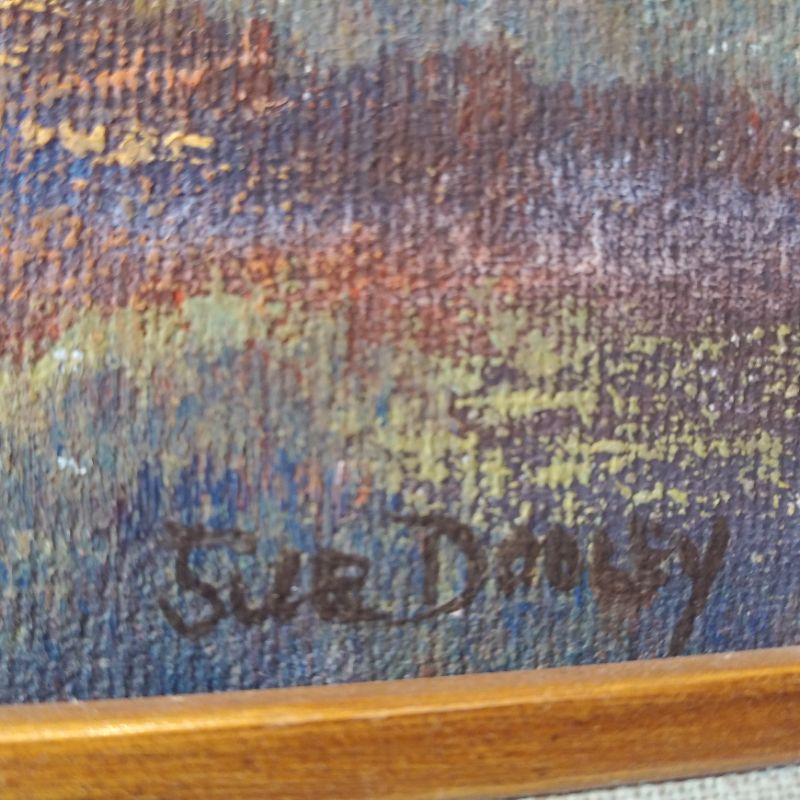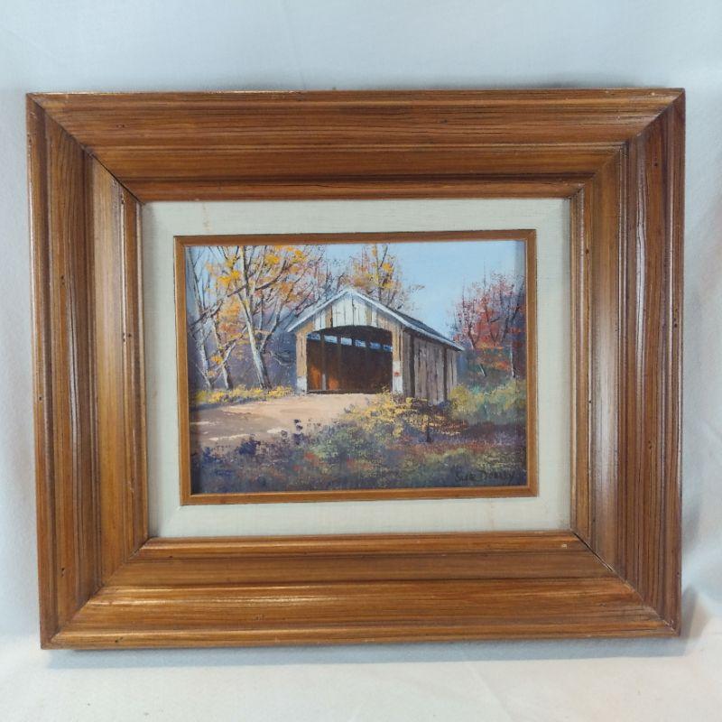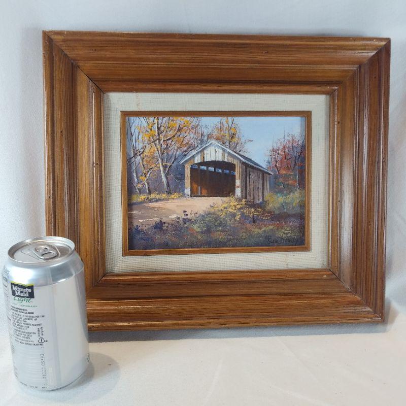 This item is a painting entitled "Grange Covered Bridge" by listed Indiana artist Sue Dooley. Oil on canvas in very good condition. Framed and ready to hang. Overall size is 14-inches wide X 12-inches tall. Don't be a Wish-I-Had on this painting, Brown County artist work can sell for many dollars.