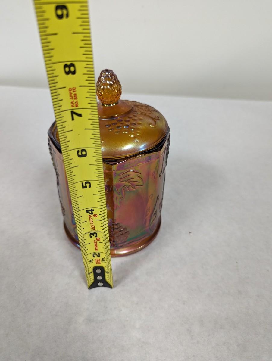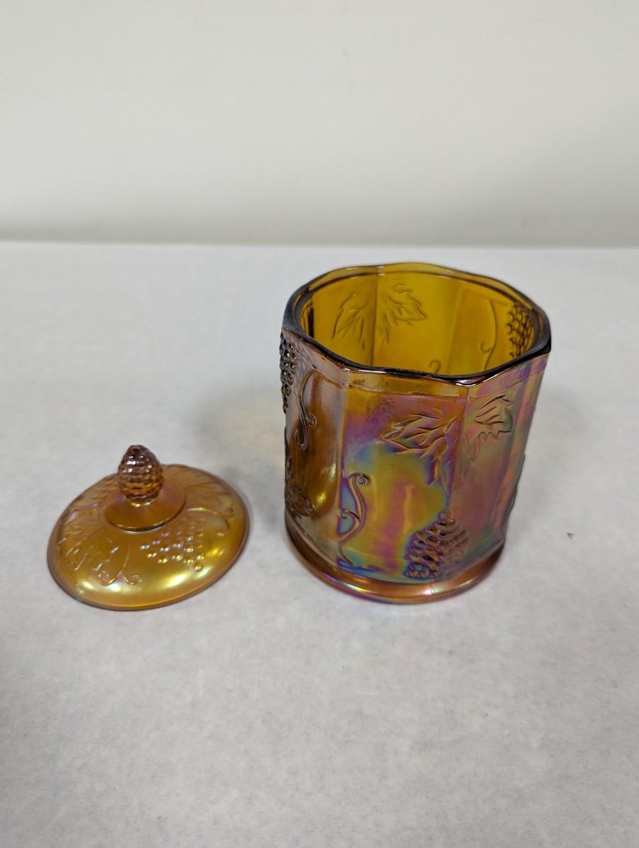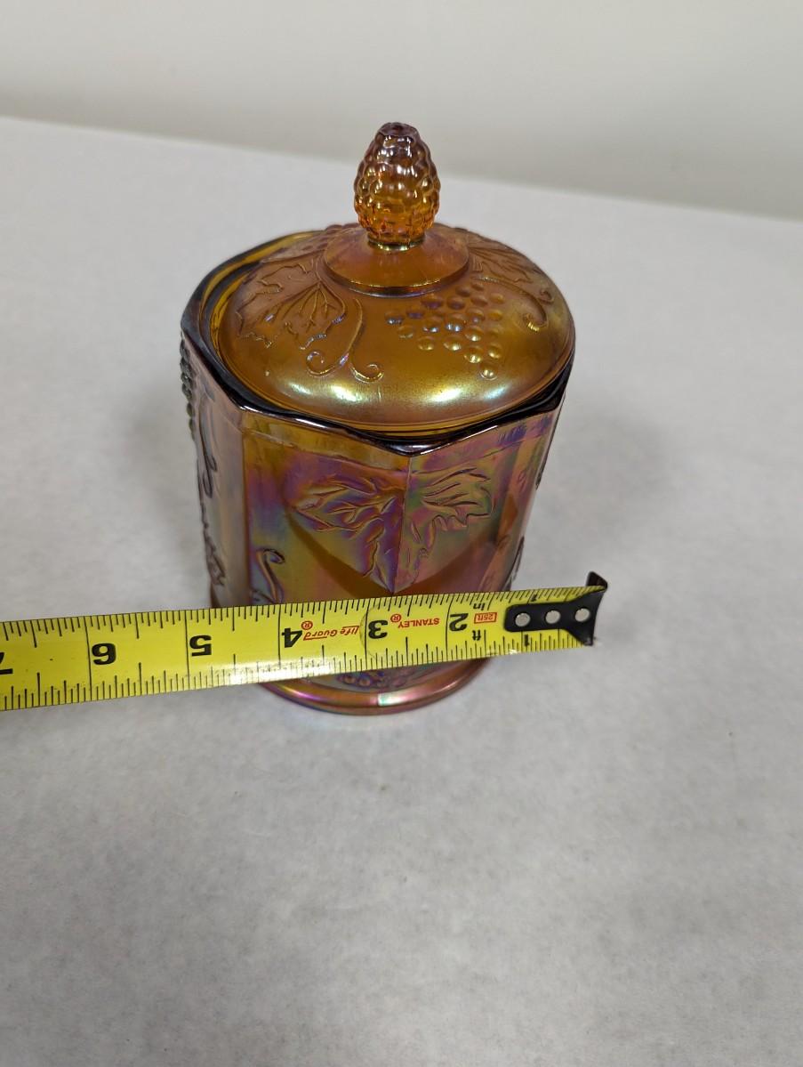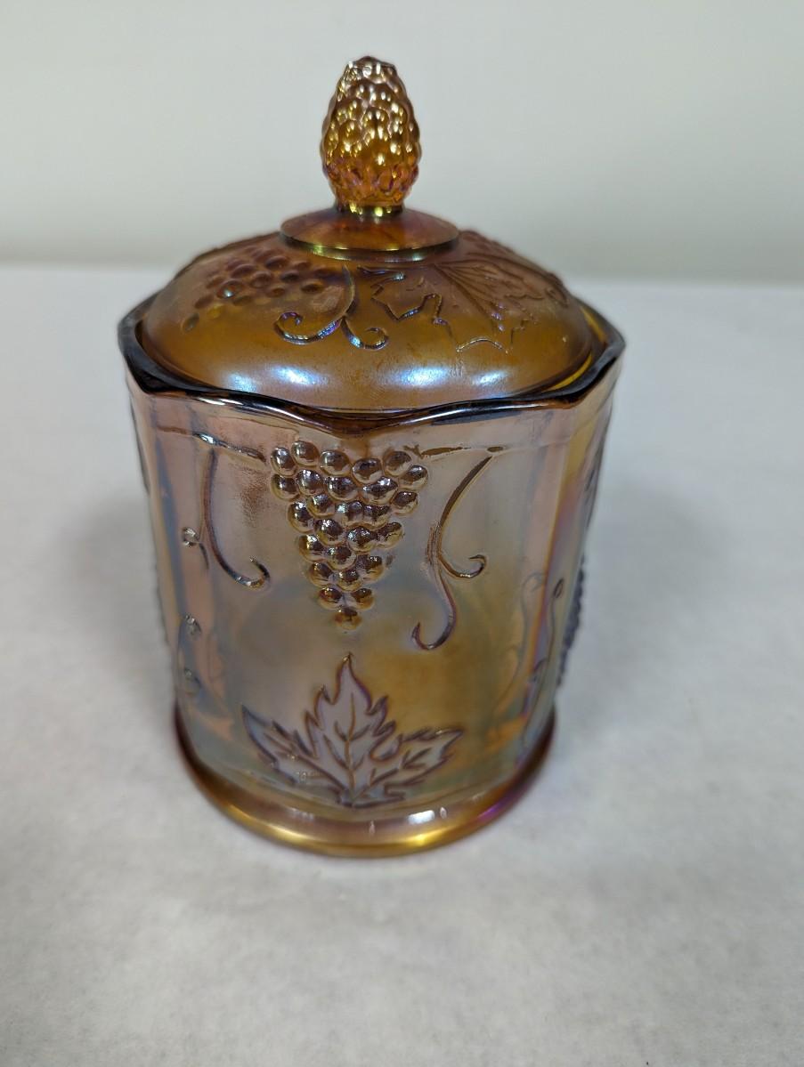 Indiana Carnival Glass Canister Candy Dish Amber Grape Leaves Harvest