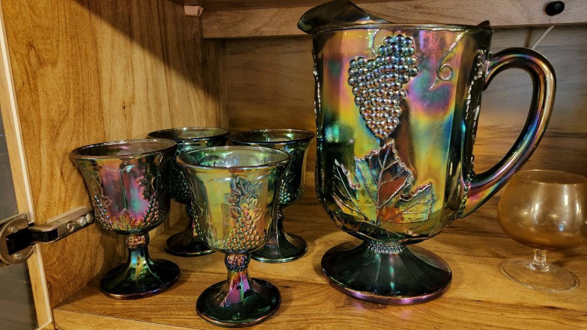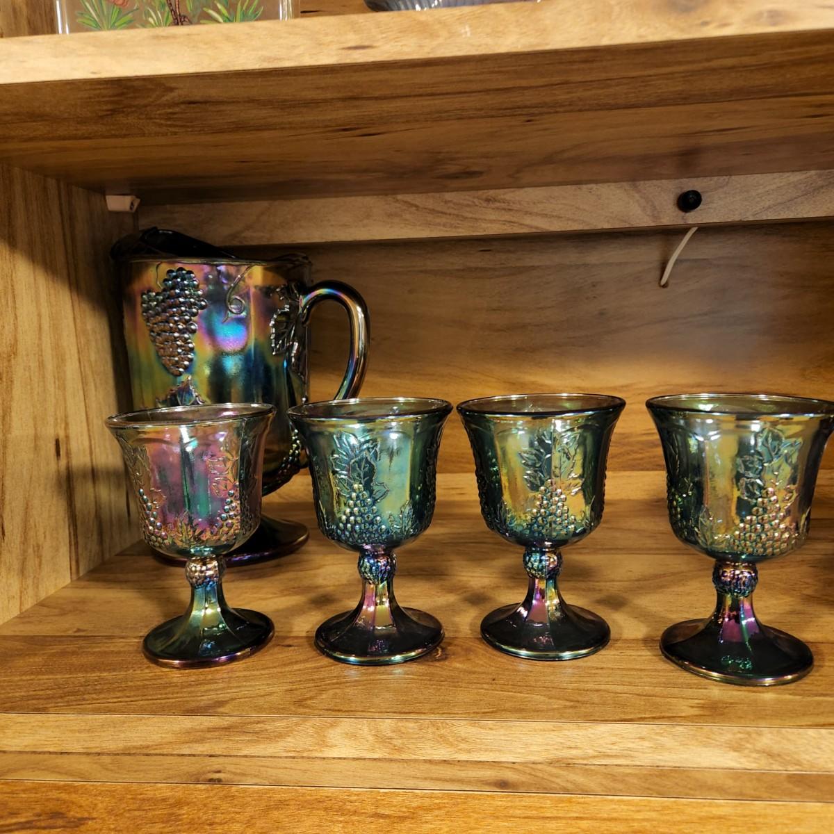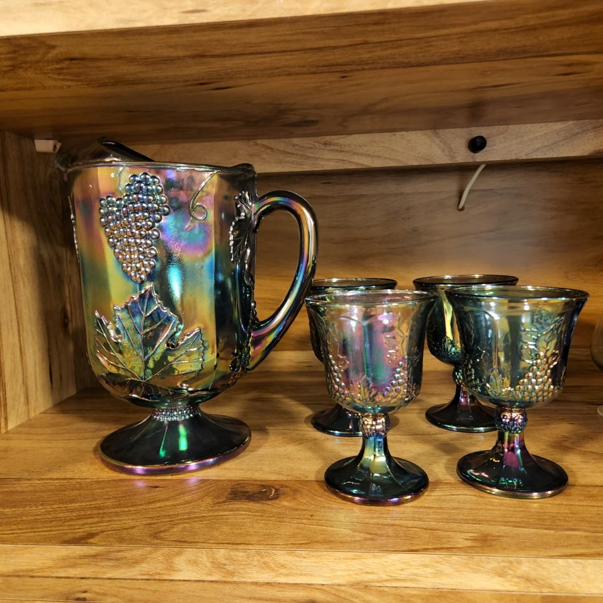 Indiana Carnival Glass Grape and Leaf Pitcher & 4 Cups
