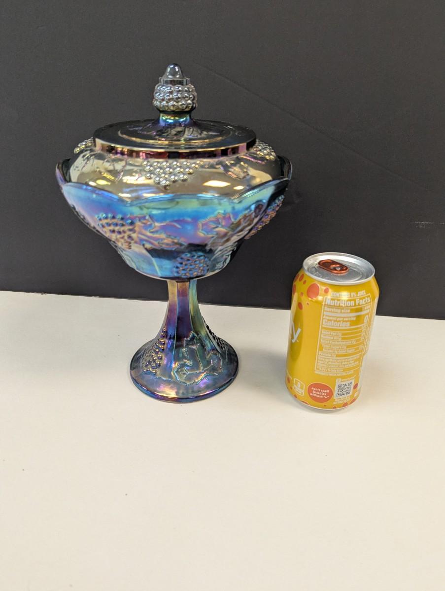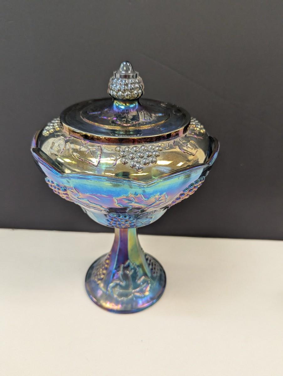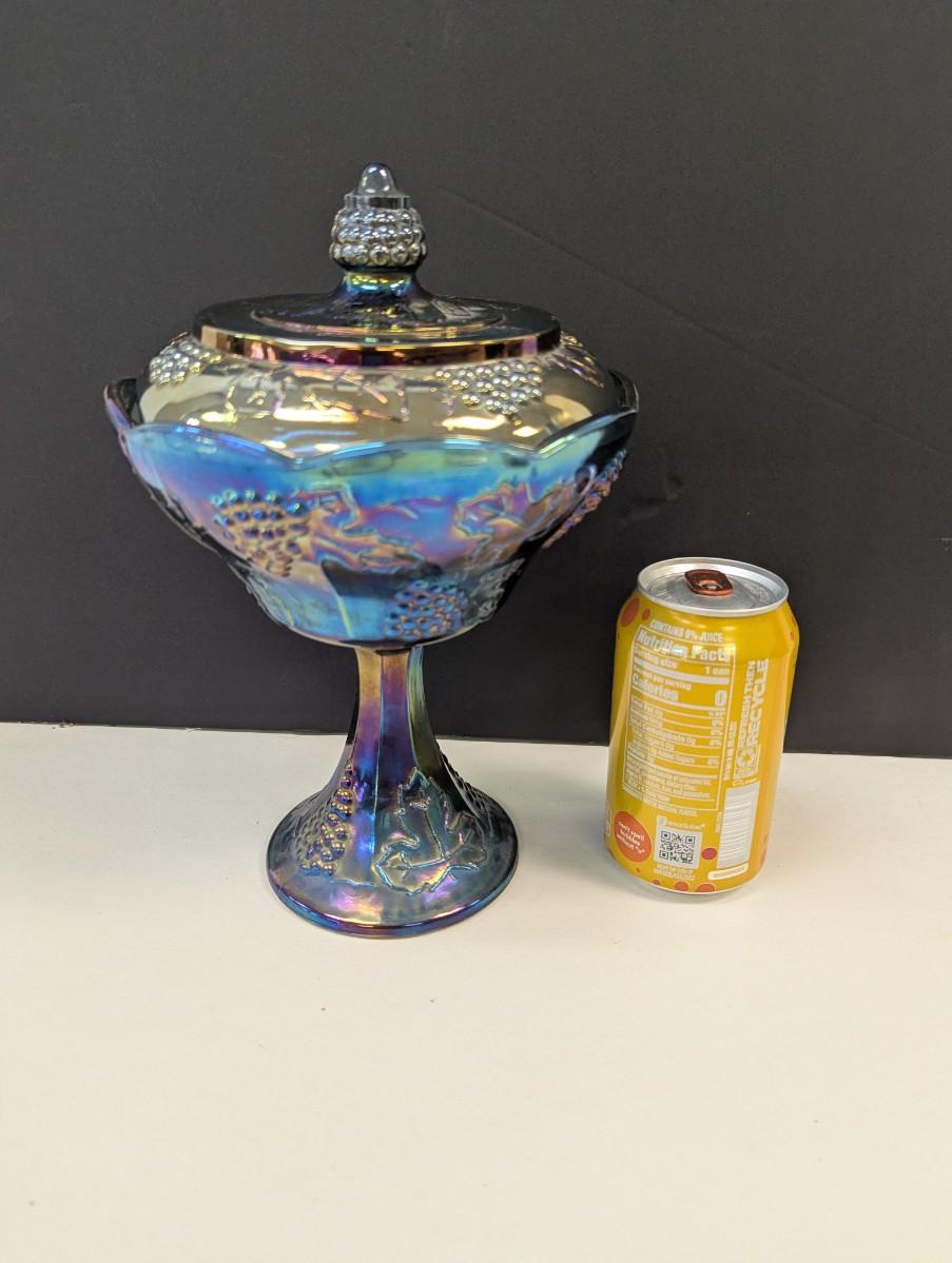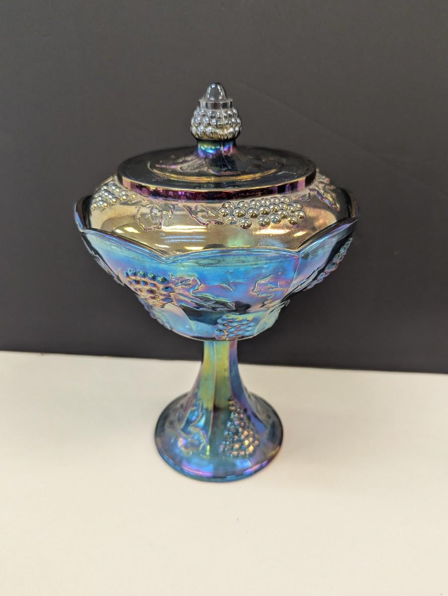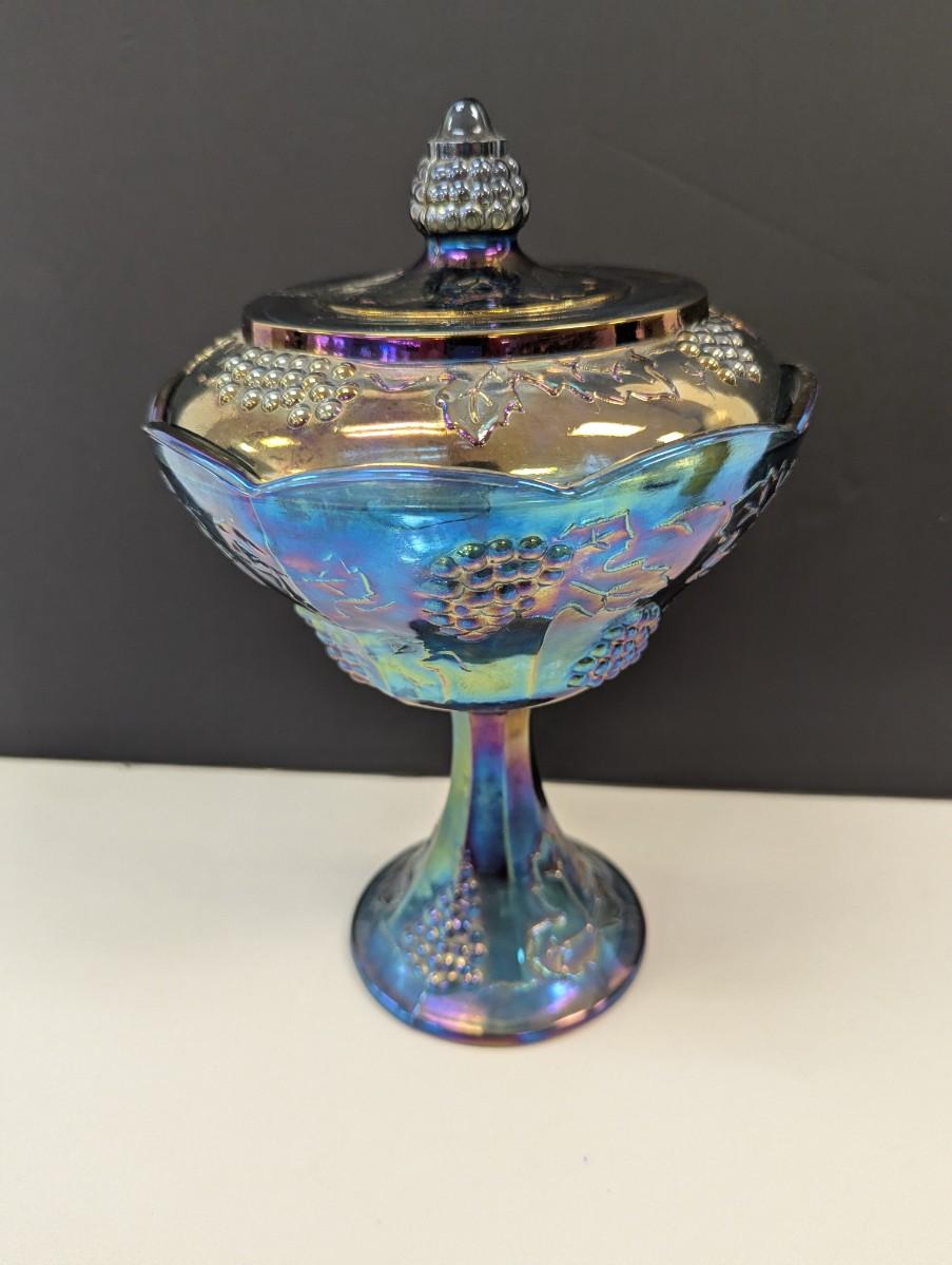 Indiana Carnival Glass Iridescent Blue Harvest Grape Lidded Compote