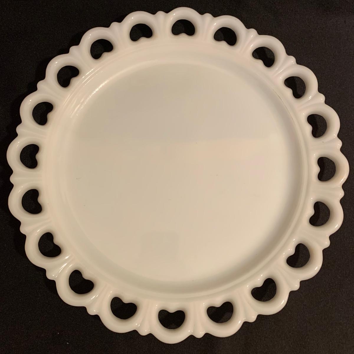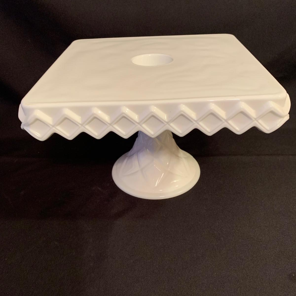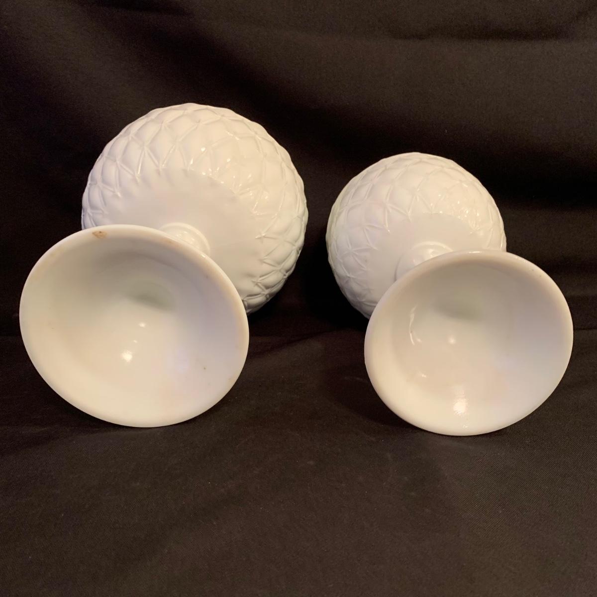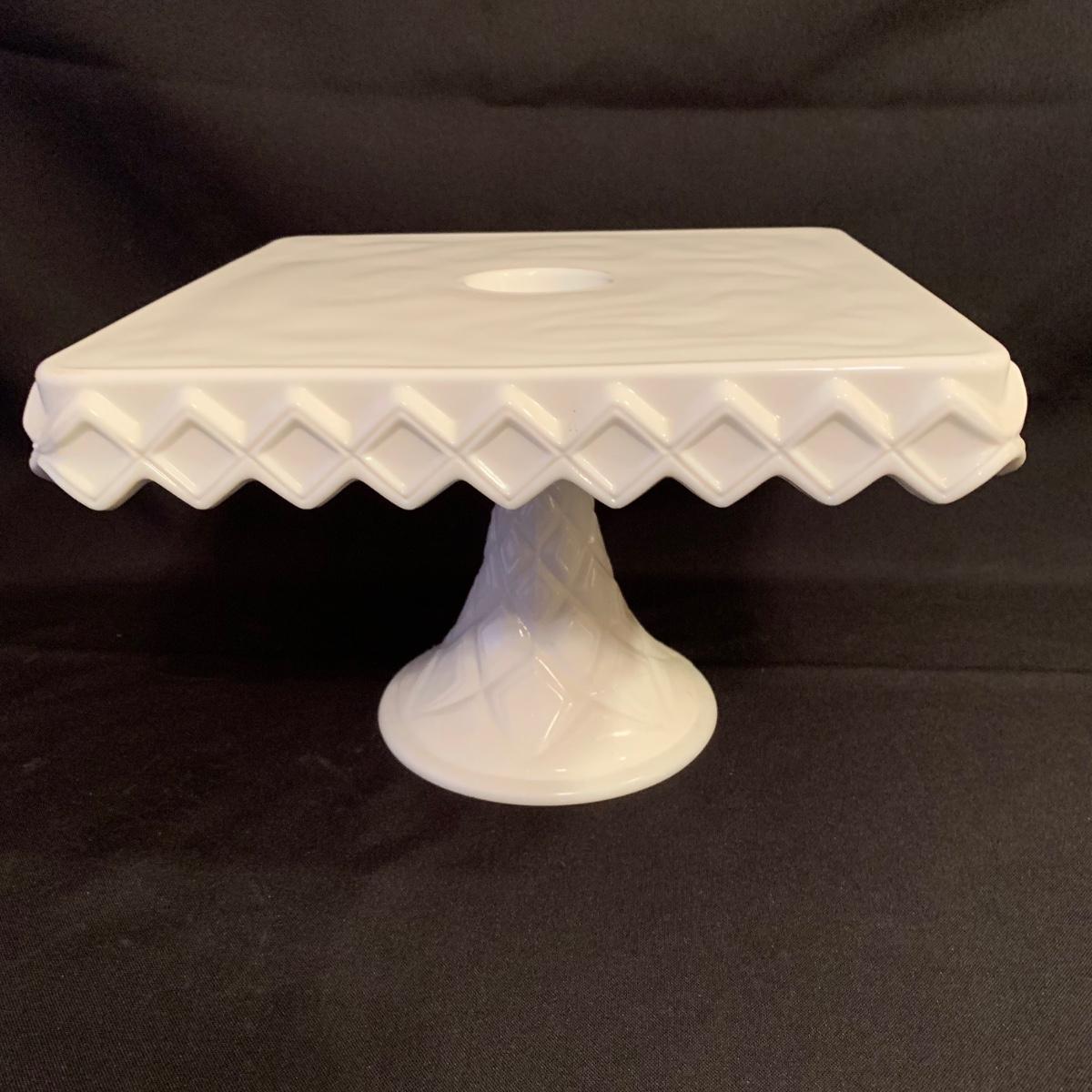 Lovely assortment of milk glass from Indiana, Hazel Atlas, McKee, Kemple, Anchor Hocking, and Westmoreland Glass Companies. This extensive lot includes two footed diamond and quilt pattern compote bowls, two diamond and quilt pattern bowls, a square diamond pattern cake stand, and four orange blossom cups with snack plates from Indiana Glass Company. Additionally, there's a variety of vases and drinking goblets, including three by Hazel Atlas, one by McKee, and four other unique varieties. The collection also features a 13”D Anchor Hocking serving dish, an 8.5”D Anchor Hocking dish, a commemorative President Garfield Memorial plate, a Westmoreland Owl plate, and two lace heart luncheon plates by Kemple Glass Co. Large footed compote bowl measures, 7”D x 9”H. Please see photos for more details and note that only glass items are included in this lot. Please note that not all items have a maker's mark or manufacturer information, but that they have the appearance of the brand names listed in the above description.