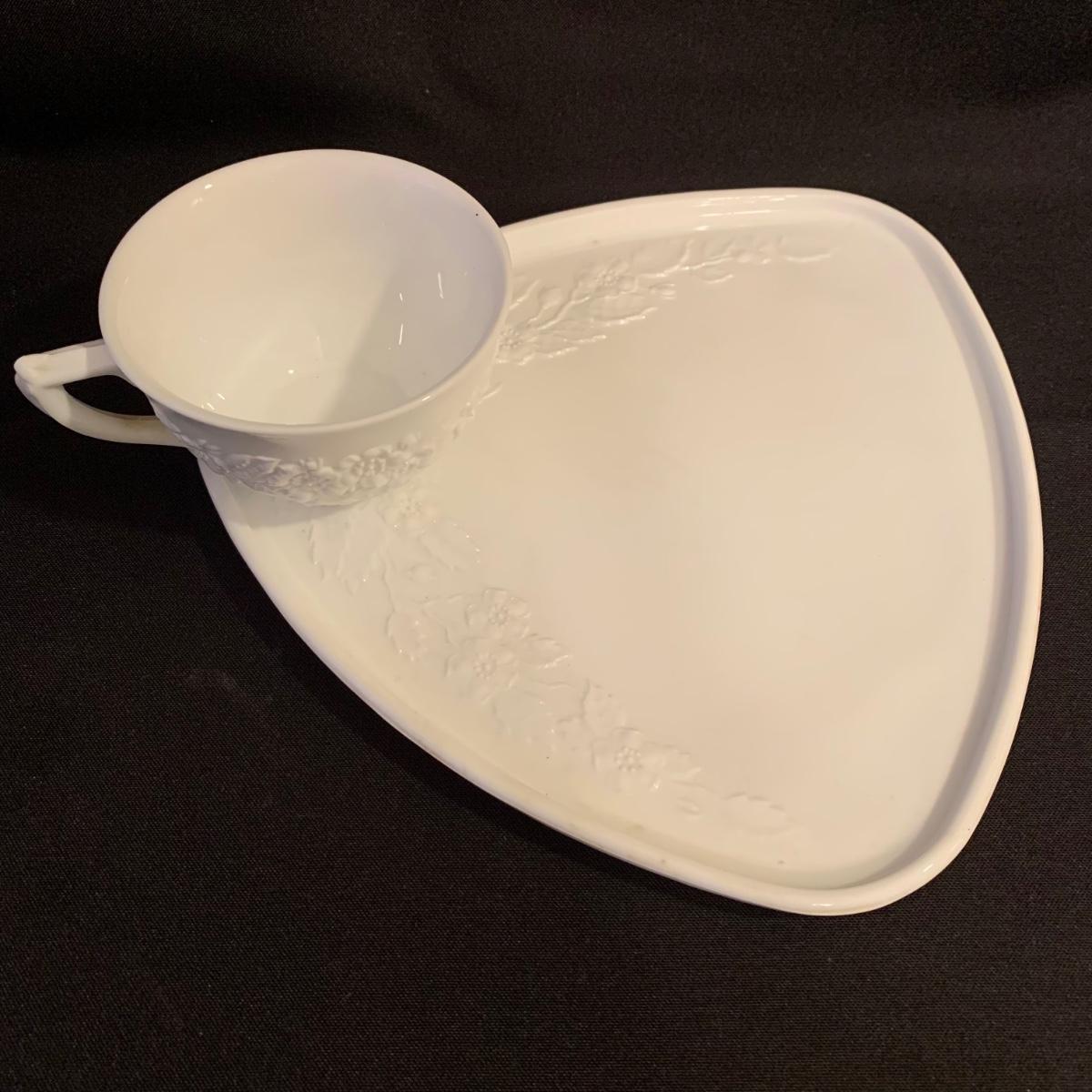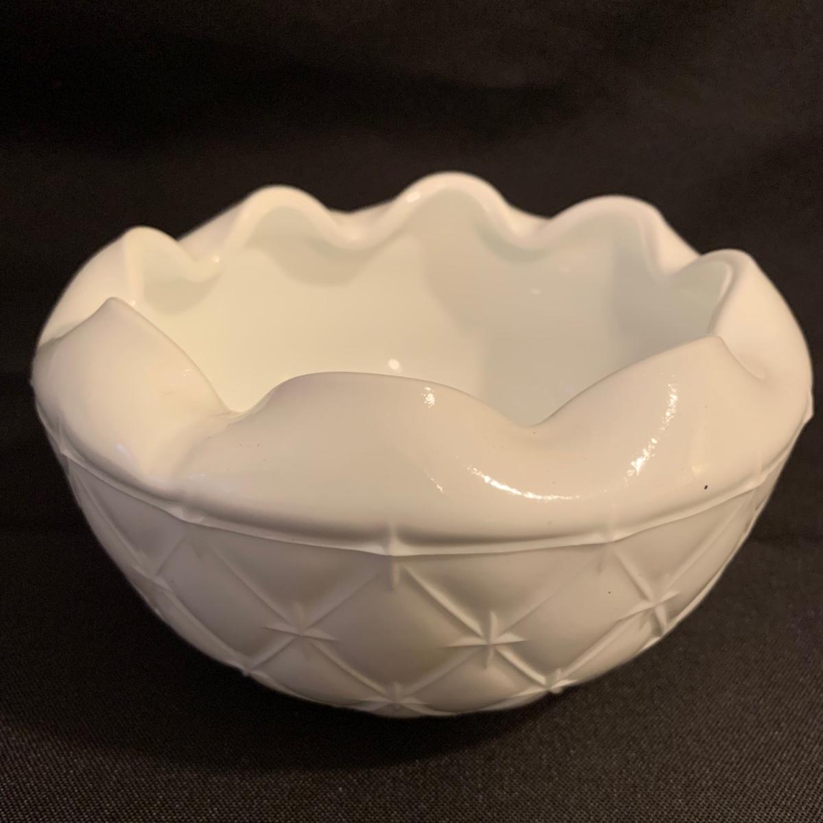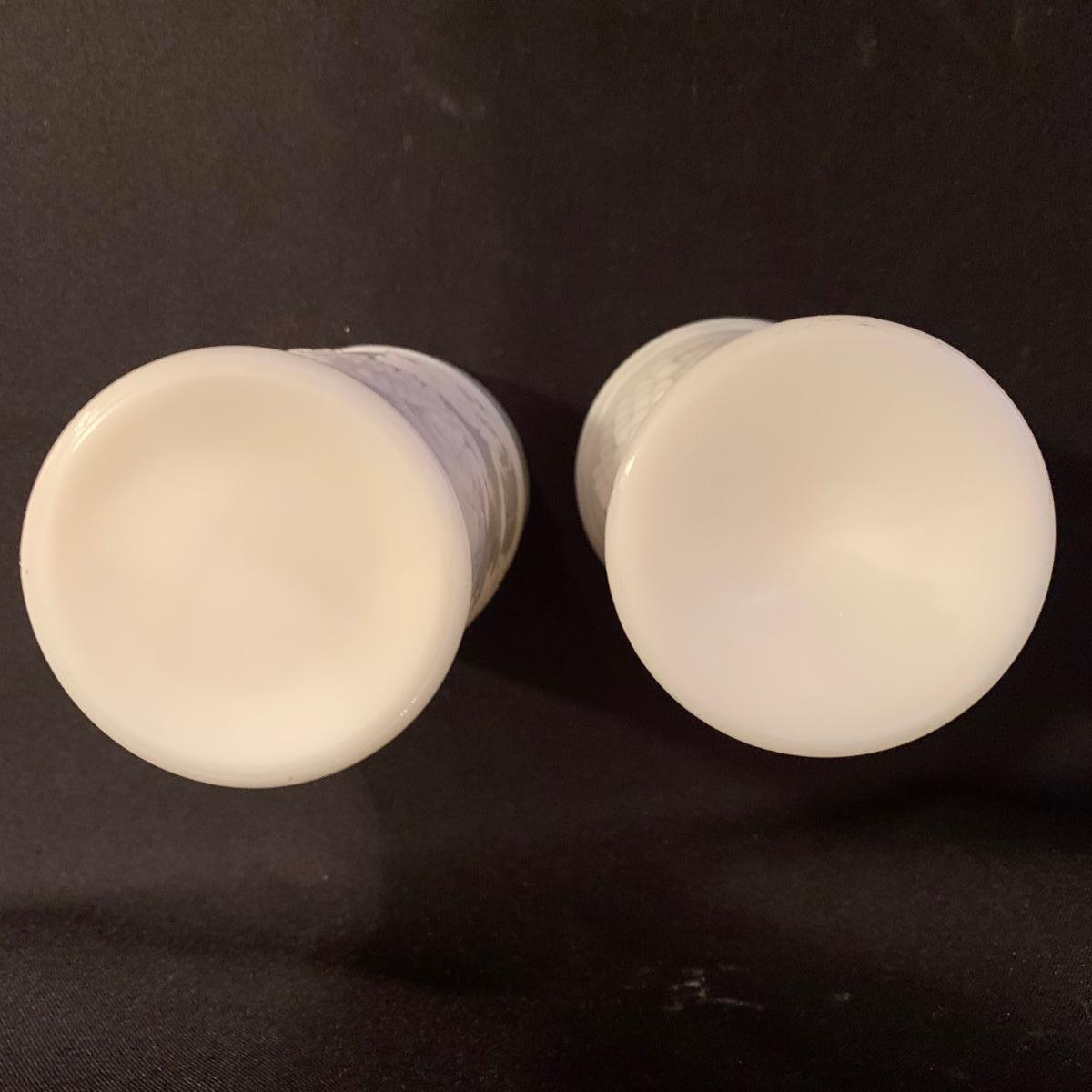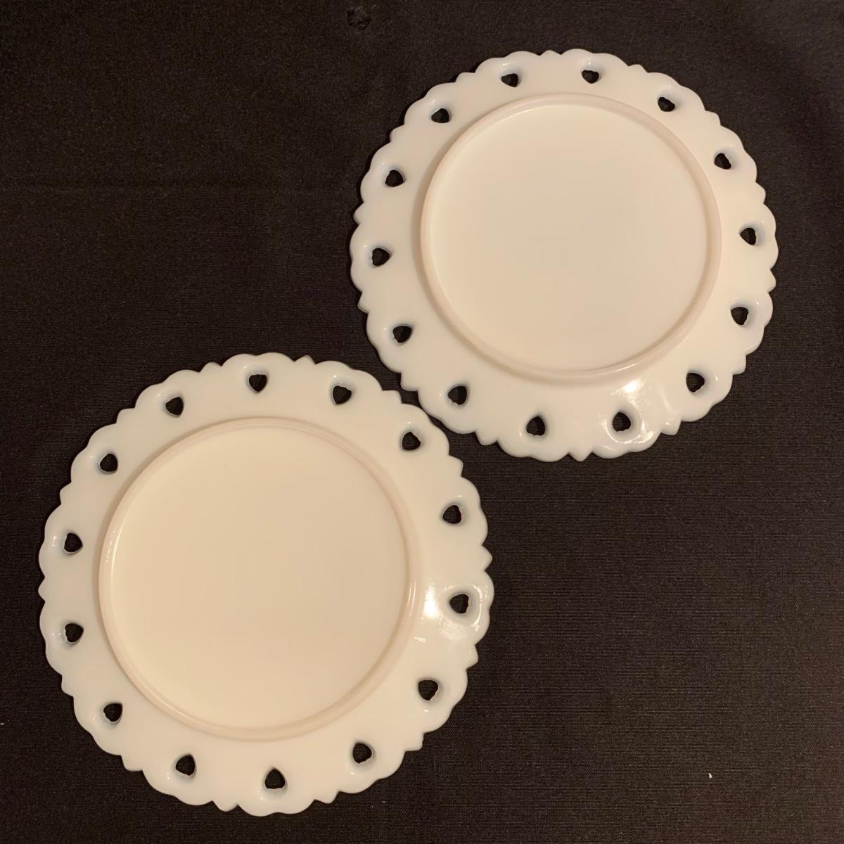 Lovely assortment of milk glass from Indiana, Hazel Atlas, McKee, Kemple, Anchor Hocking, and Westmoreland Glass Companies. This extensive lot includes two footed diamond and quilt pattern compote bowls, two diamond and quilt pattern bowls, a square diamond pattern cake stand, and four orange blossom cups with snack plates from Indiana Glass Company. Additionally, there's a variety of vases and drinking goblets, including three by Hazel Atlas, one by McKee, and four other unique varieties. The collection also features a 13”D Anchor Hocking serving dish, an 8.5”D Anchor Hocking dish, a commemorative President Garfield Memorial plate, a Westmoreland Owl plate, and two lace heart luncheon plates by Kemple Glass Co. Large footed compote bowl measures, 7”D x 9”H. Please see photos for more details and note that only glass items are included in this lot. Please note that not all items have a maker's mark or manufacturer information, but that they have the appearance of the brand names listed in the above description.