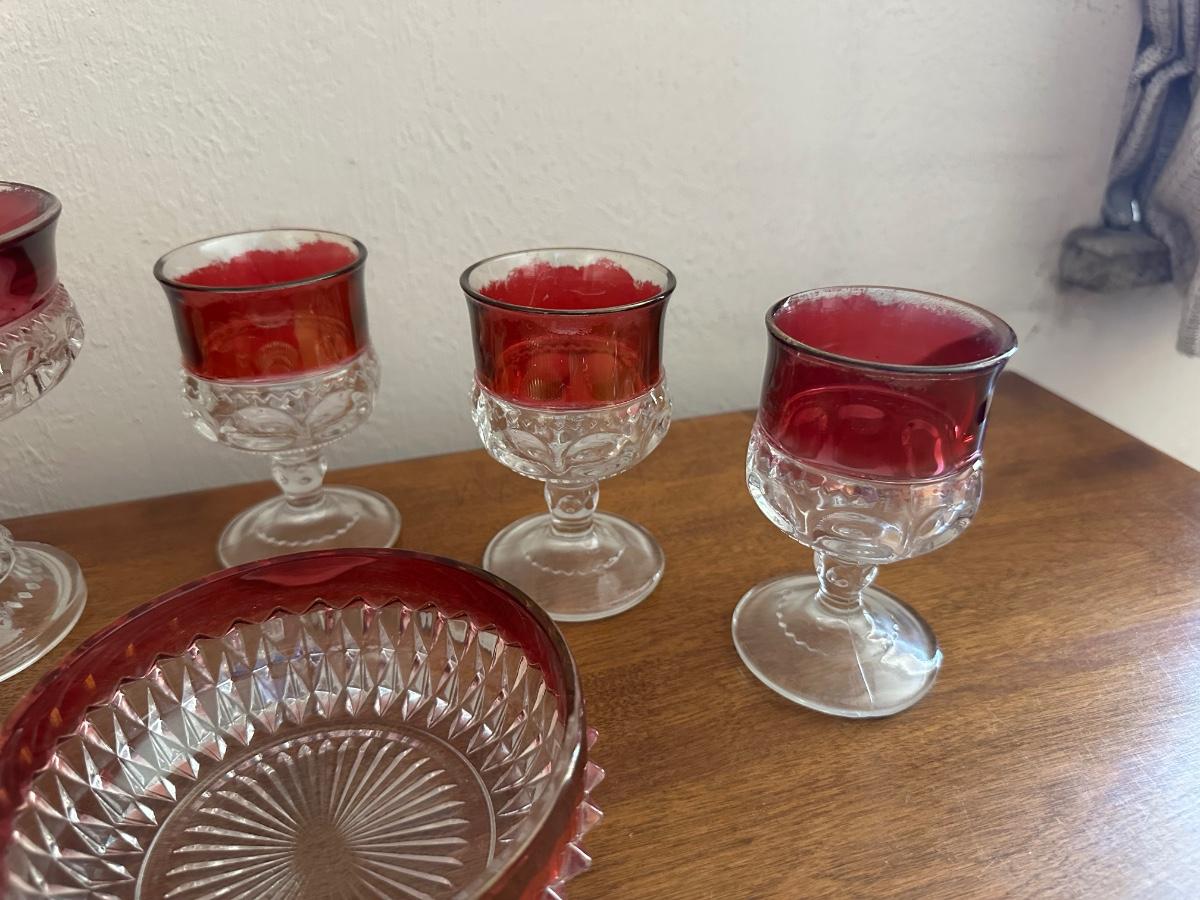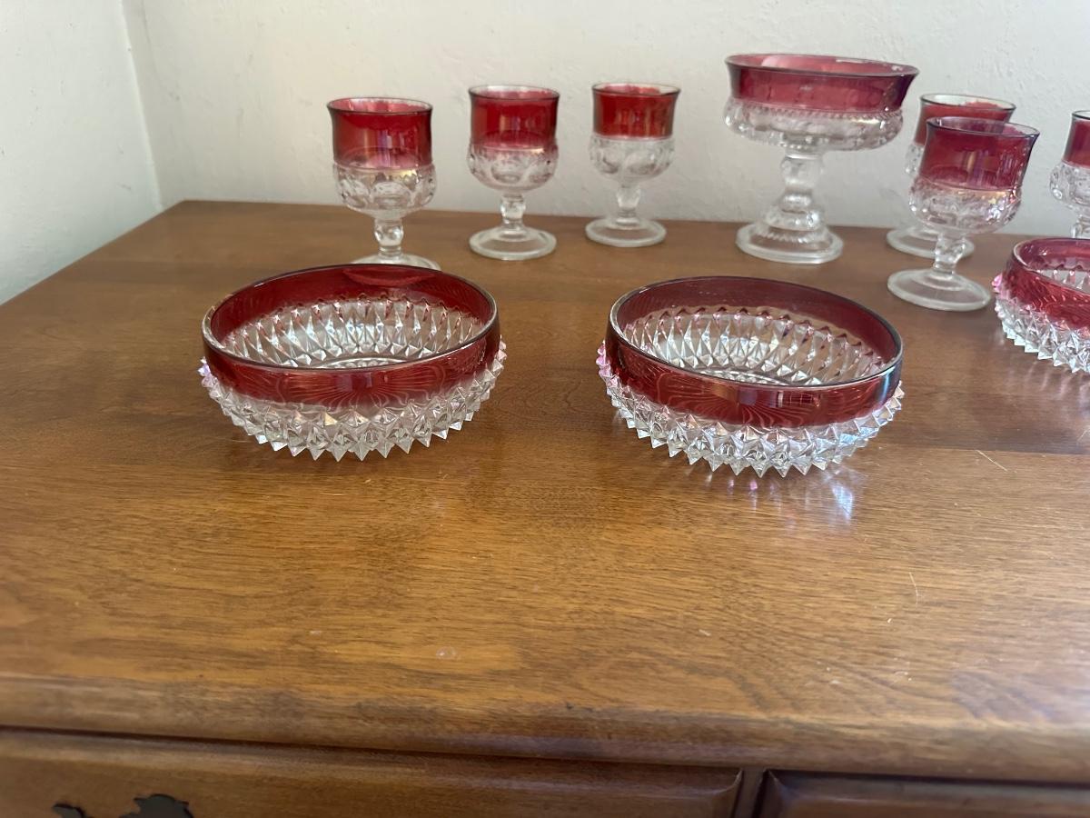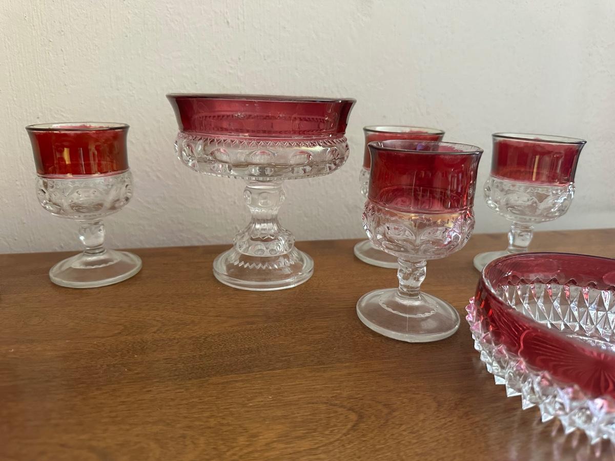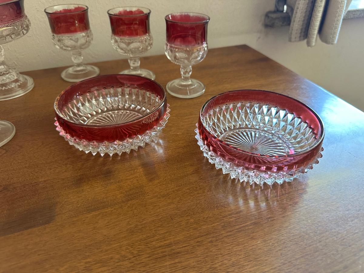 INDIANA GLASS RUBY RED FLASH DIAMOND POINT BOWLS, TIFFIN KING'S CROWN FOOTED WINE GLASSES & MATCHING COMPOTE