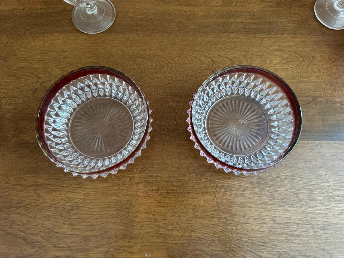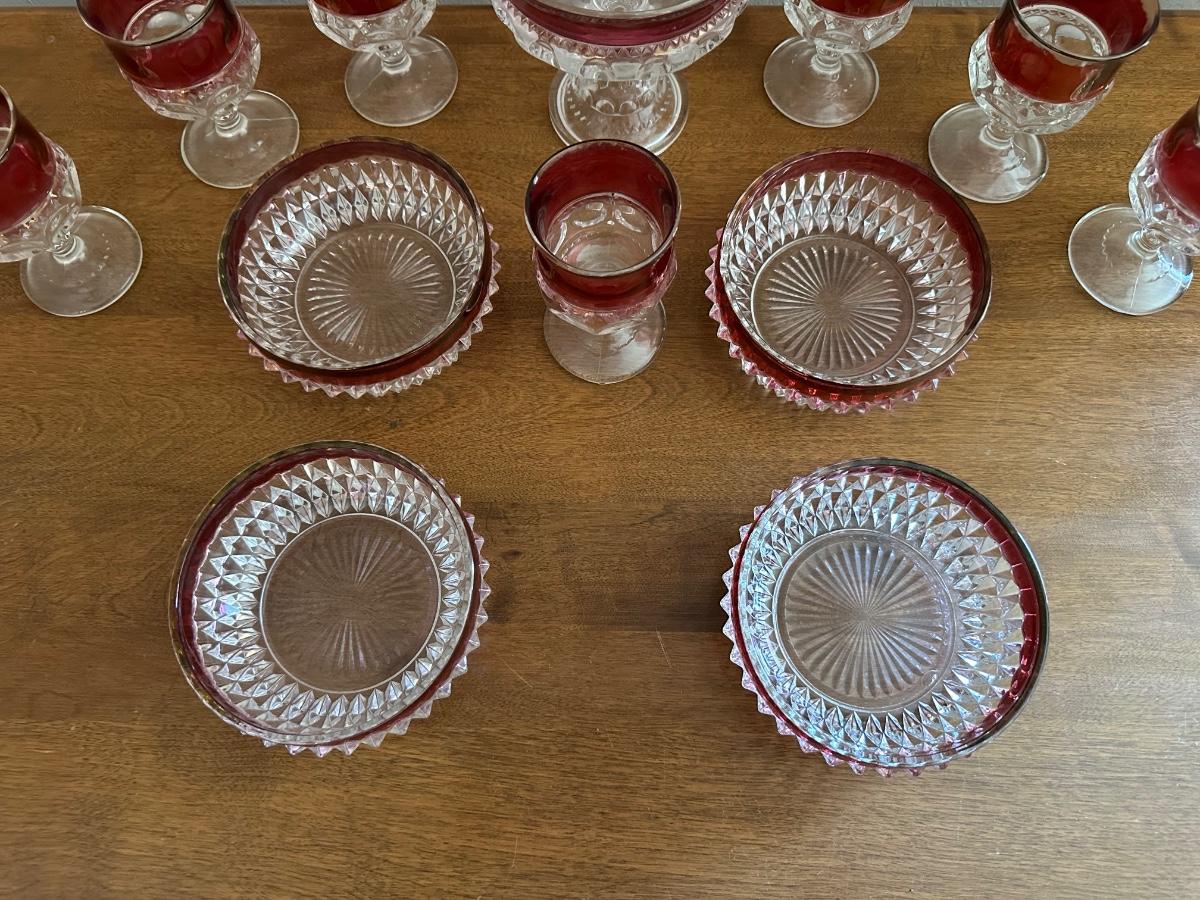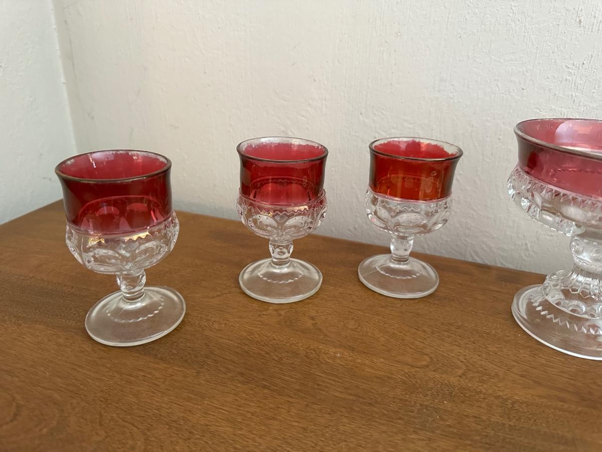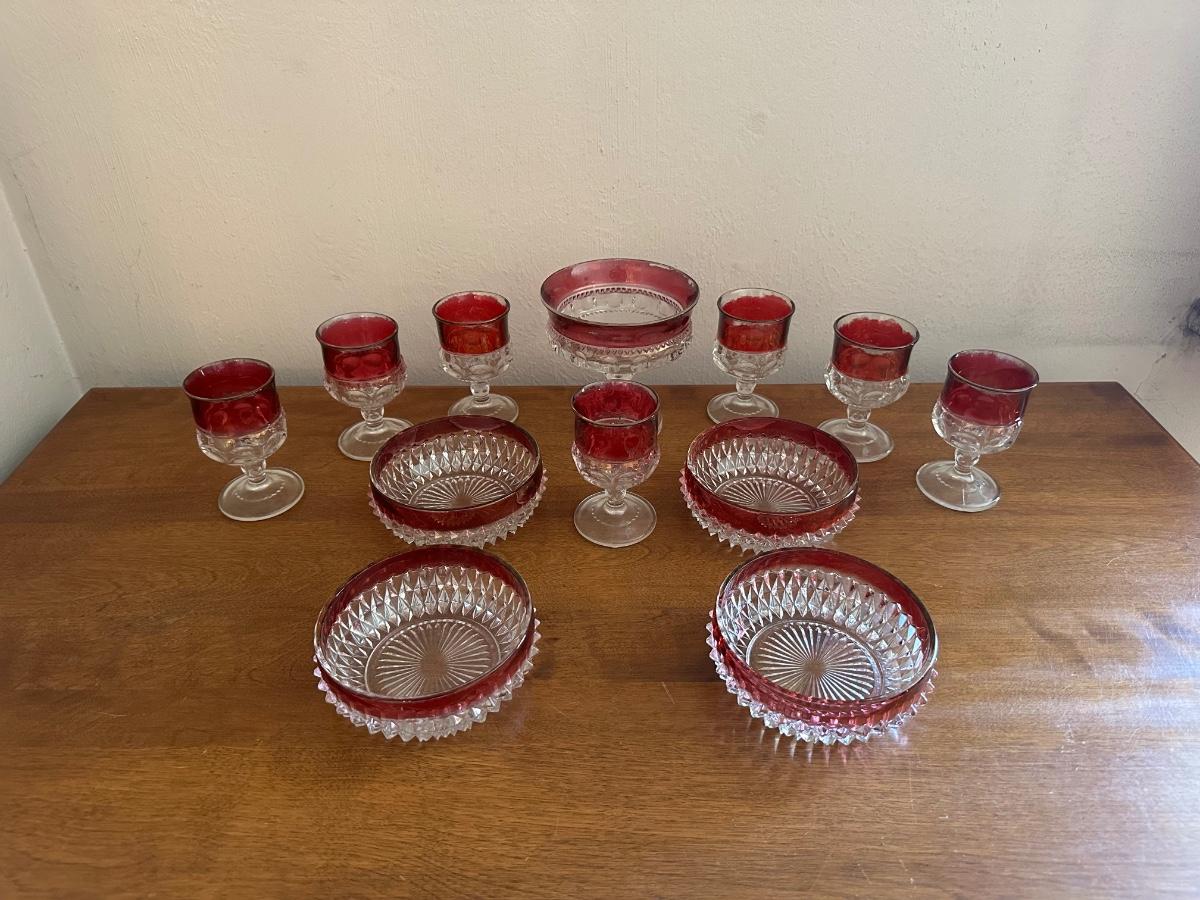 INDIANA GLASS RUBY RED FLASH DIAMOND POINT BOWLS, TIFFIN KING'S CROWN FOOTED WINE GLASSES & MATCHING COMPOTE