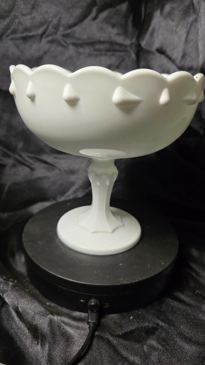 Some table pieces never lose their place in style, and this Indiana Glass milk glass compote is one of them. Its bright white finish carries that unmistakable mid-century glow, clean and luminous, bringing an instant sense of polish to any surface it touches. The softly scalloped rim frames the bowl with gentle curves that feel elegant without excess, creating a silhouette that has remained beloved across generations of collectors.
