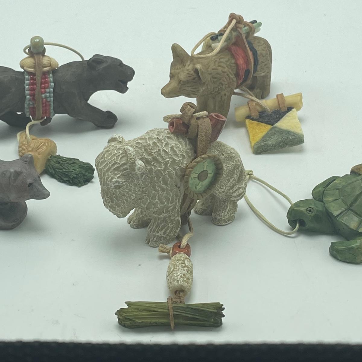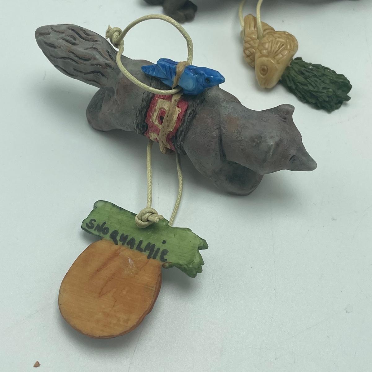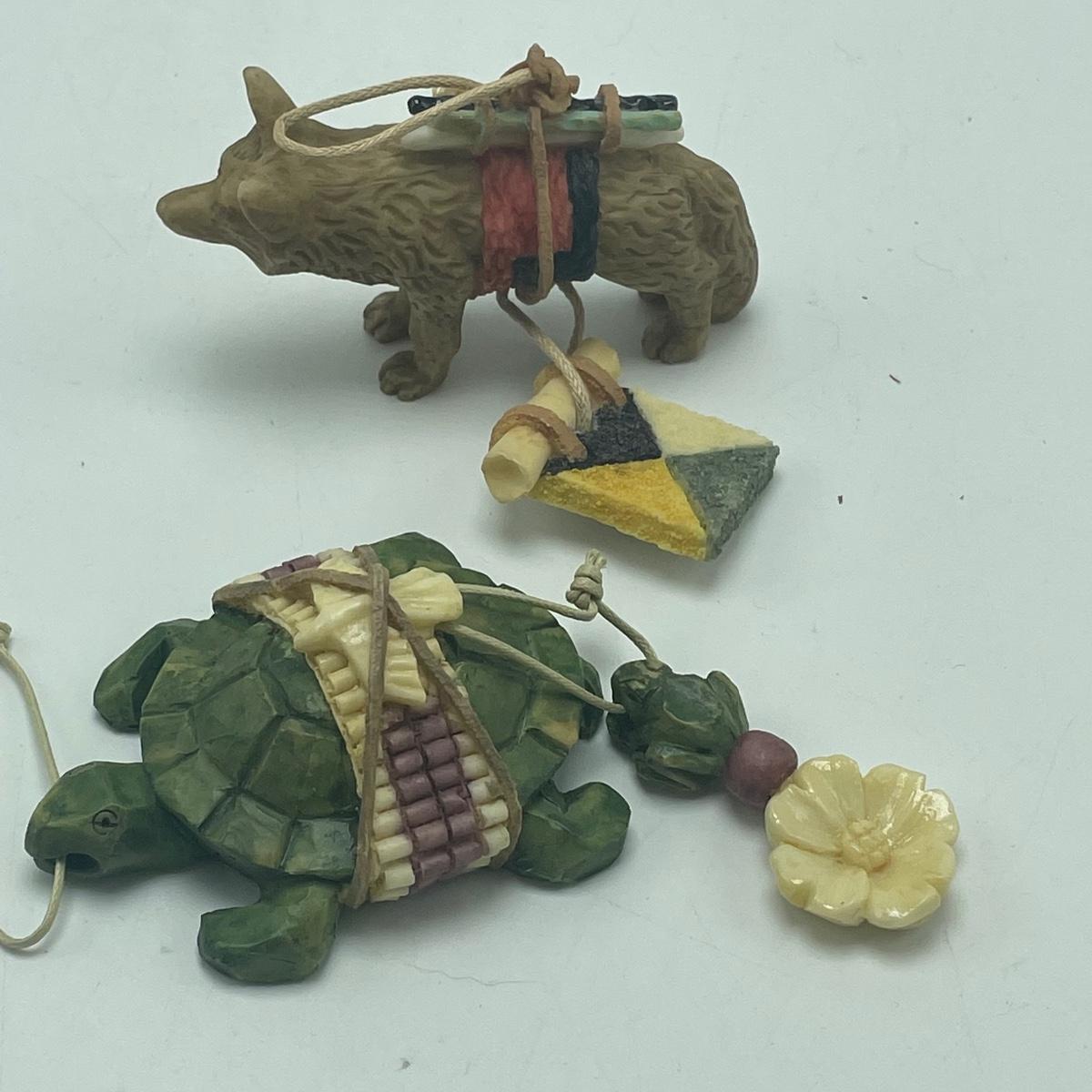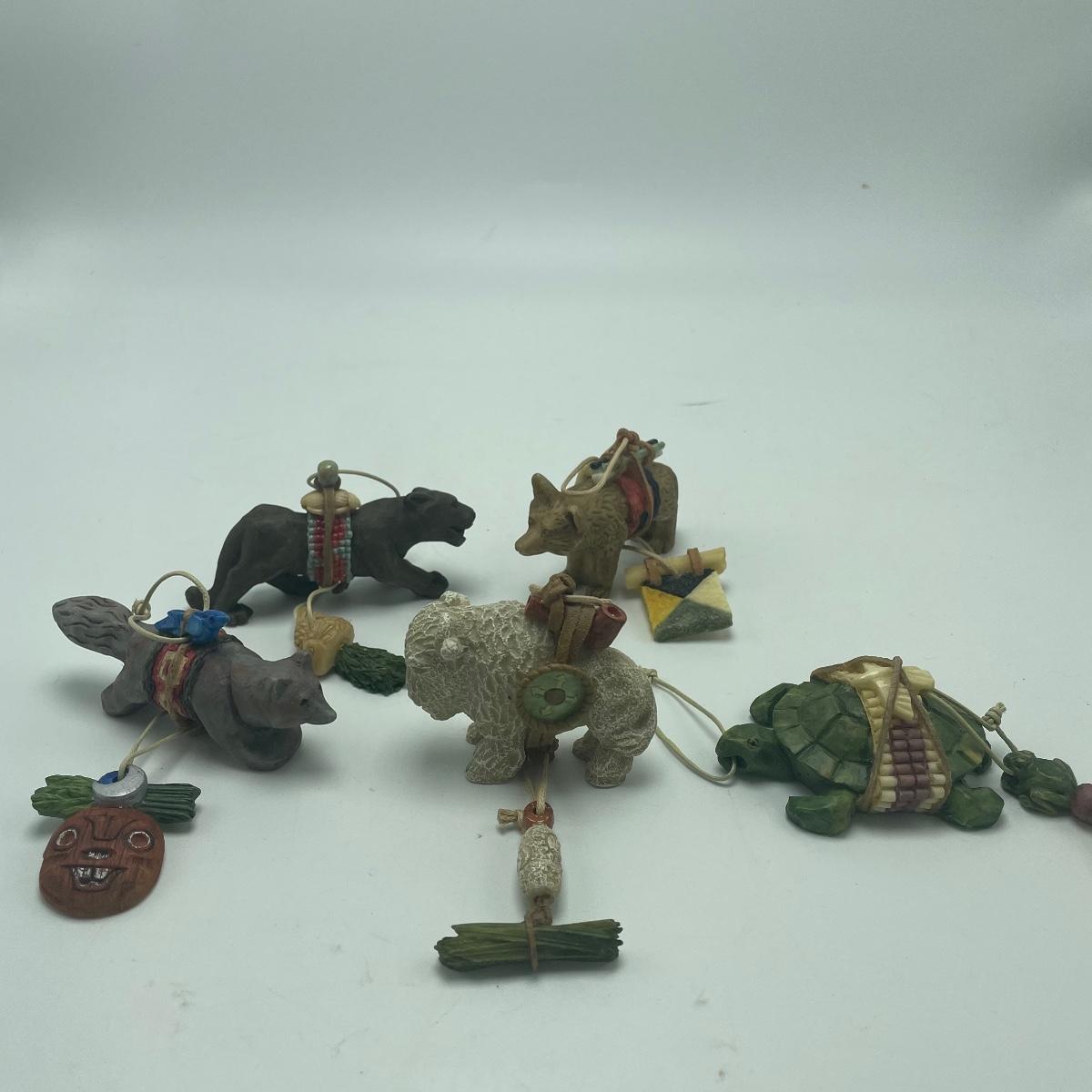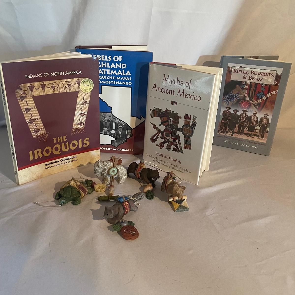 Five hanging figurines here that have been hand labeled and one has the name SNO RHALMIE; they are a lightweight possibly resin material with exquisite detailing. Also included are three books.