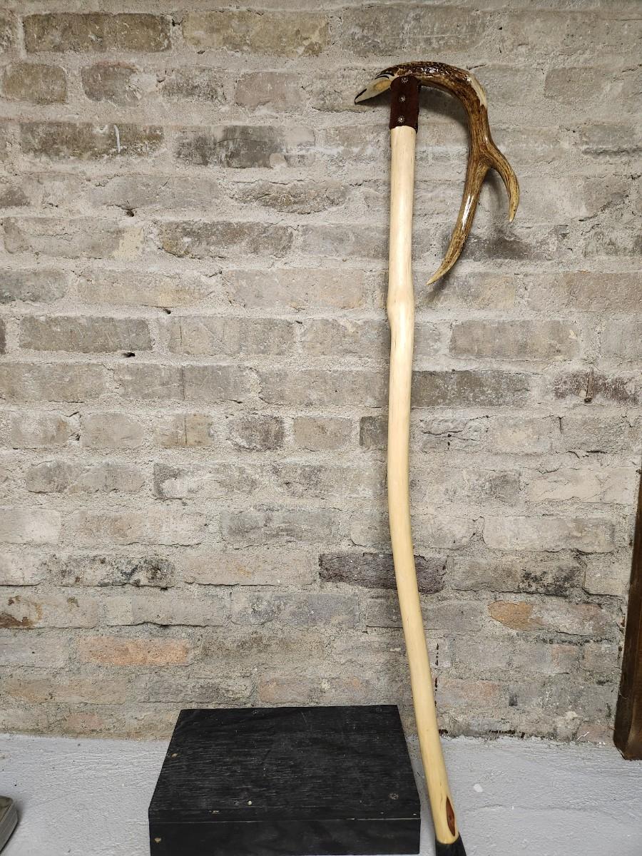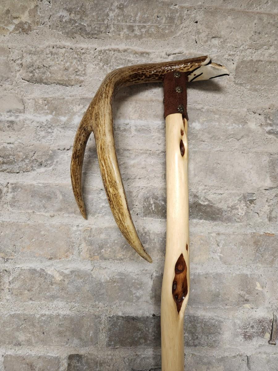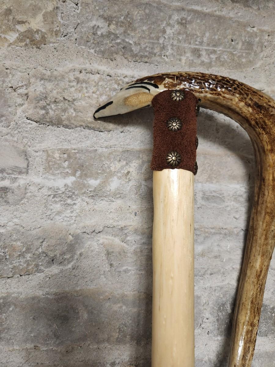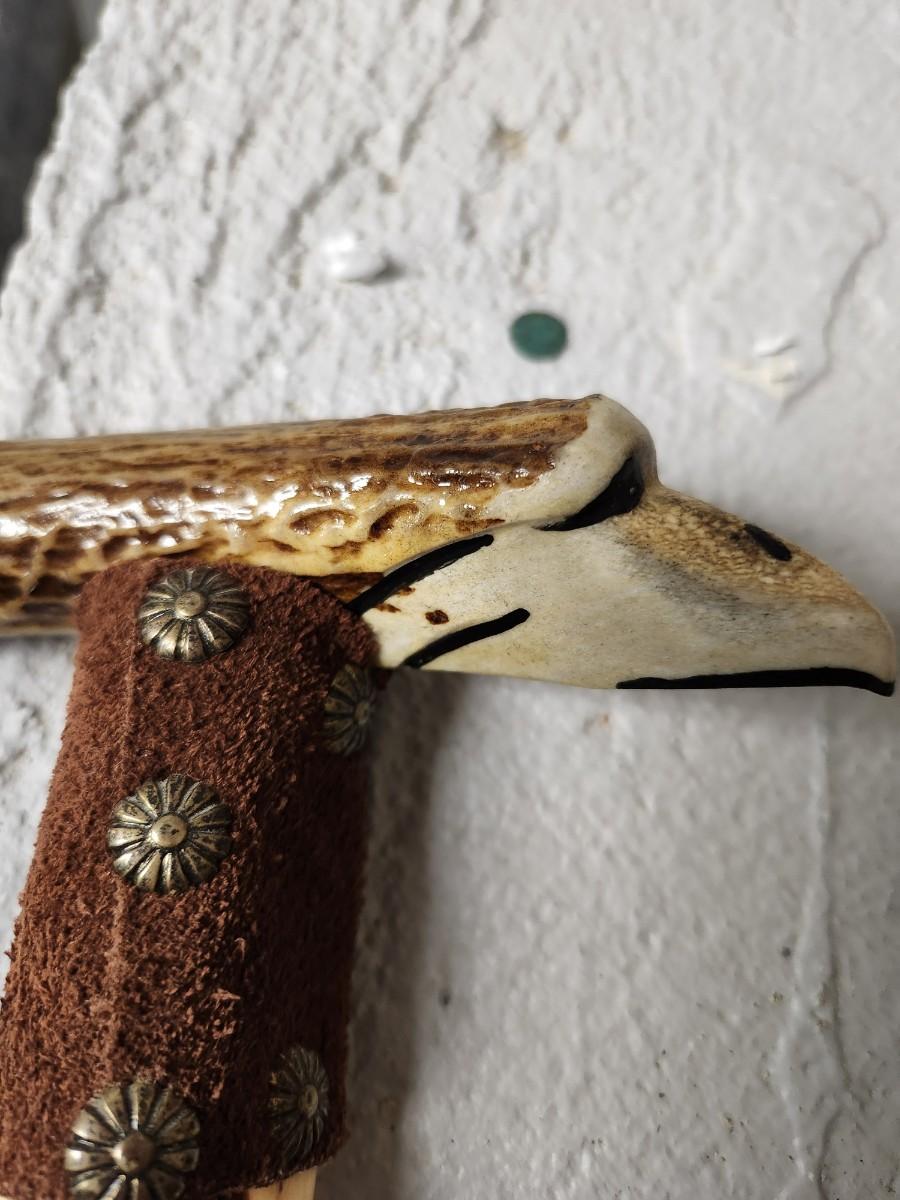Awesome carved antler handled birch cane. The antler is carved with an eagle head and wrapped with suede.
