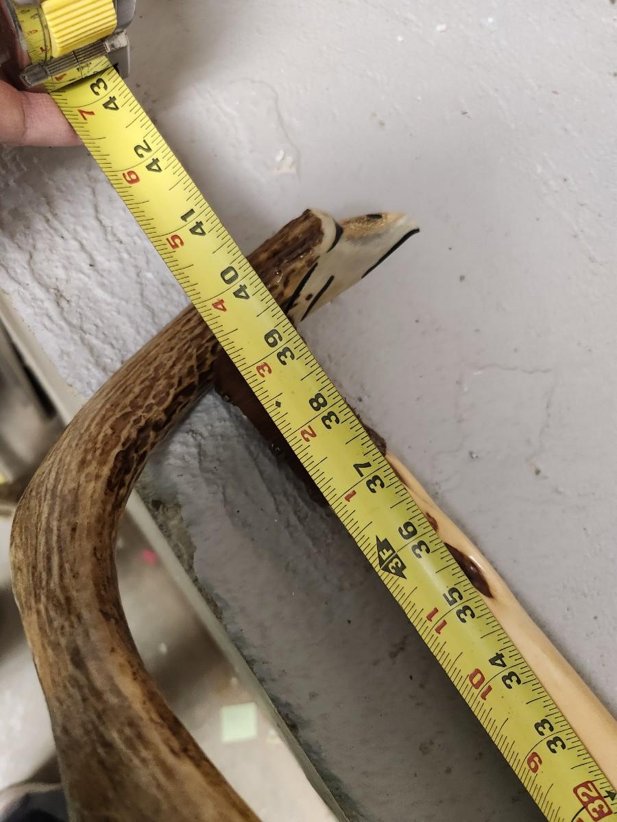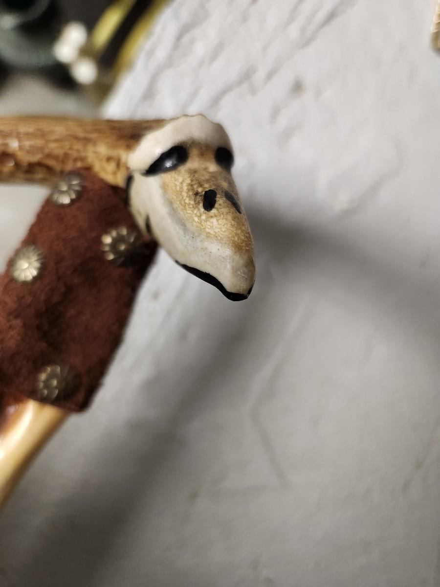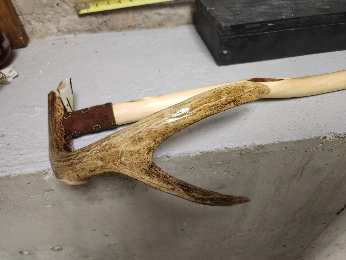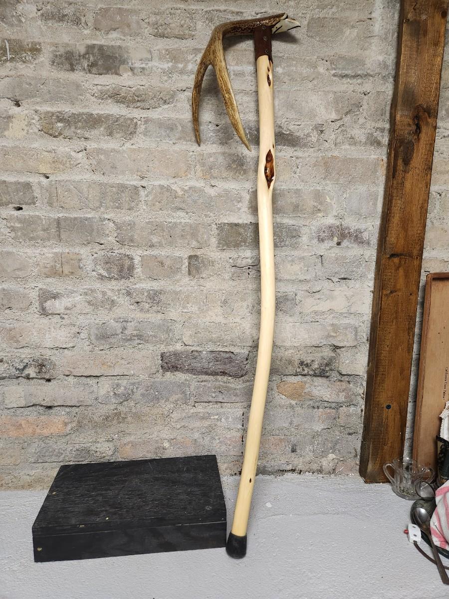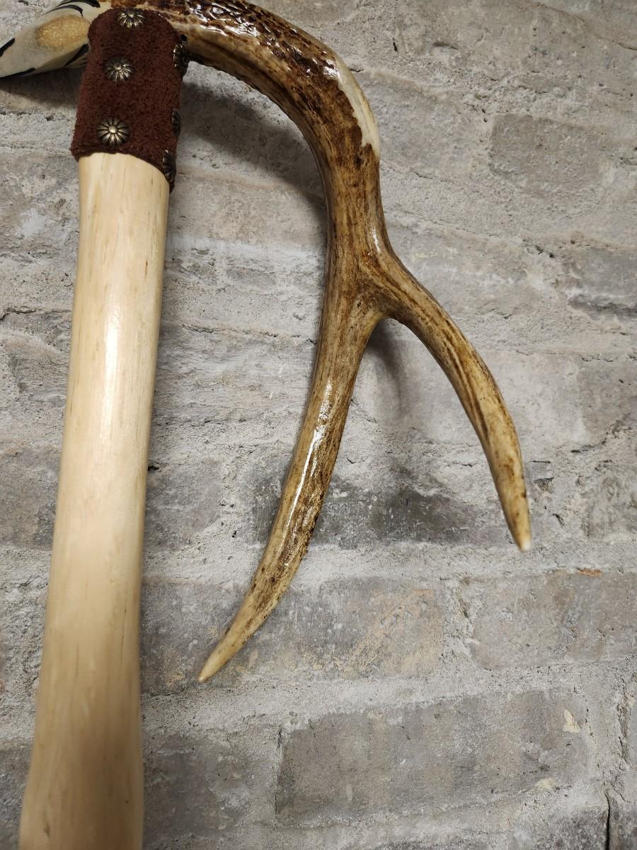Awesome carved antler handled birch cane. The antler is carved with an eagle head and wrapped with suede.