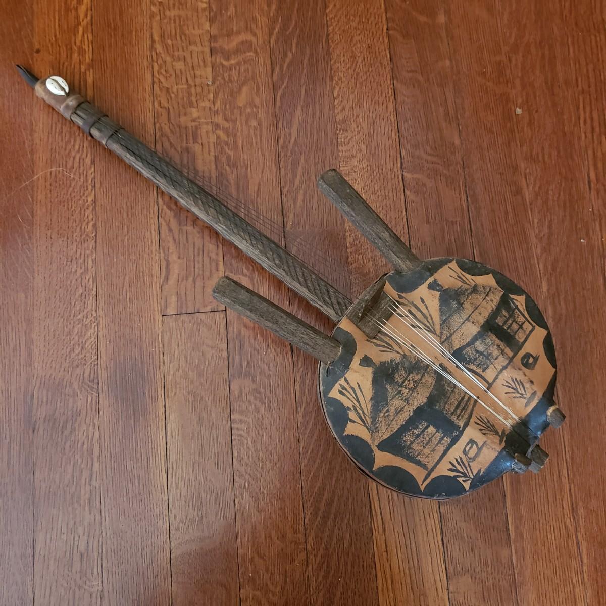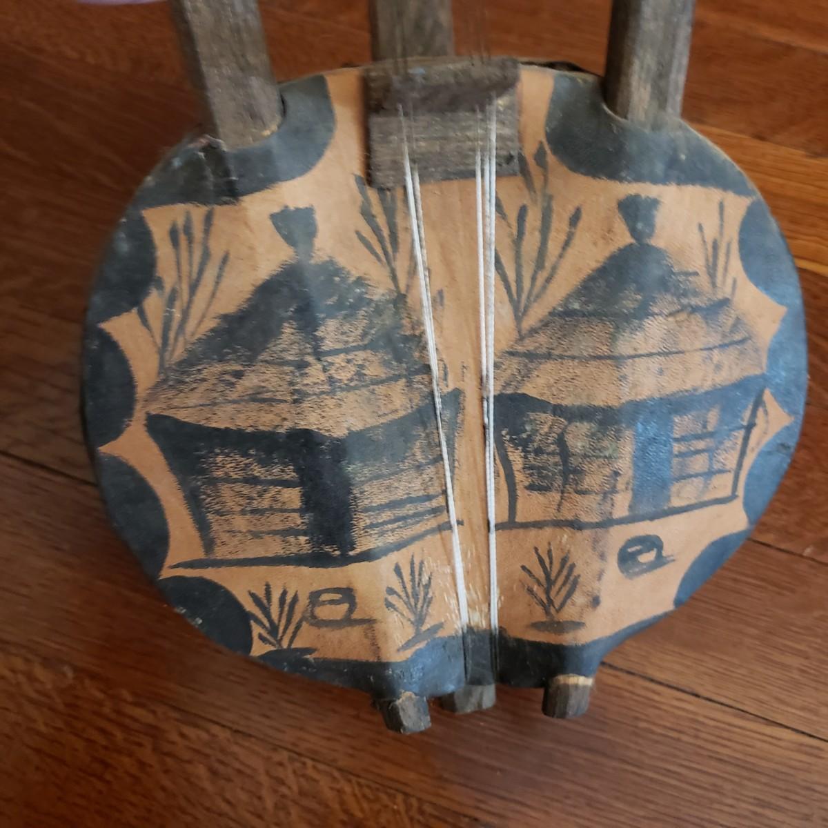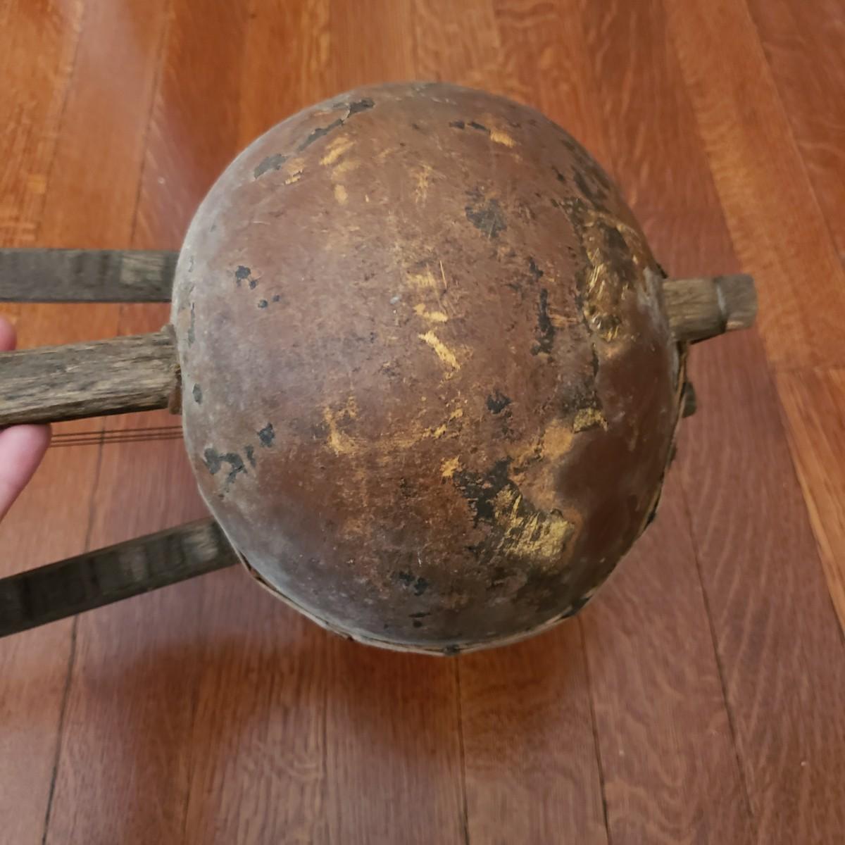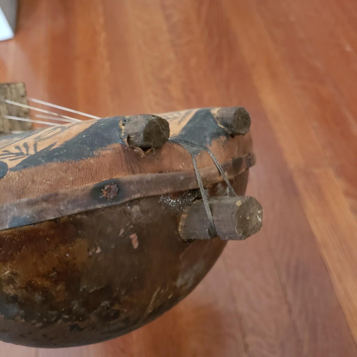This handcrafted musical instrument appears to be a gourd covered in a leather like cloth tacked on with nails. The neck and handles are made of solid wood. There is a leather hook at the end to hang it on the wall. This piece measures 8" x 5" x 22"H.