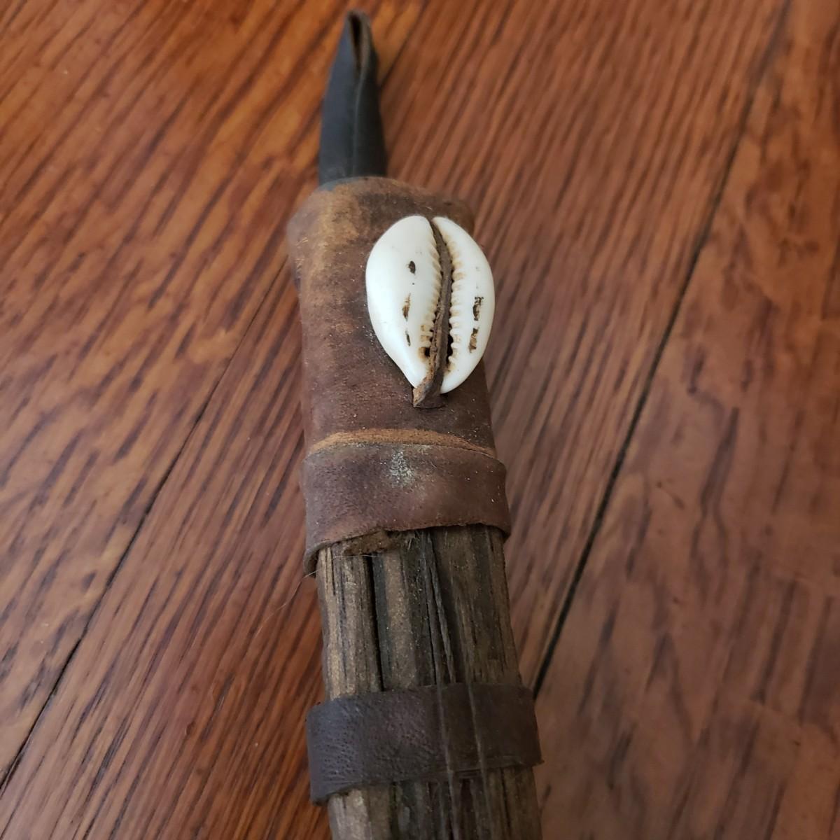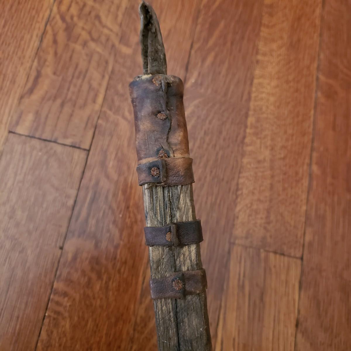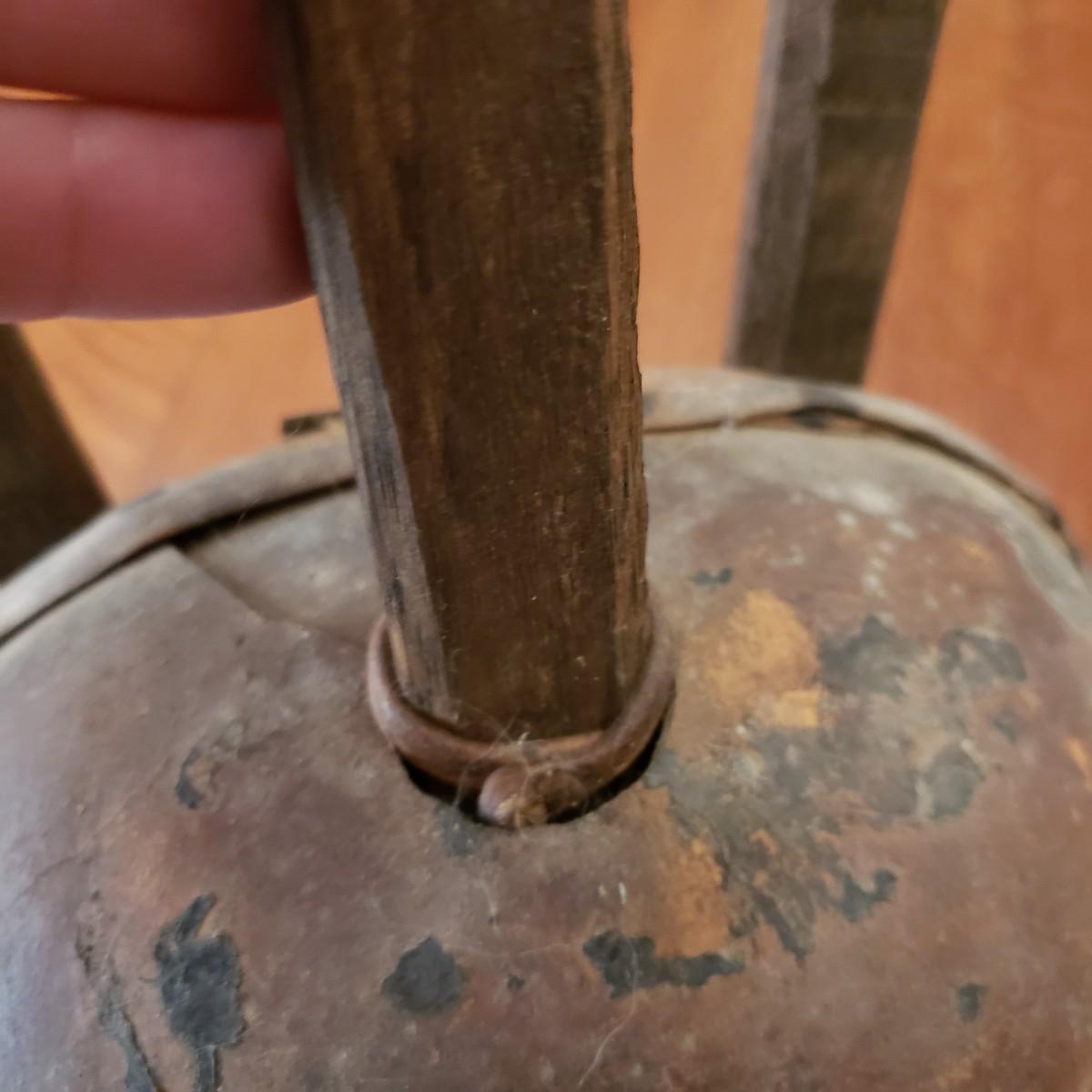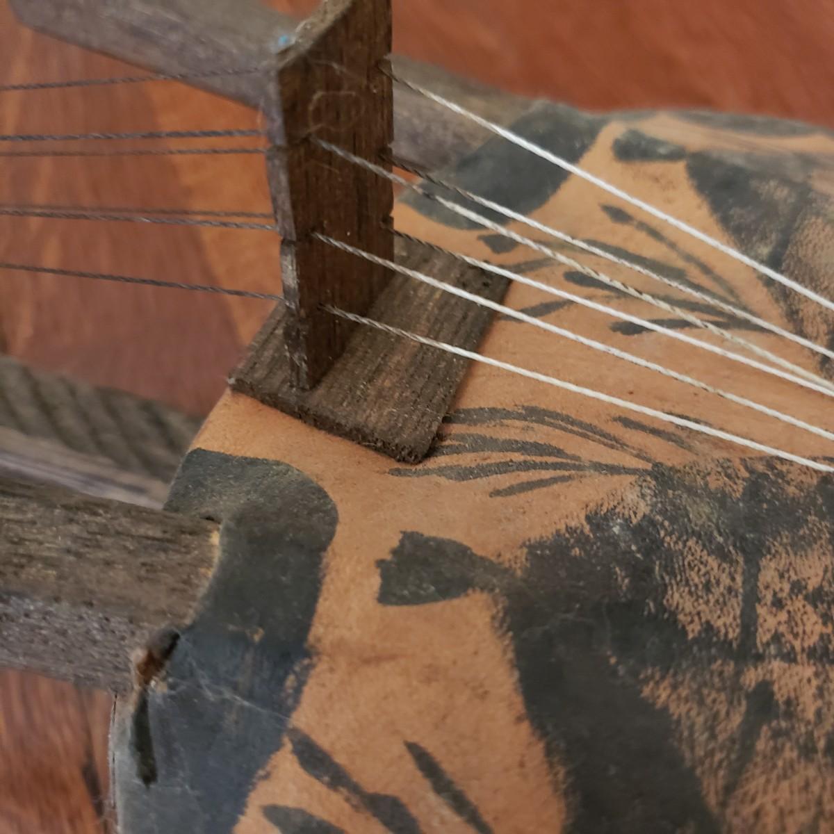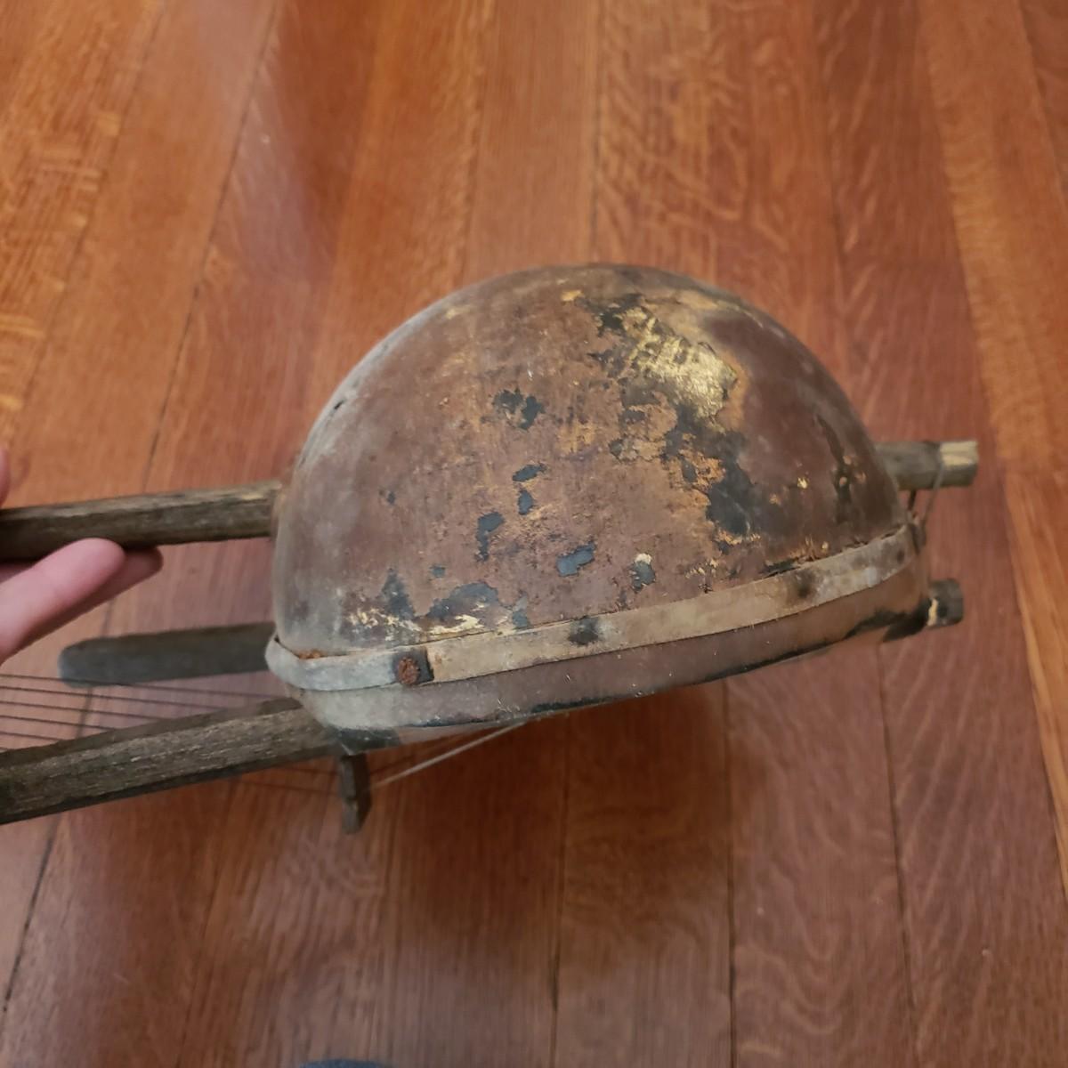 This handcrafted musical instrument appears to be a gourd covered in a leather like cloth tacked on with nails. The neck and handles are made of solid wood. There is a leather hook at the end to hang it on the wall. This piece measures 8" x 5" x 22"H.