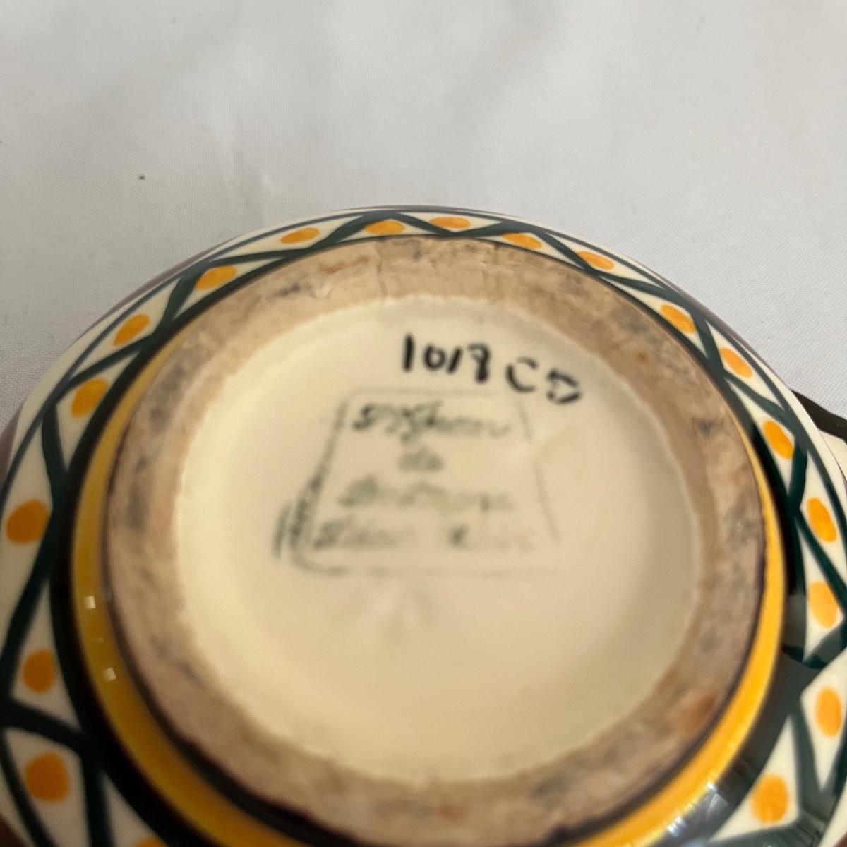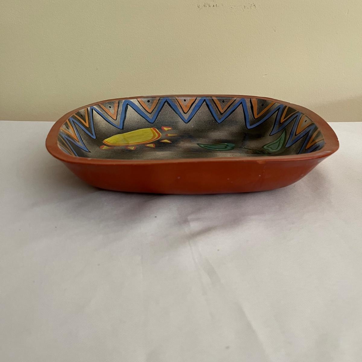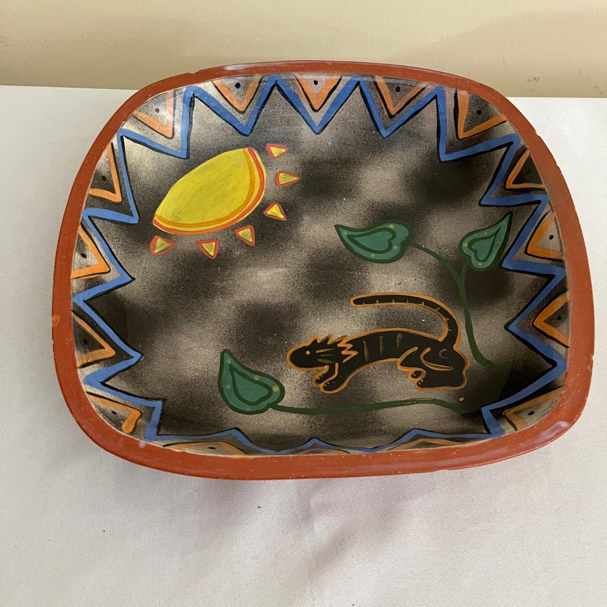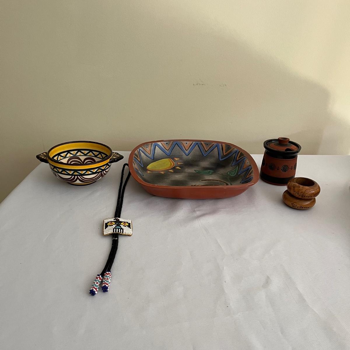 Lot includes a square shaped pottery bowl, small stamped pottery bowl, stamped pottery jar with lid that has a chip, beaded bolo tie and two wooden napkin rings. Square piece measures 10” x 10.5” x 2”.