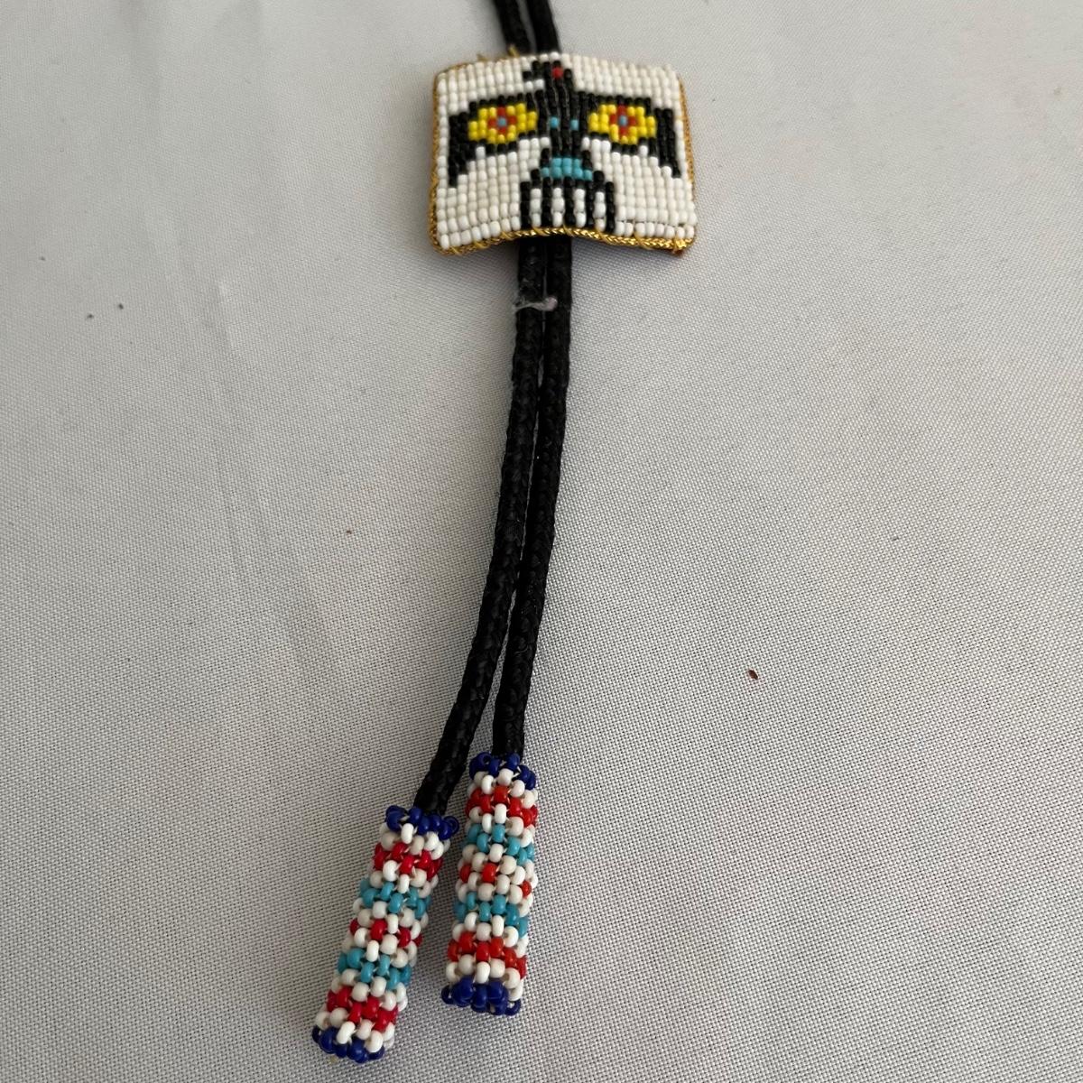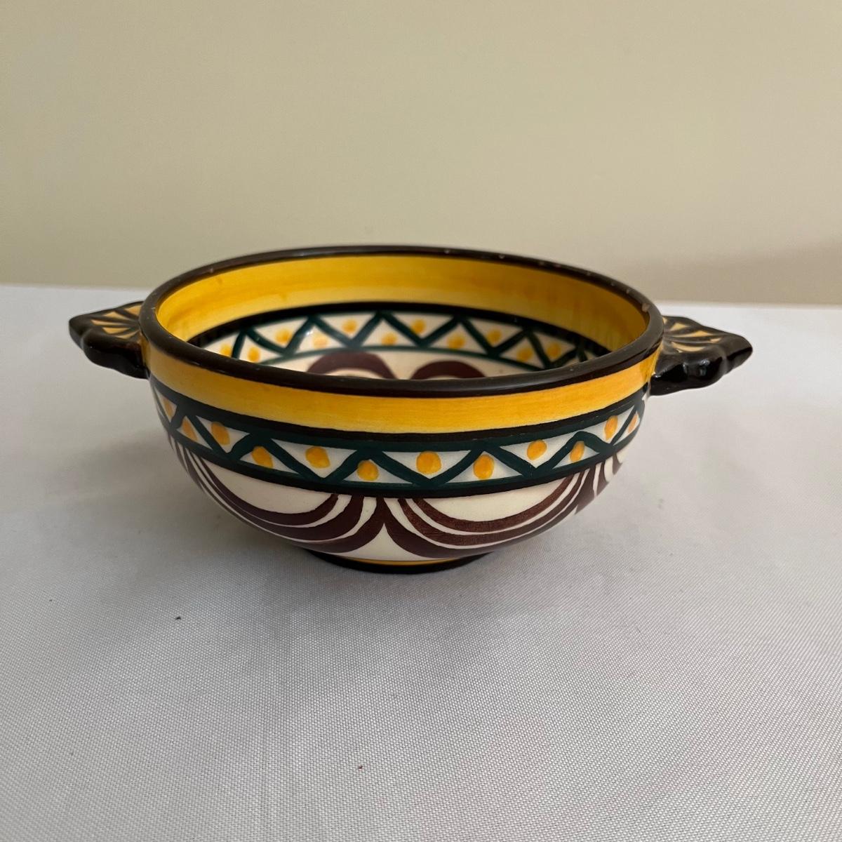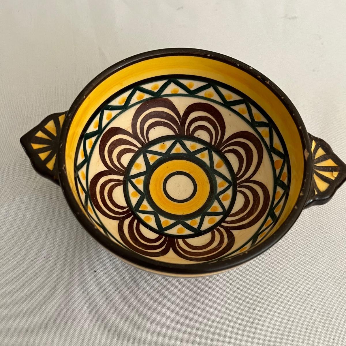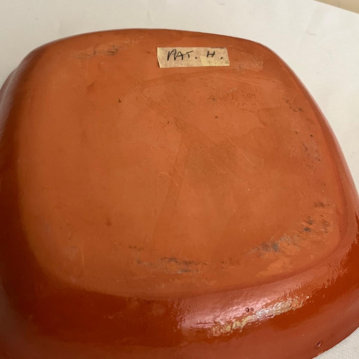 Lot includes a square shaped pottery bowl, small stamped pottery bowl, stamped pottery jar with lid that has a chip, beaded bolo tie and two wooden napkin rings. Square piece measures 10” x 10.5” x 2”.