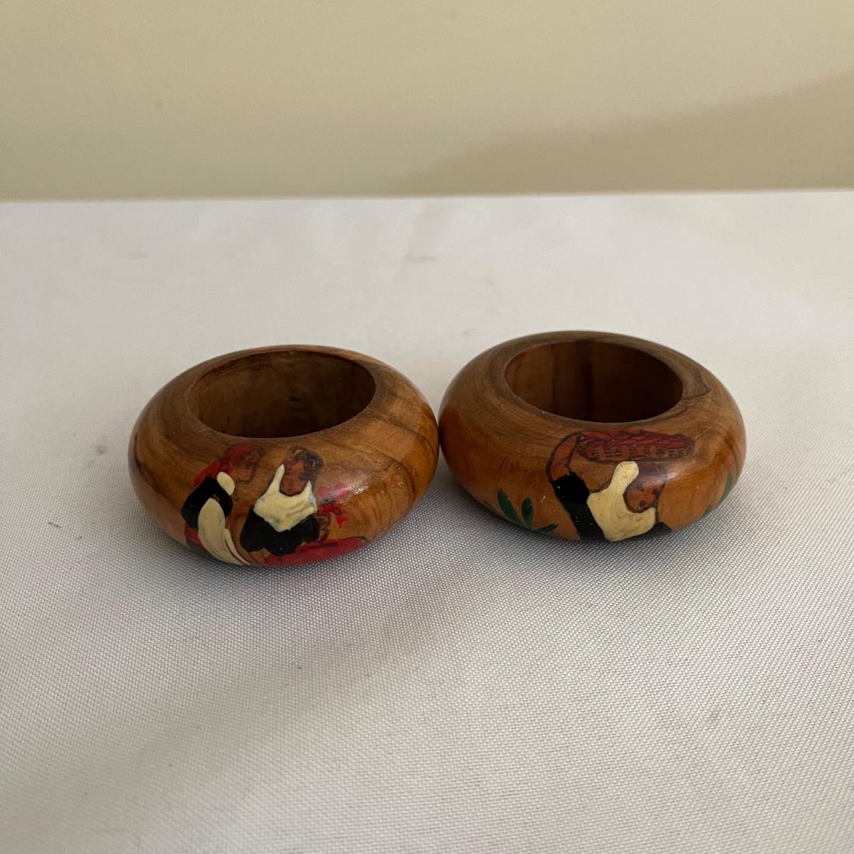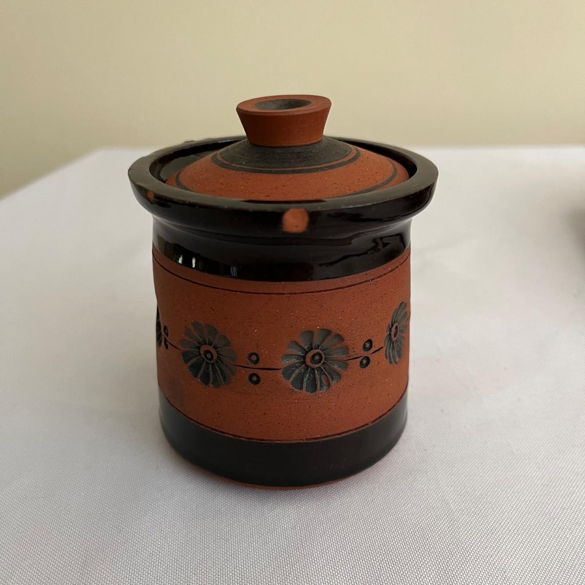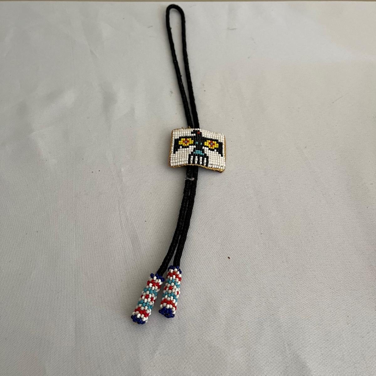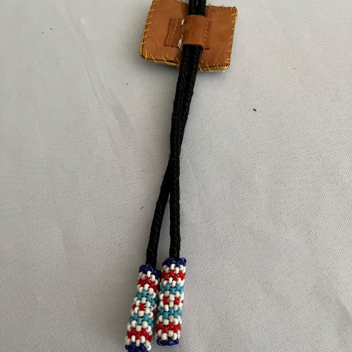 Lot includes a square shaped pottery bowl, small stamped pottery bowl, stamped pottery jar with lid that has a chip, beaded bolo tie and two wooden napkin rings. Square piece measures 10” x 10.5” x 2”.