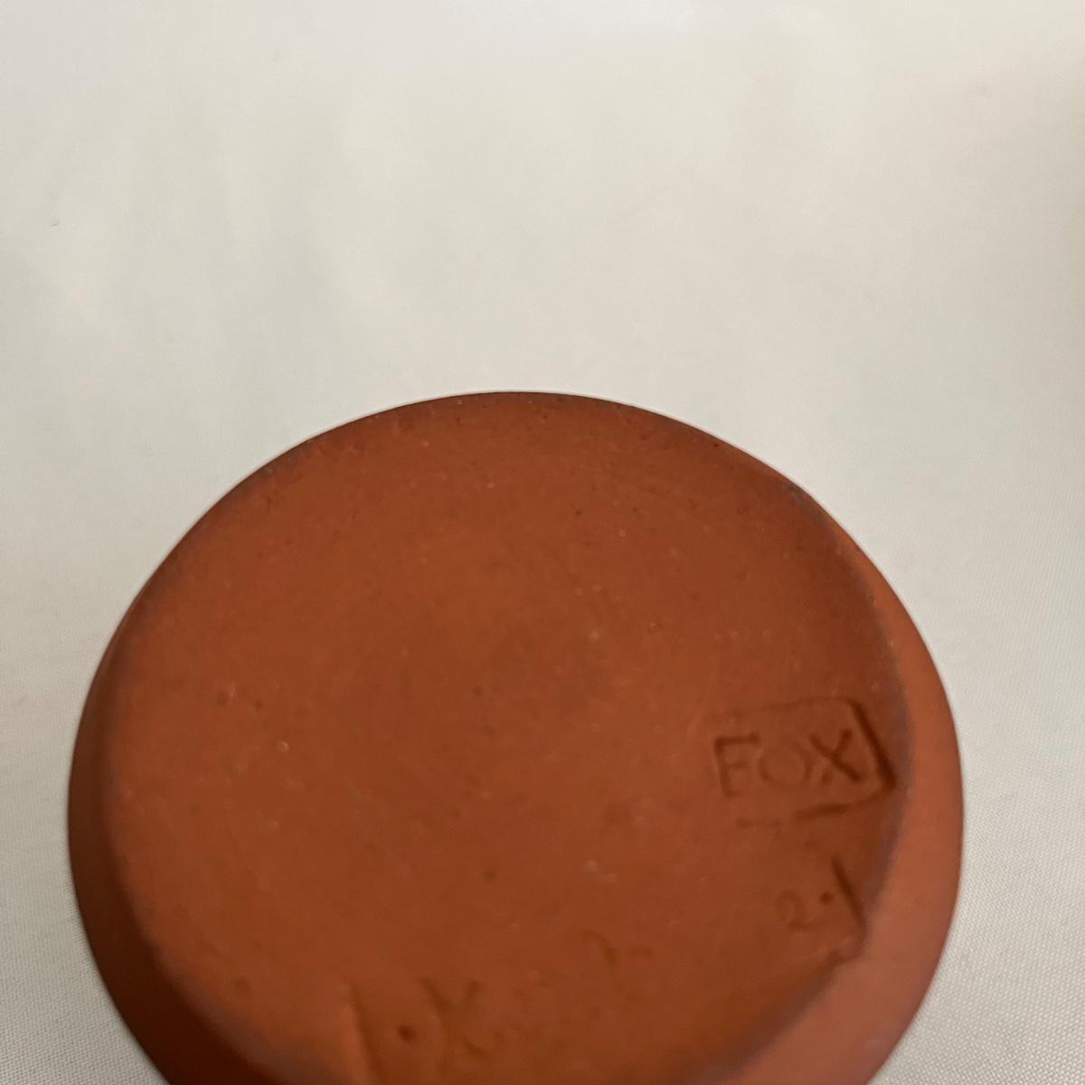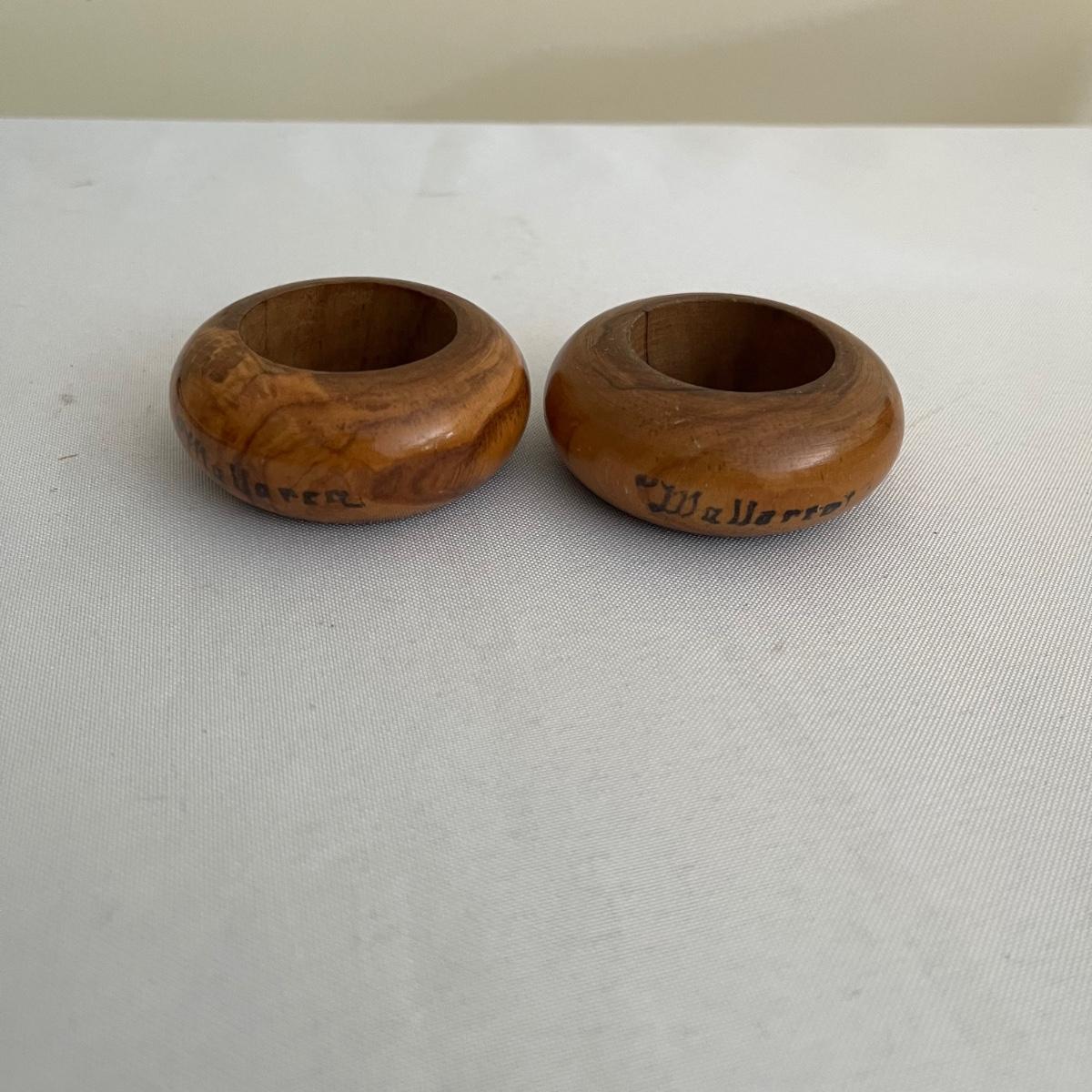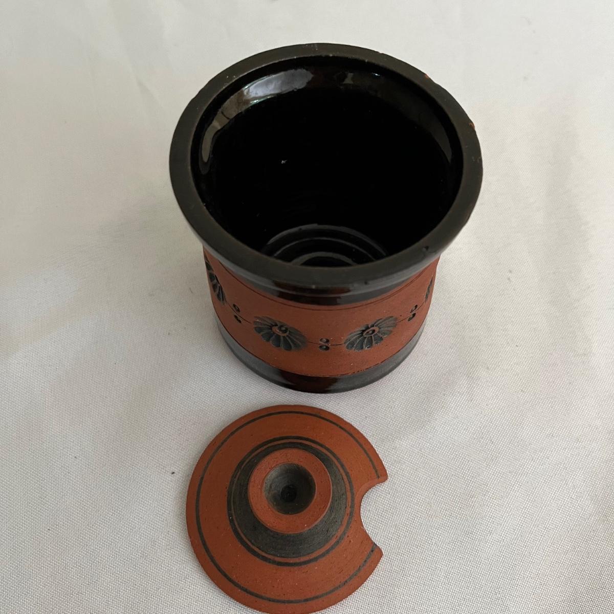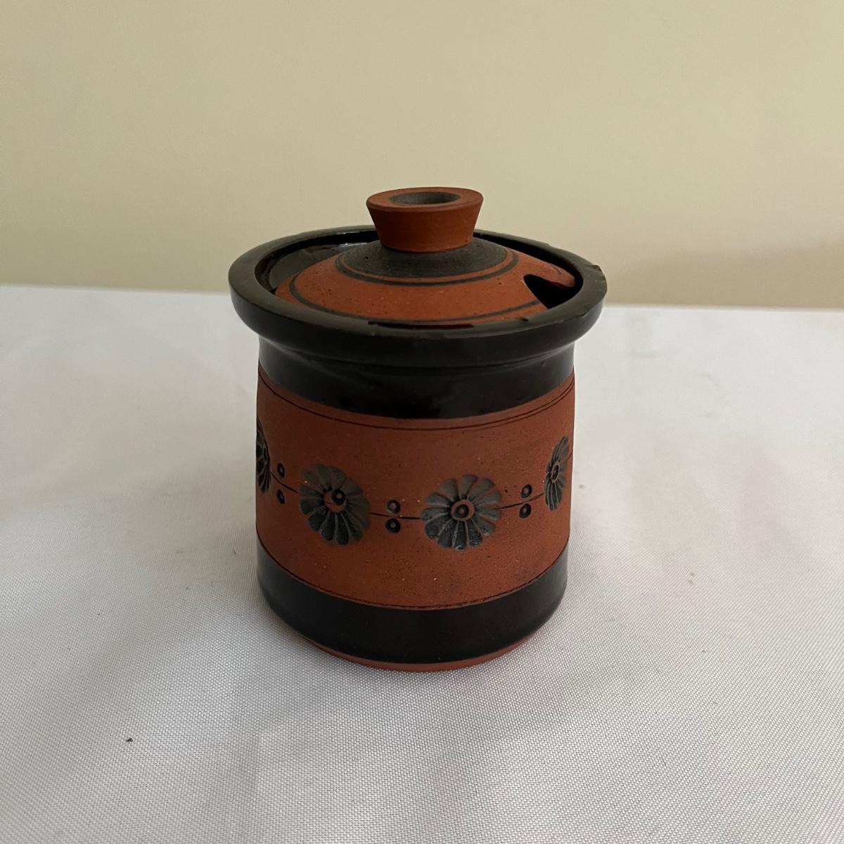 Lot includes a square shaped pottery bowl, small stamped pottery bowl, stamped pottery jar with lid that has a chip, beaded bolo tie and two wooden napkin rings. Square piece measures 10” x 10.5” x 2”.