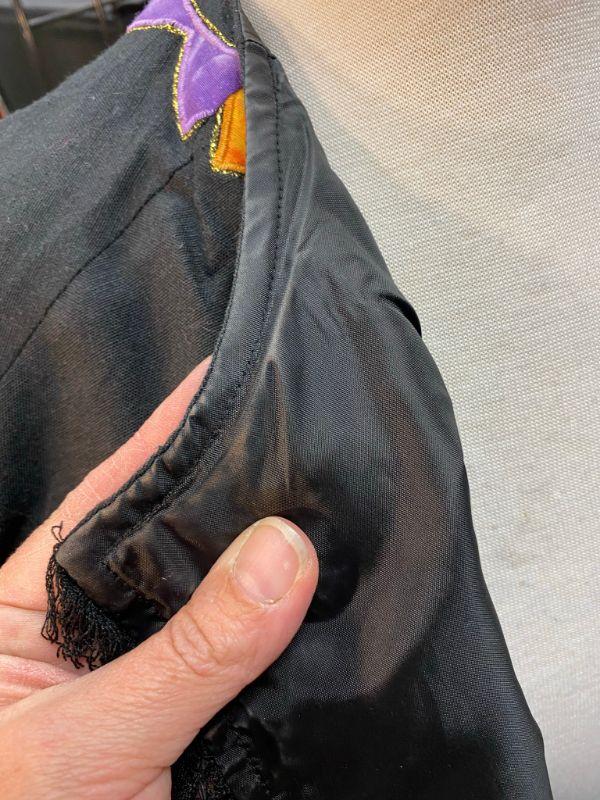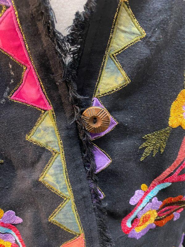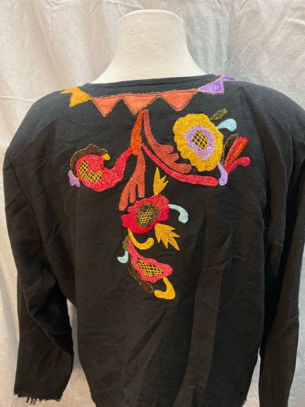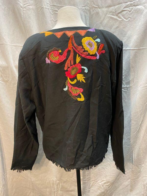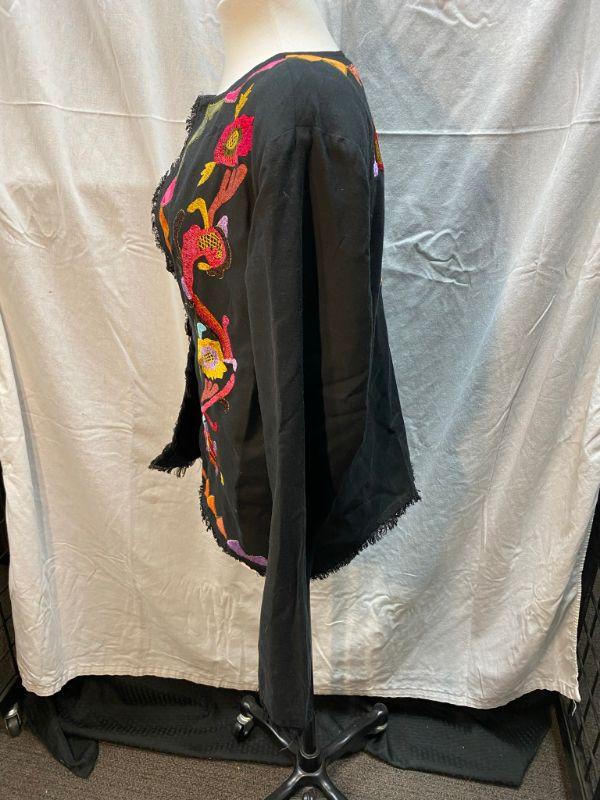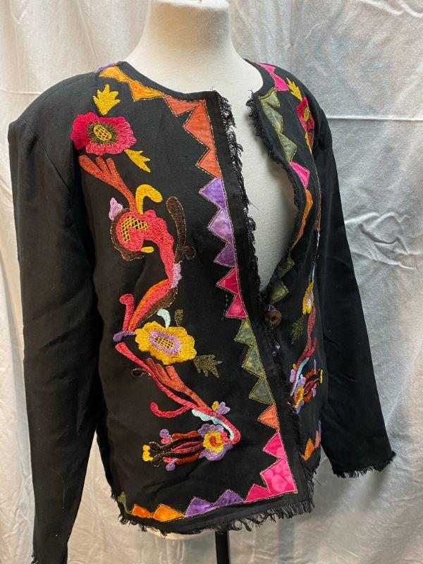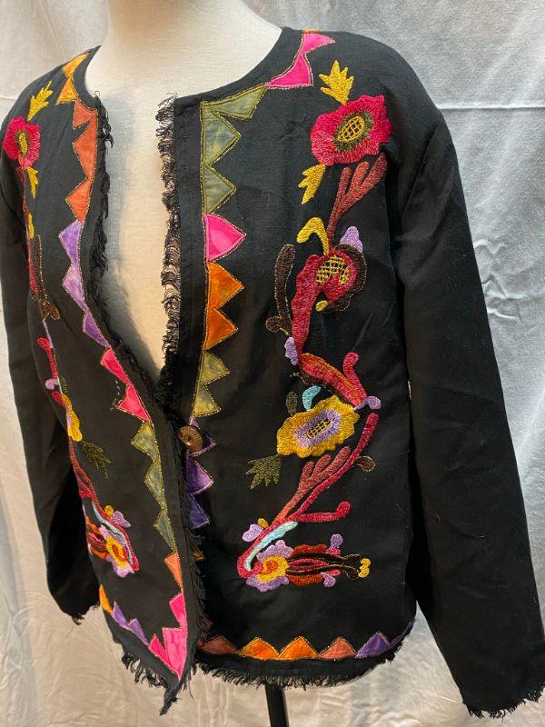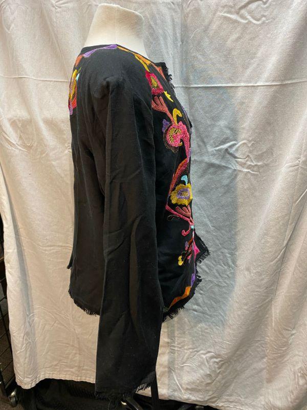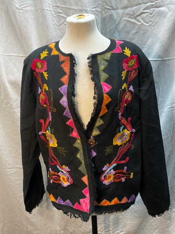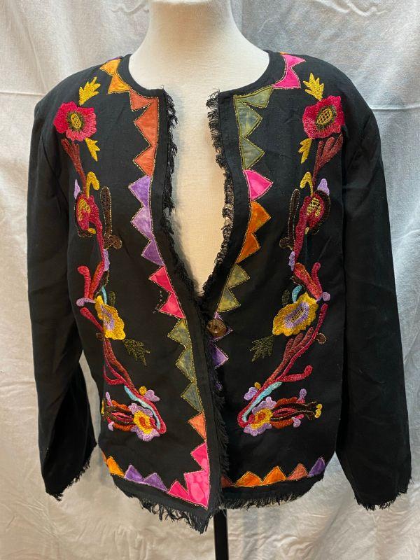 Indigo Moon black fringe edge coat. Embellished with Colorful embroidered patchwork designs. Single button closure. Small spot of makeup under the collar edge. Size Large.