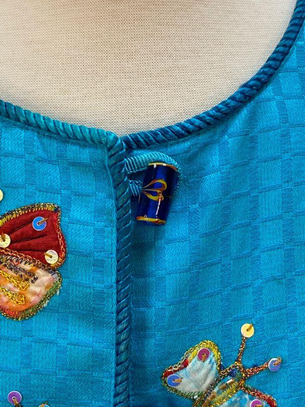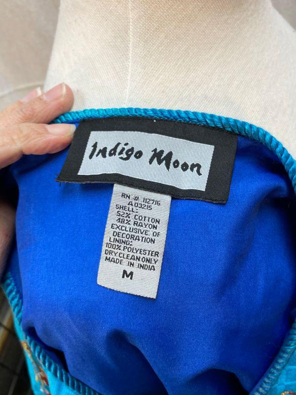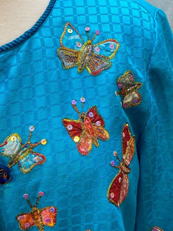 Indigo Moon bright blue jacket. Has butterfly applique embellishments all over. Glass beads for buttons. Good condition. Size medium.
