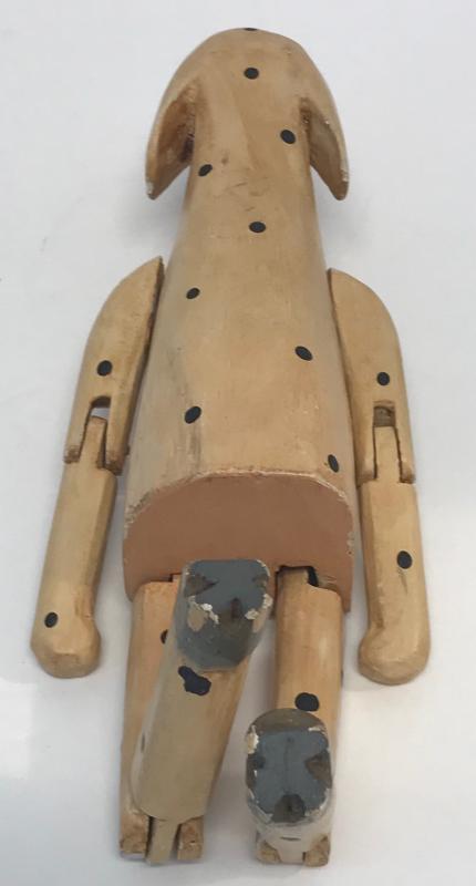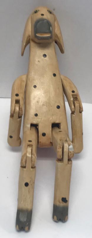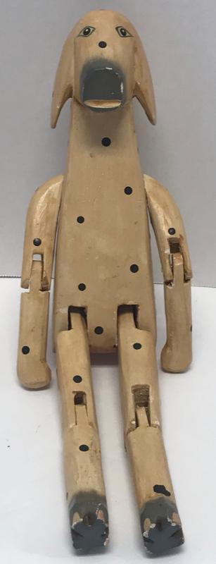 Description: Indonesian Balikraft wood artisans Beige & Black spotted Dog decorative puppet figurine. Measurement approximate: 11.5 H X 3.5 W X 2 D. Material: Wood. Shipping cost $17 Excluding California, Alaska & Hawaii. This Item has a reserve price.