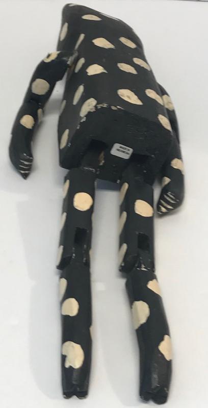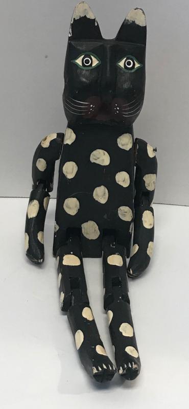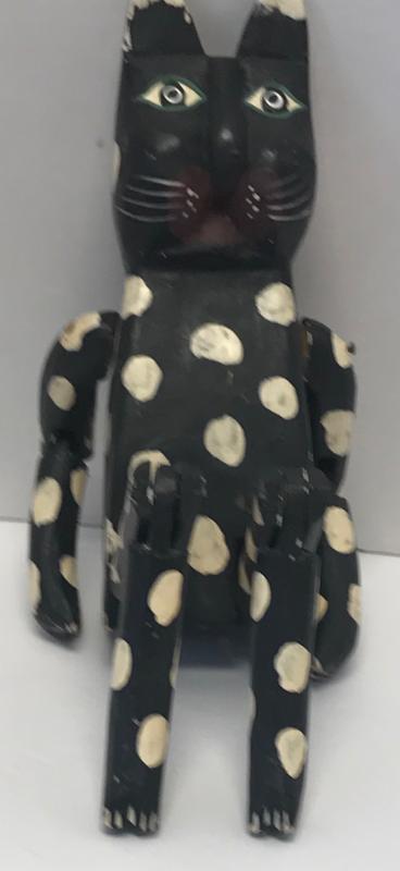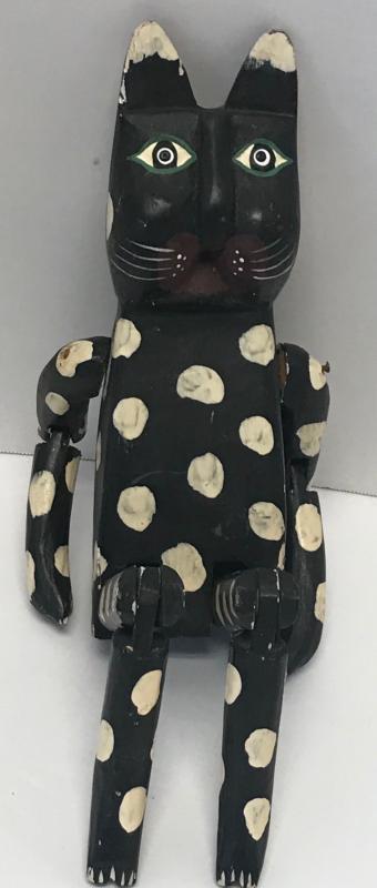 Description: Indonesian Balikraft wood artisans Black & White spotted Cat decorative puppet. Measurement approximate: 13.25 H X 5 W X 2.5 D. Material: Wood. Shipping cost: $17 Excluding California, Alaska & Hawaii. This Item has a reserve price.