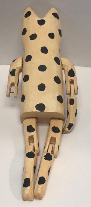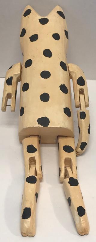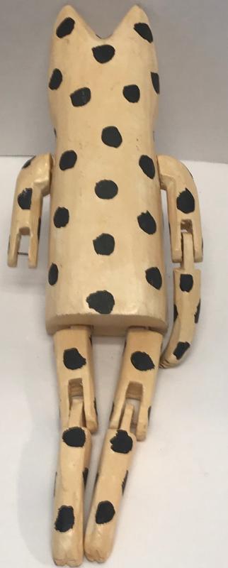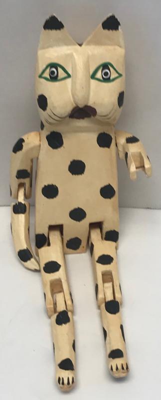 Description: Indonesian Balikraft wood artisans Ivory & Black spotted Cat decorative puppet figurine. Missing hand, Measurement approximate: 14 H X 4 W X 3 D. Material: Wood. Shipping cost:$ 15 Excluding California, Alaska & Hawaii.