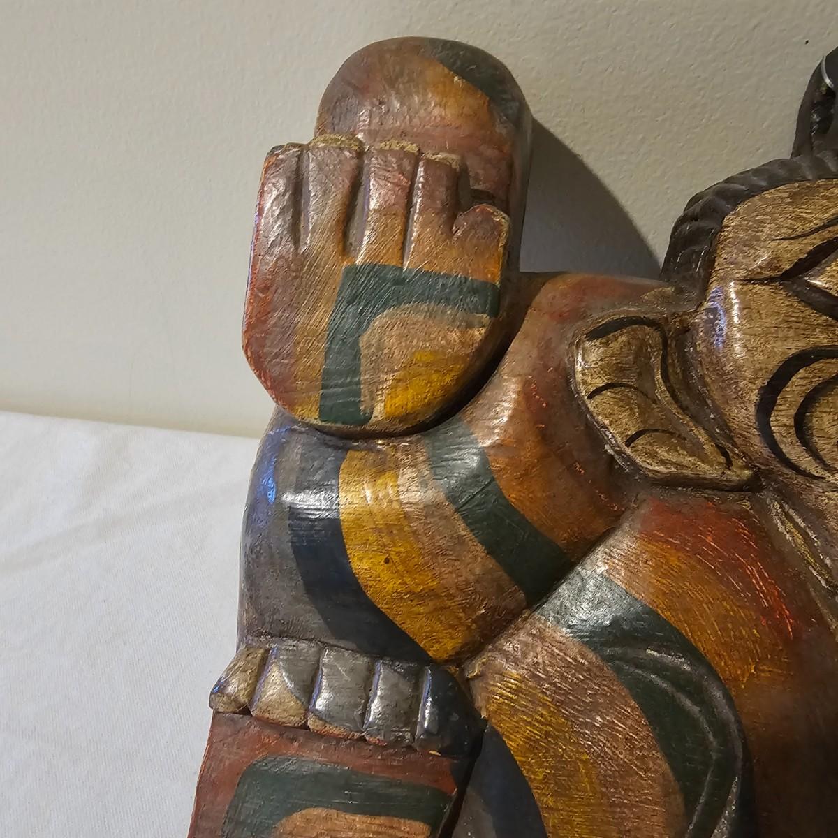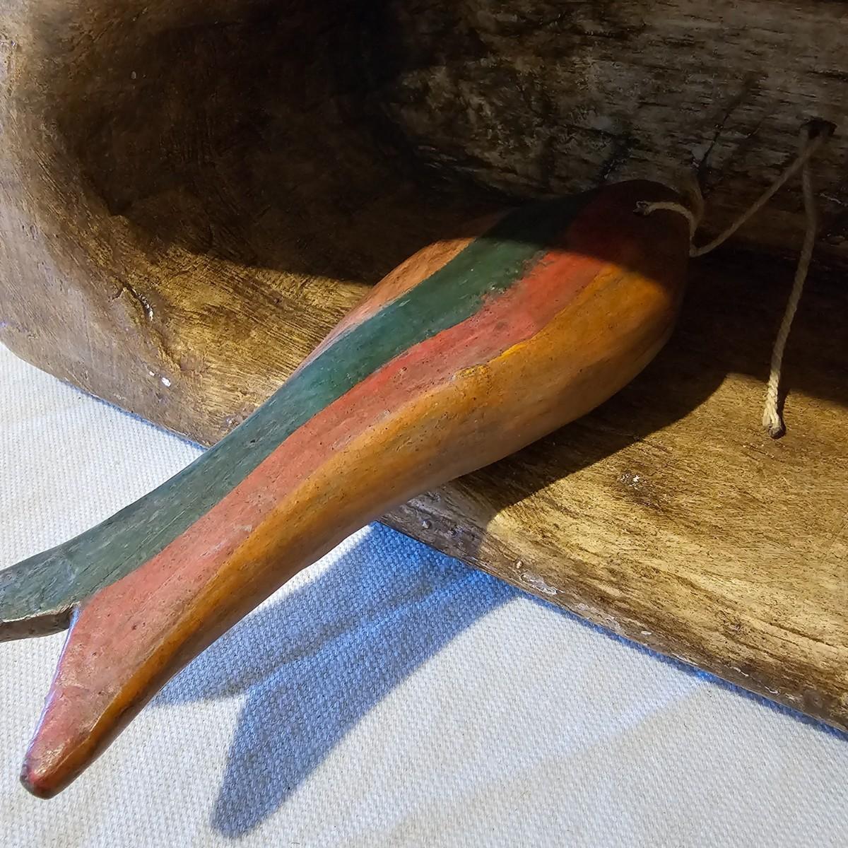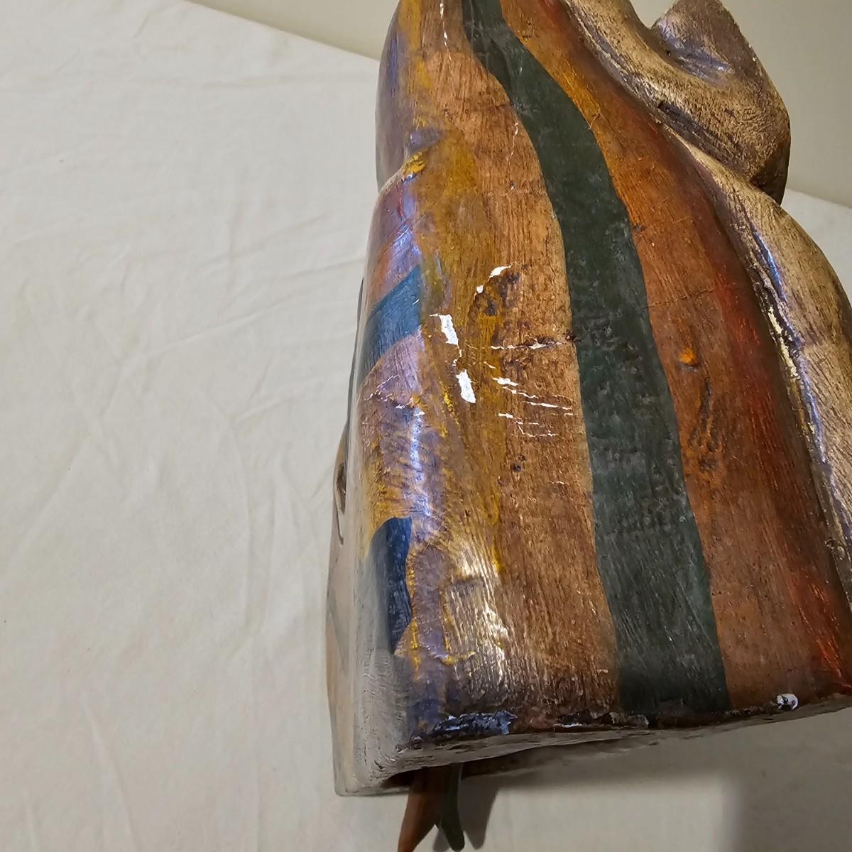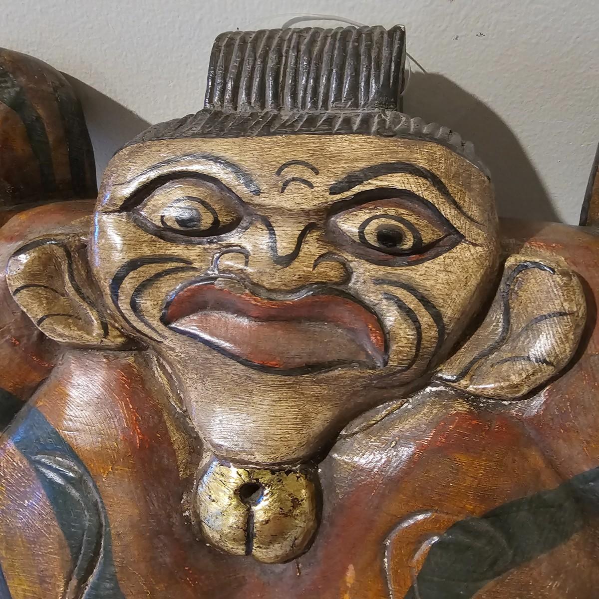 Hand carved wooden bell with Indonesian theme. Solid wood with fish shaped clapper. Bell measures 12.5" x 4.5" x 8"H. Some small scratches in paint surface. See photos for details. Shipping available.
