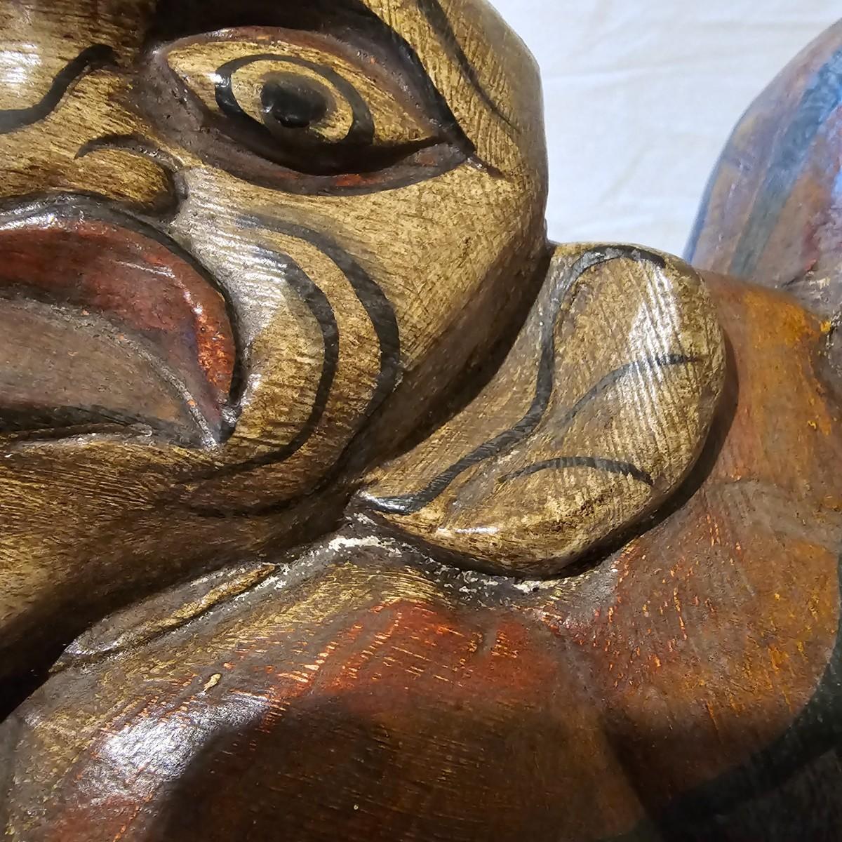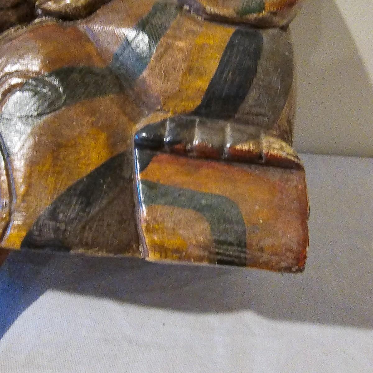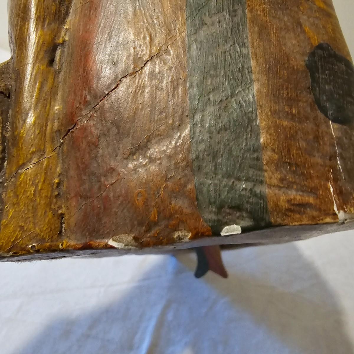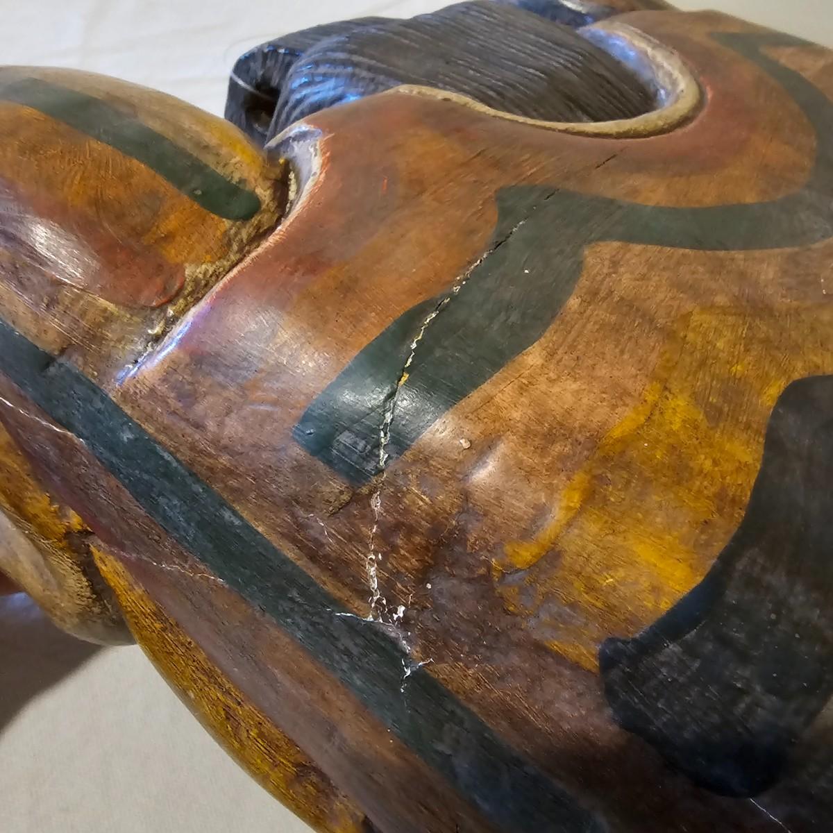 Hand carved wooden bell with Indonesian theme. Solid wood with fish shaped clapper. Bell measures 12.5" x 4.5" x 8"H. Some small scratches in paint surface. See photos for details. Shipping available.