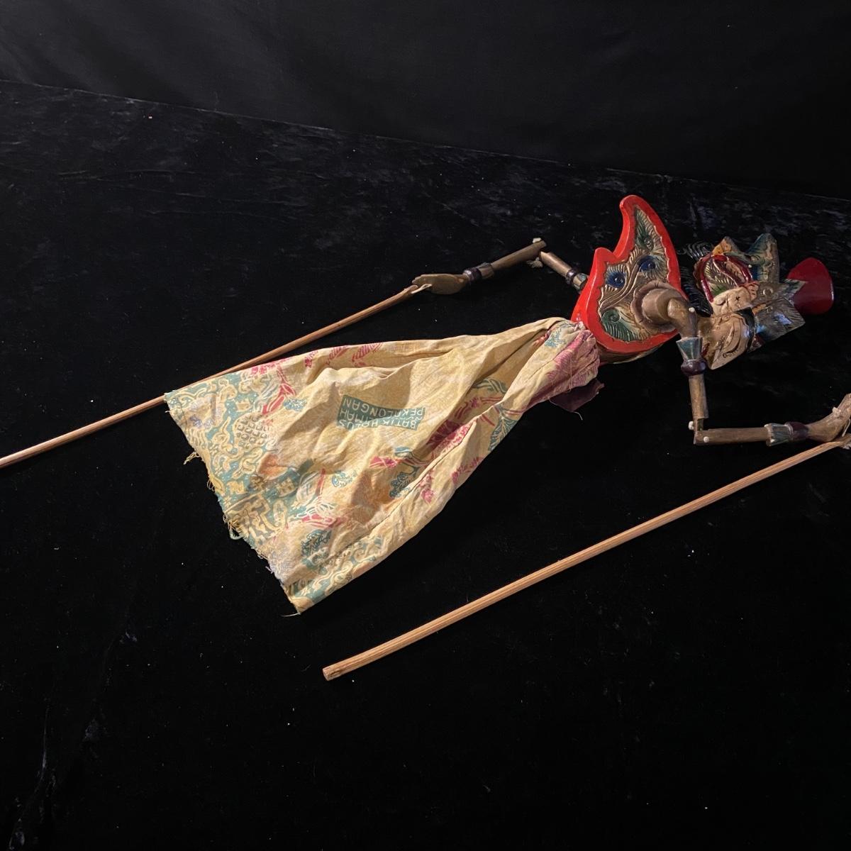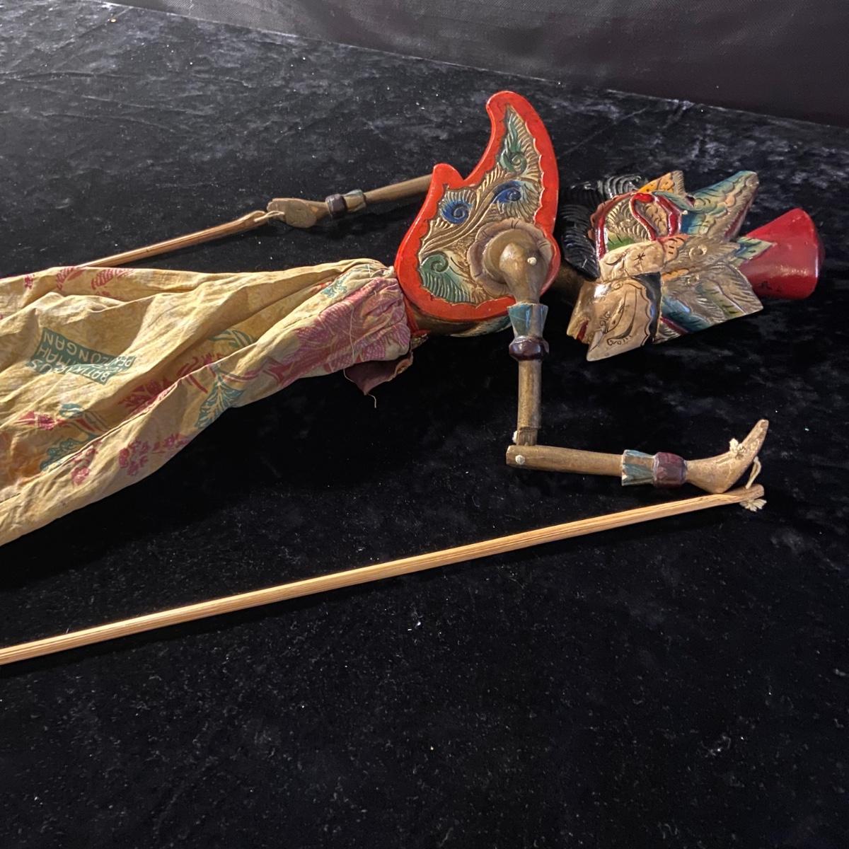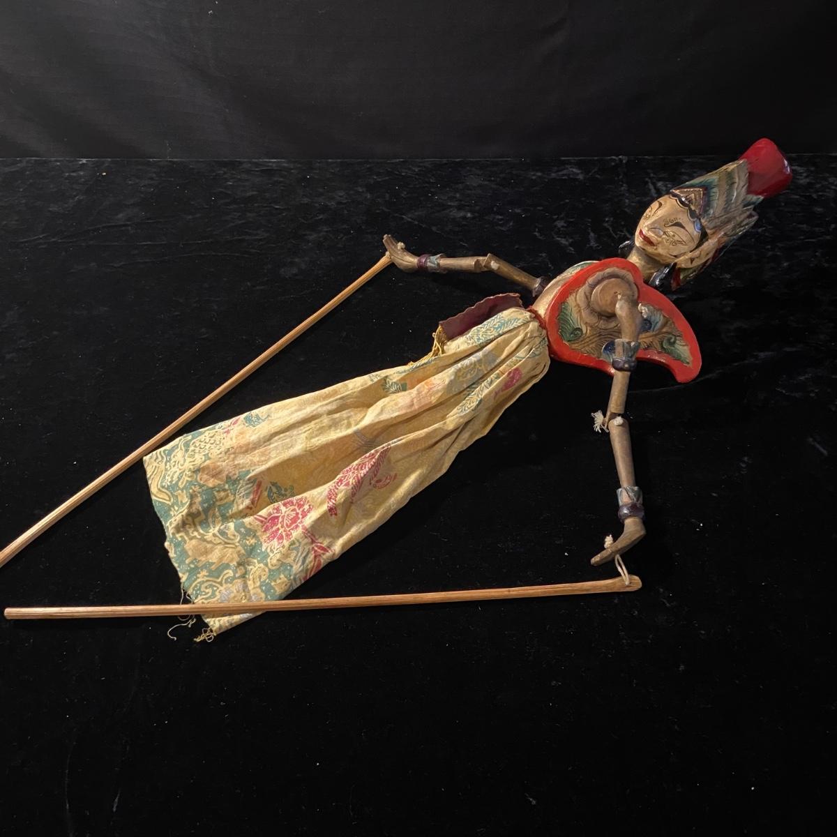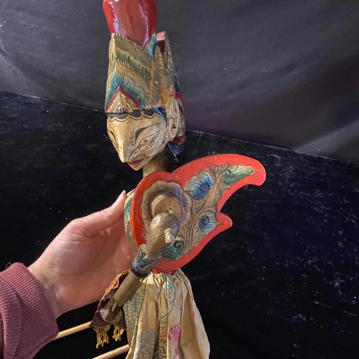 This lot appears to be an Indonesian Golek Wayang wooden rod puppet. This stunning piece seems to be made out of wood that is intricately carved. She has twine rope joints at her shoulder and elbows and rods attached to her hands for expressive movement. She is ornately painted and has a skirt and bedazzled apron made out of fabric. There is a small crack on her shoulder and the edge of her skirt has a hole and is a bit frayed. She measures approximately 5” x 7” x 33”H with rods and 22”H for just puppet.