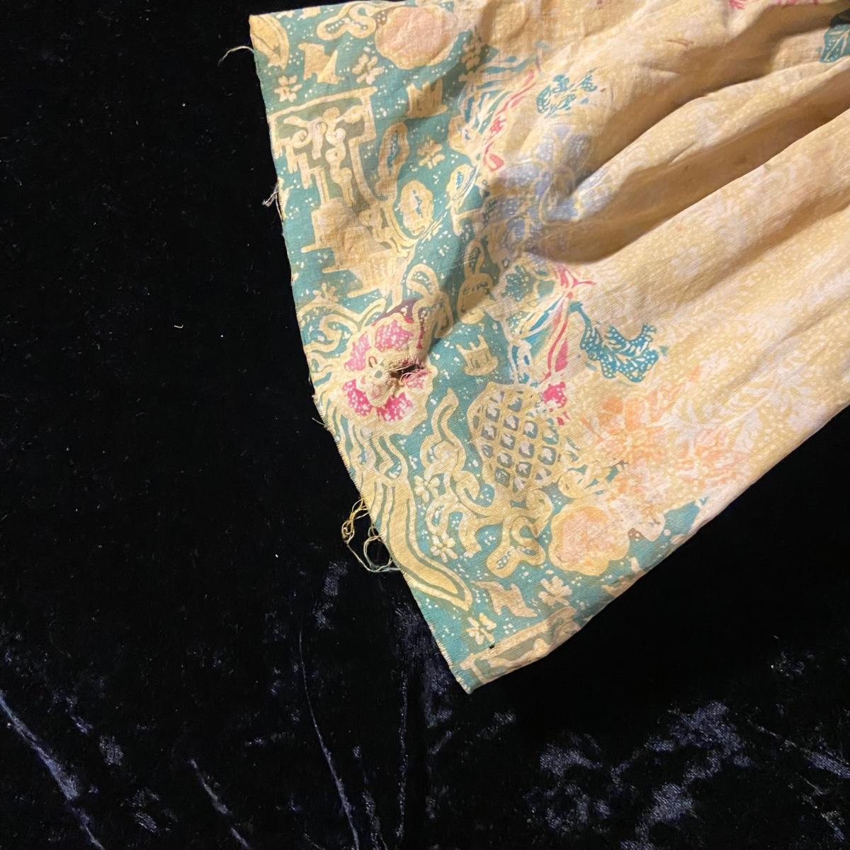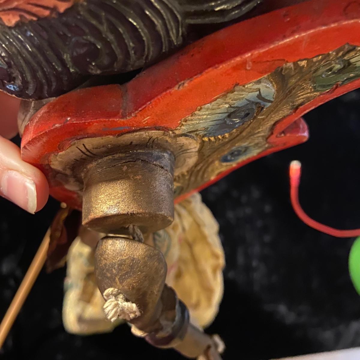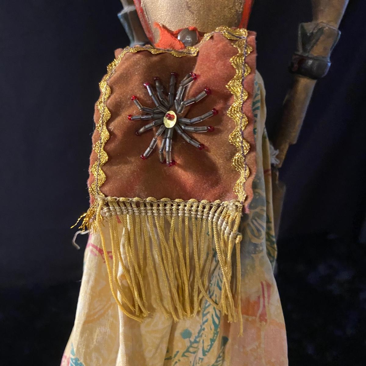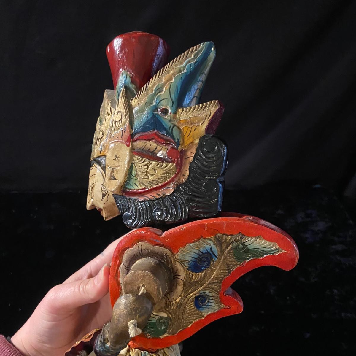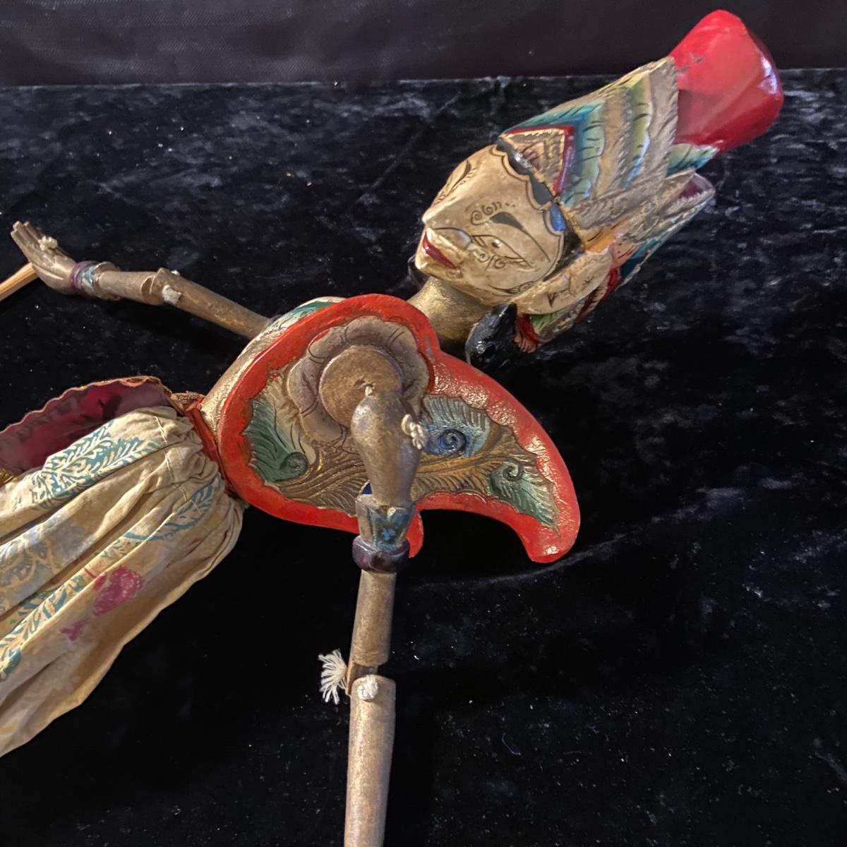 This lot appears to be an Indonesian Golek Wayang wooden rod puppet. This stunning piece seems to be made out of wood that is intricately carved. She has twine rope joints at her shoulder and elbows and rods attached to her hands for expressive movement. She is ornately painted and has a skirt and bedazzled apron made out of fabric. There is a small crack on her shoulder and the edge of her skirt has a hole and is a bit frayed. She measures approximately 5” x 7” x 33”H with rods and 22”H for just puppet.