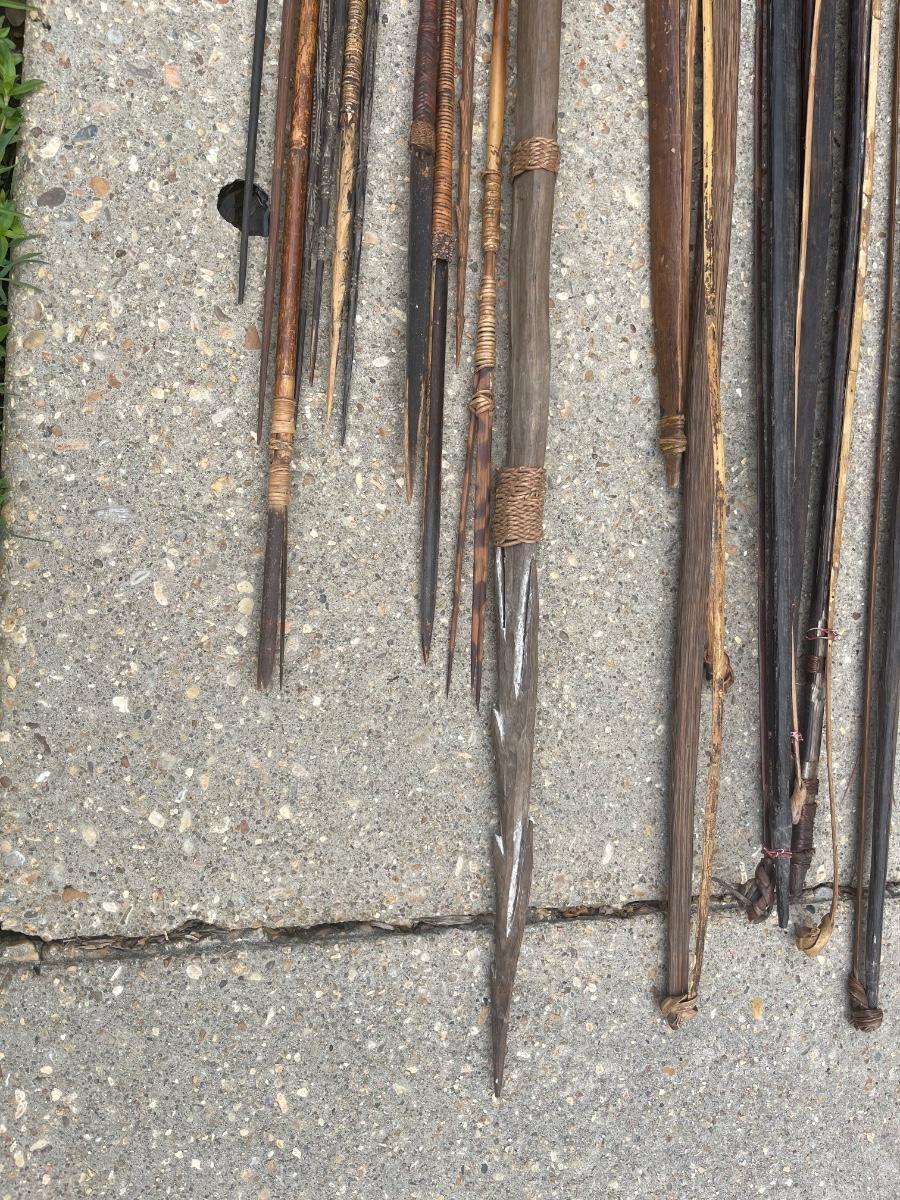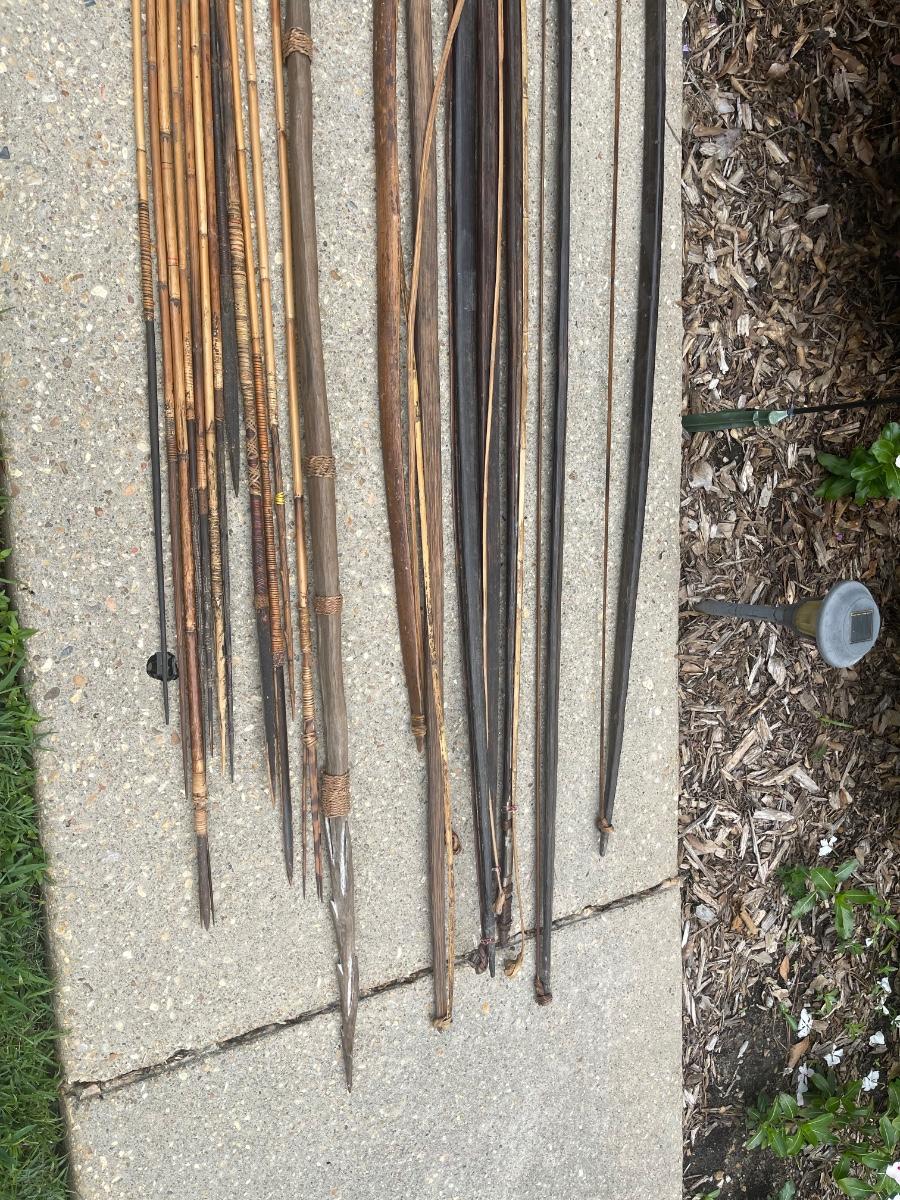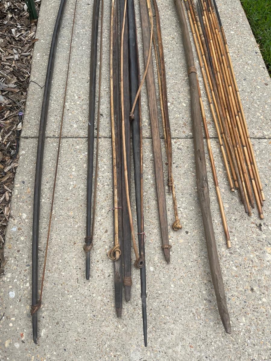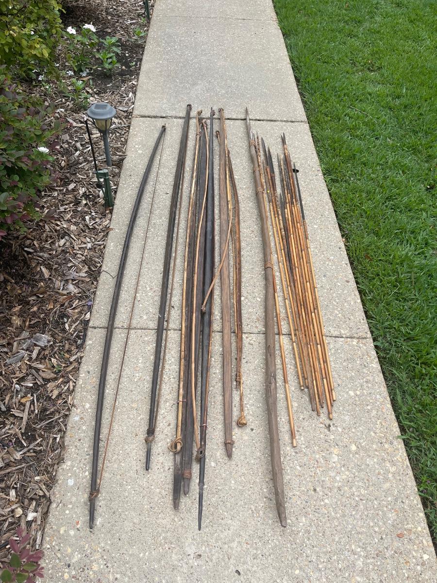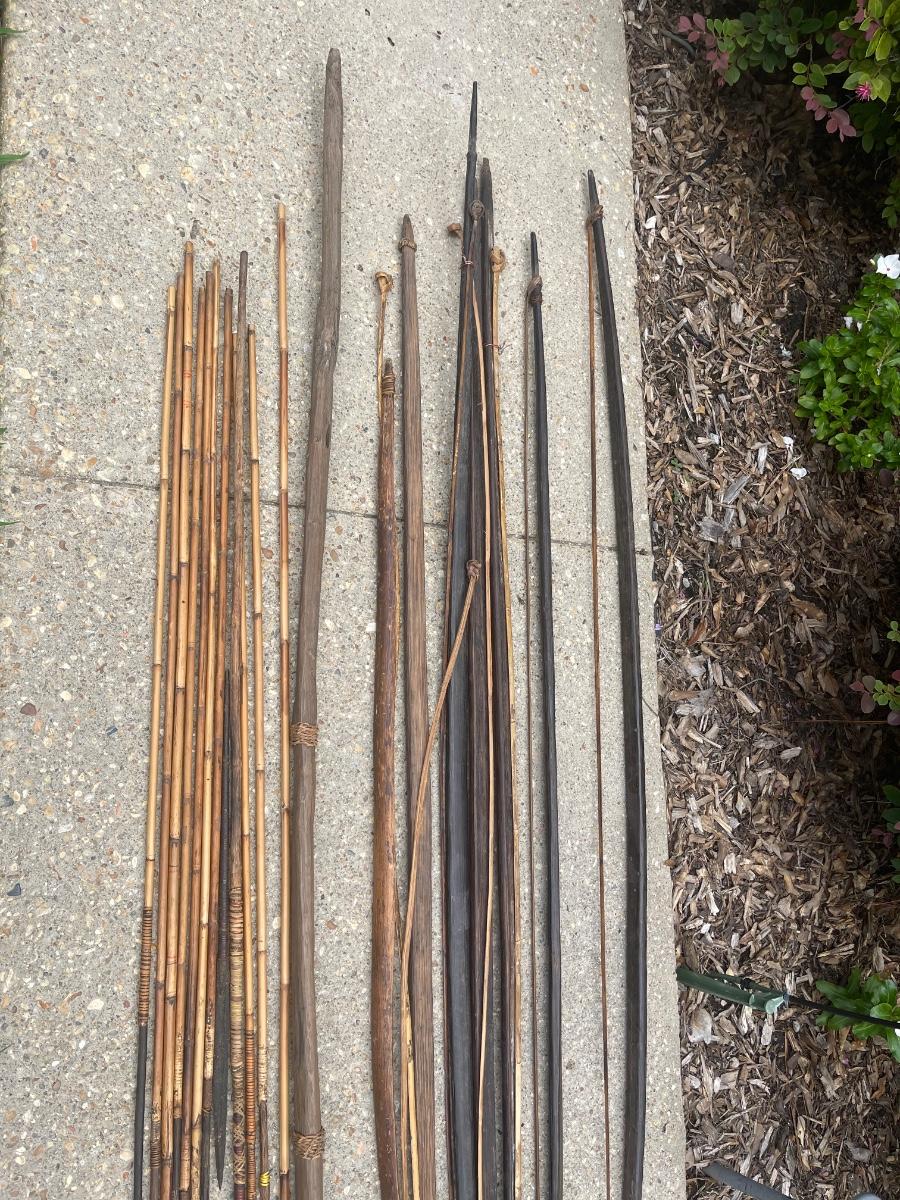7 Bows ~ 1 Large Spear ~ 11 small spears ~ Longest Bow measures 74' and the longest spear is 80' with the average spear measuring 50".