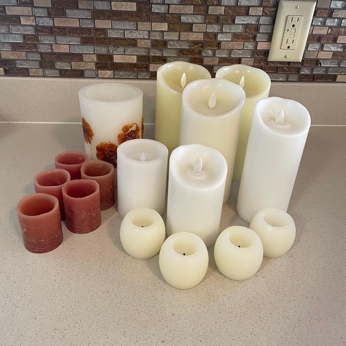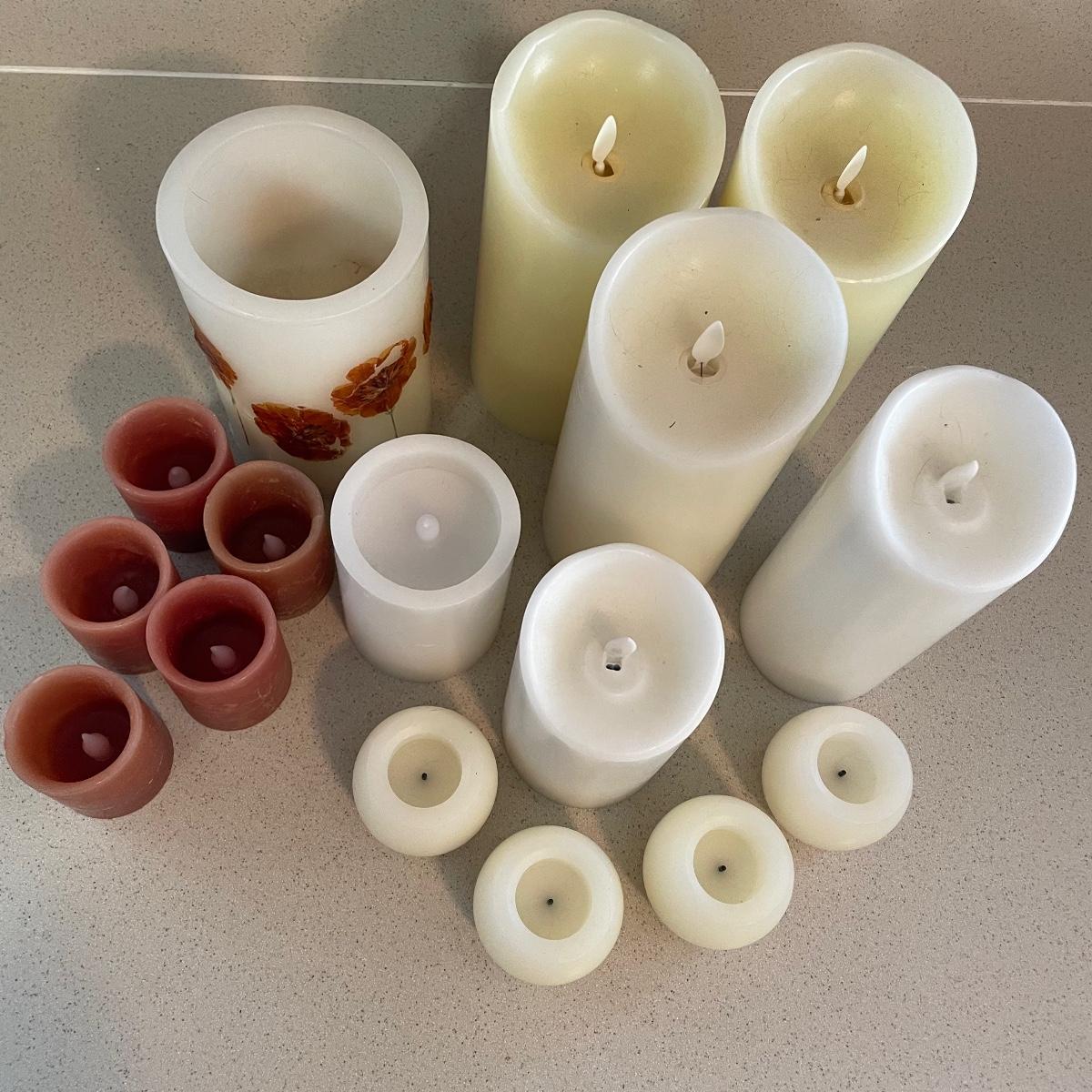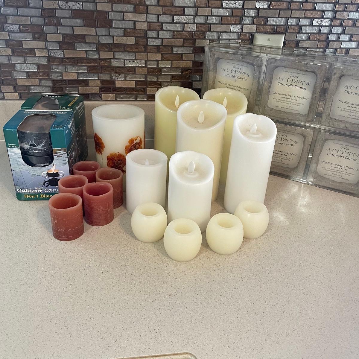 There are sixteen battery operated candles in this lot, the majority of which have good batteries. Also included are some outdoor candles.