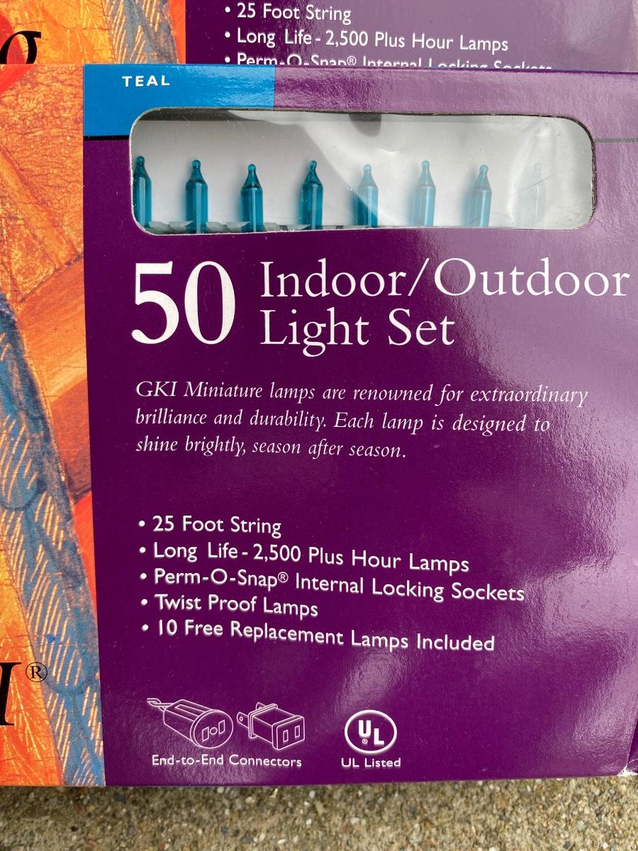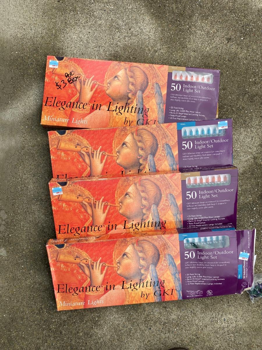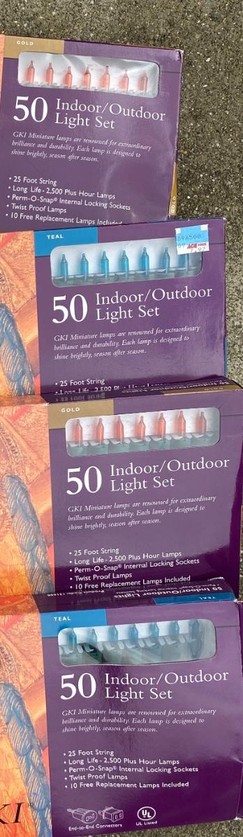 4 new boxes of holiday lights. 25 foot, 50 light strings. The boxes say gold and teal but they look red and green? It will be a surprise!