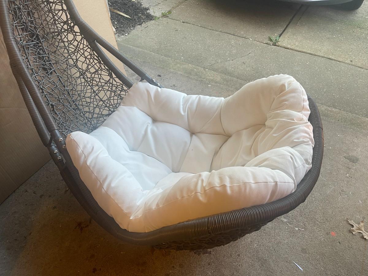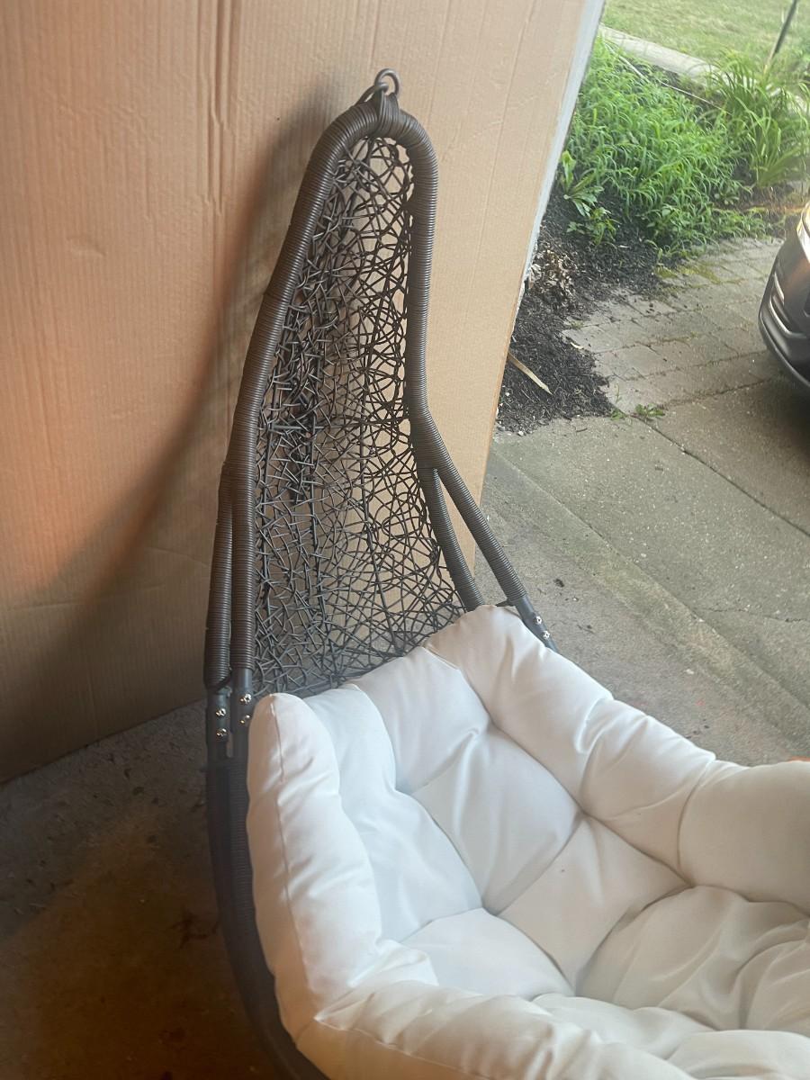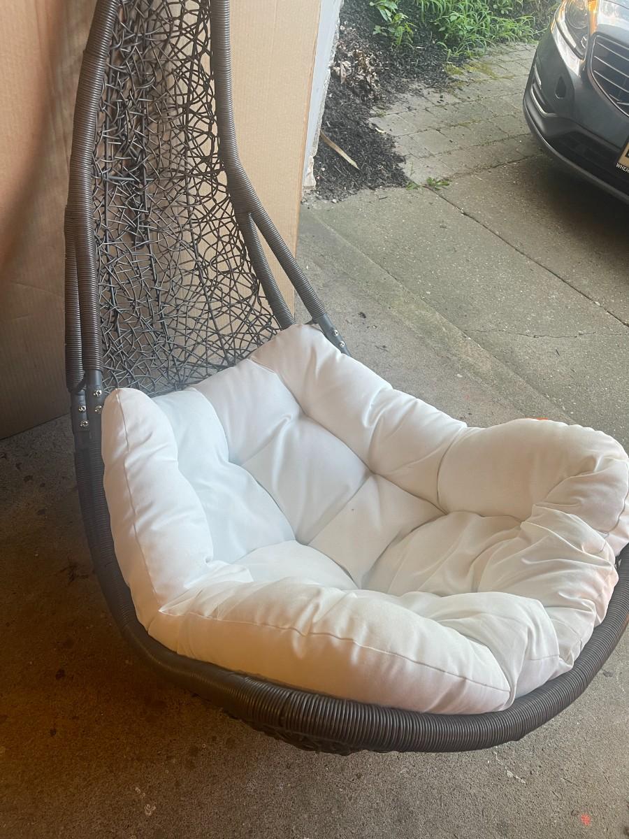 Indoor/outdoor resin swing in like new condition. Comes with white cushion, also in like new condition.