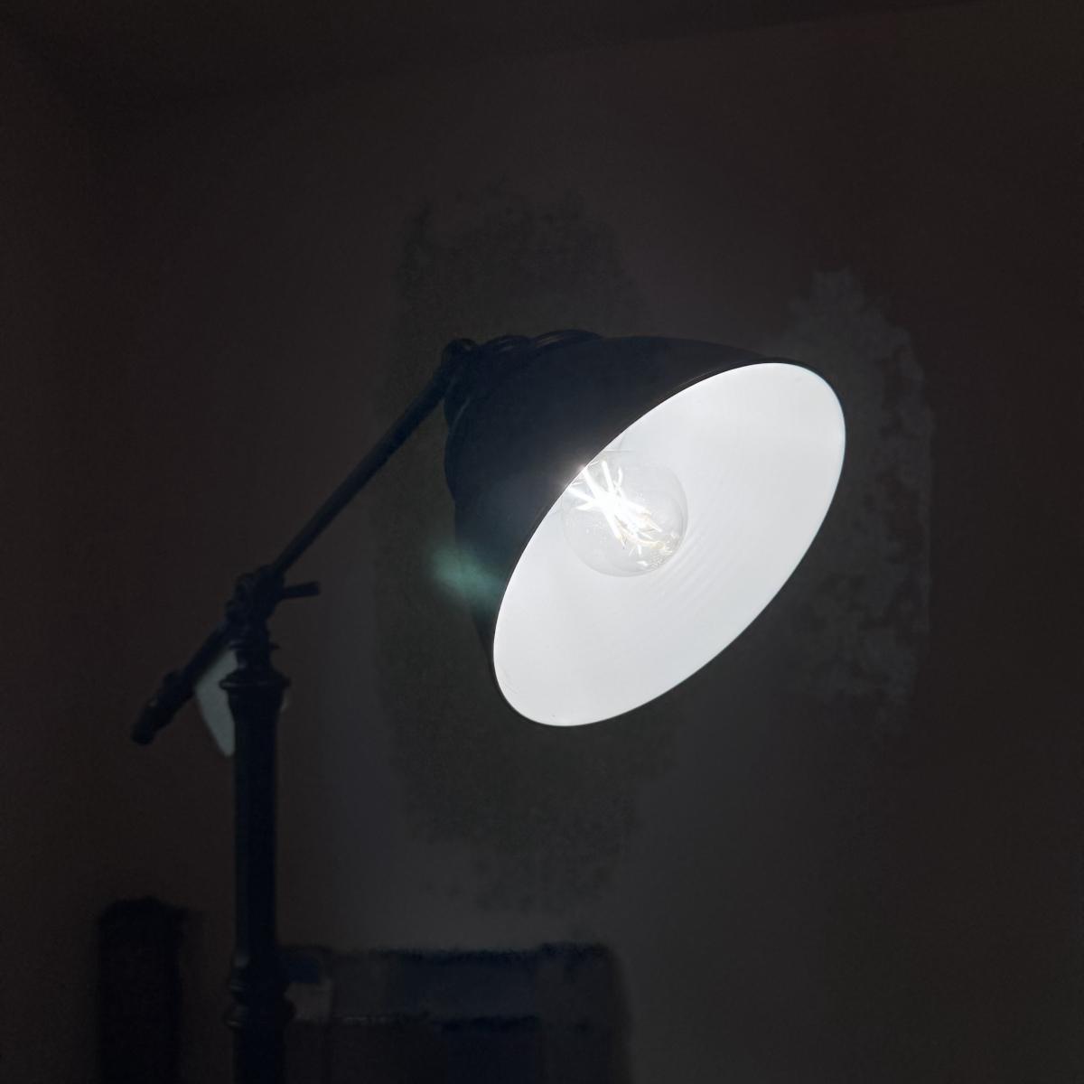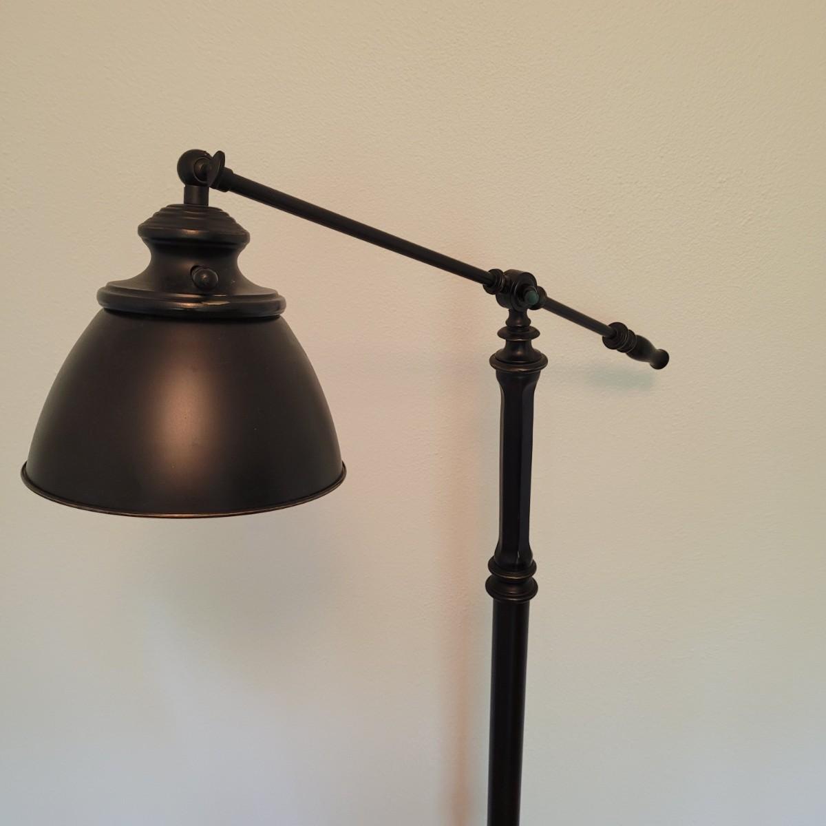 Metal swing arm style floor lamp. It has two spots for adjusting the height and angle of the light. The lamp powers on when plugged in. The lamp measures 25" x 60"H.