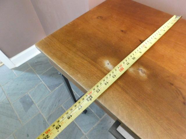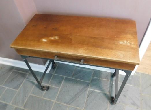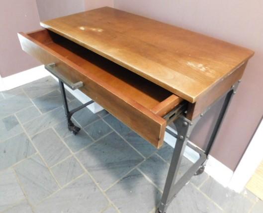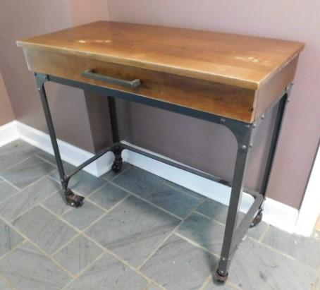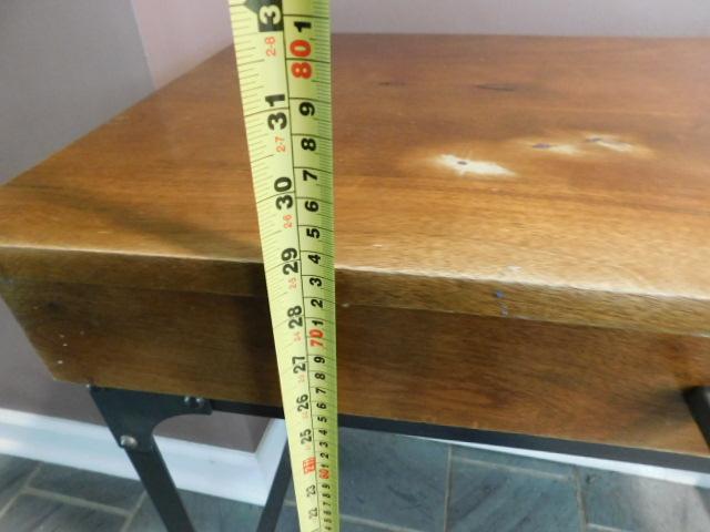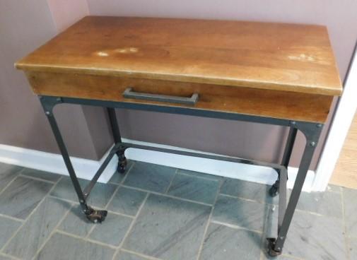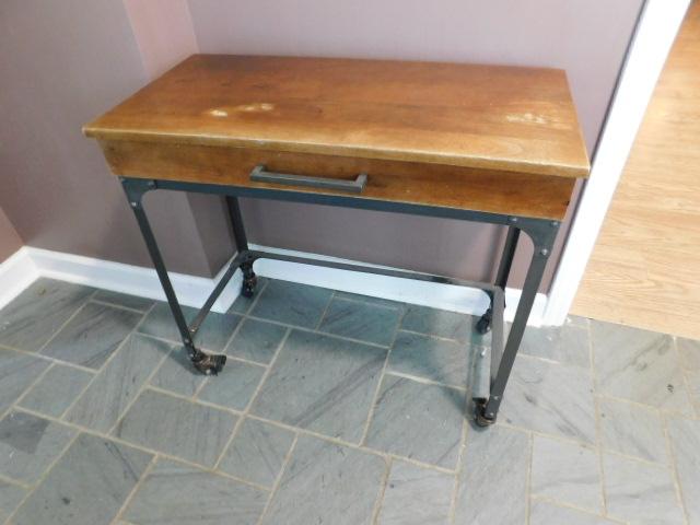 Industrial Metal Frame Work Roll Table with Maple Wood Top & Drawer 31"x16"x28" has wear and scratches to surface. Nice item