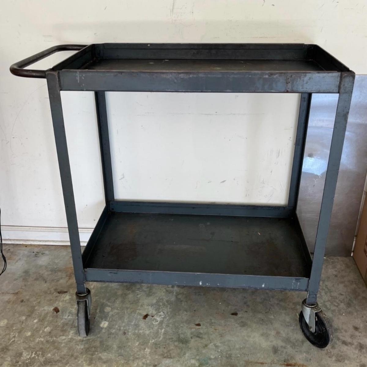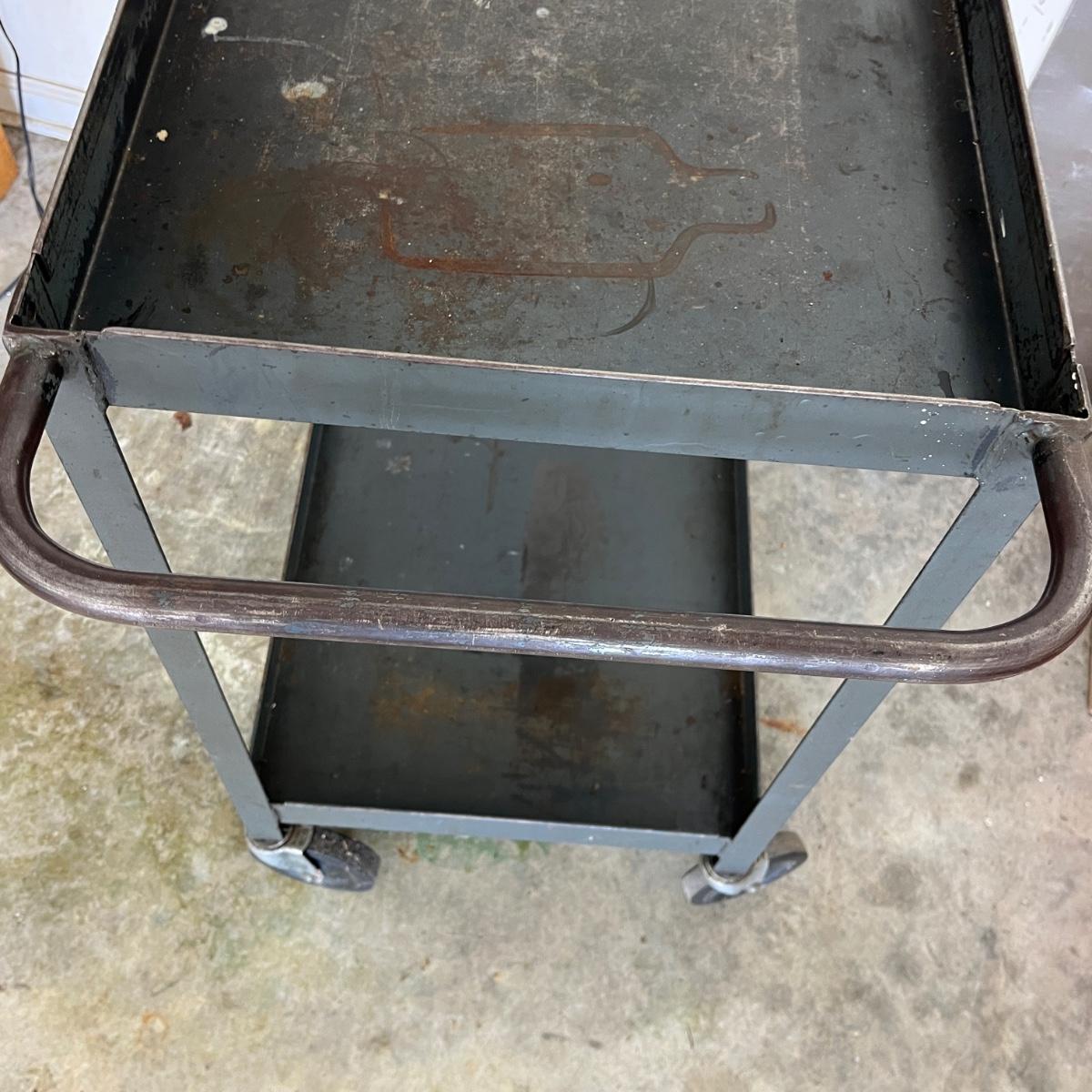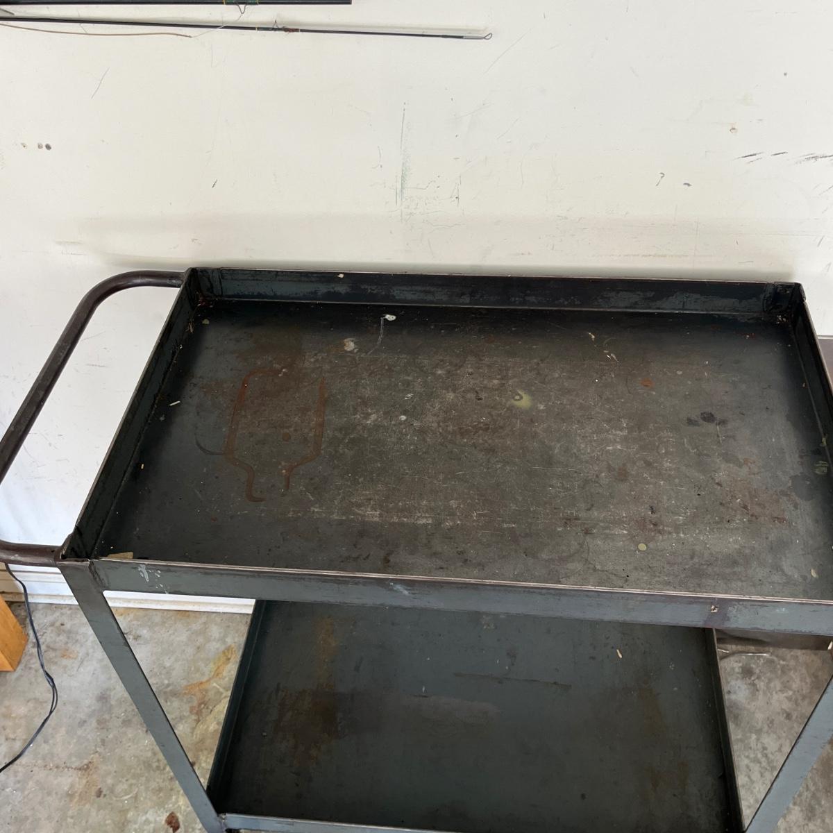 Lot includes a rolling metal industrial cart with two shelves. Cart measures 35” x 18” x 34”H. Cart has scratches and surface rust, see pictures.