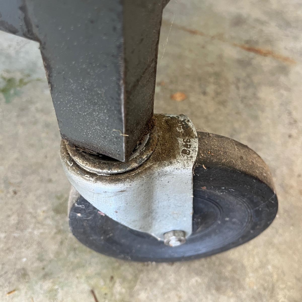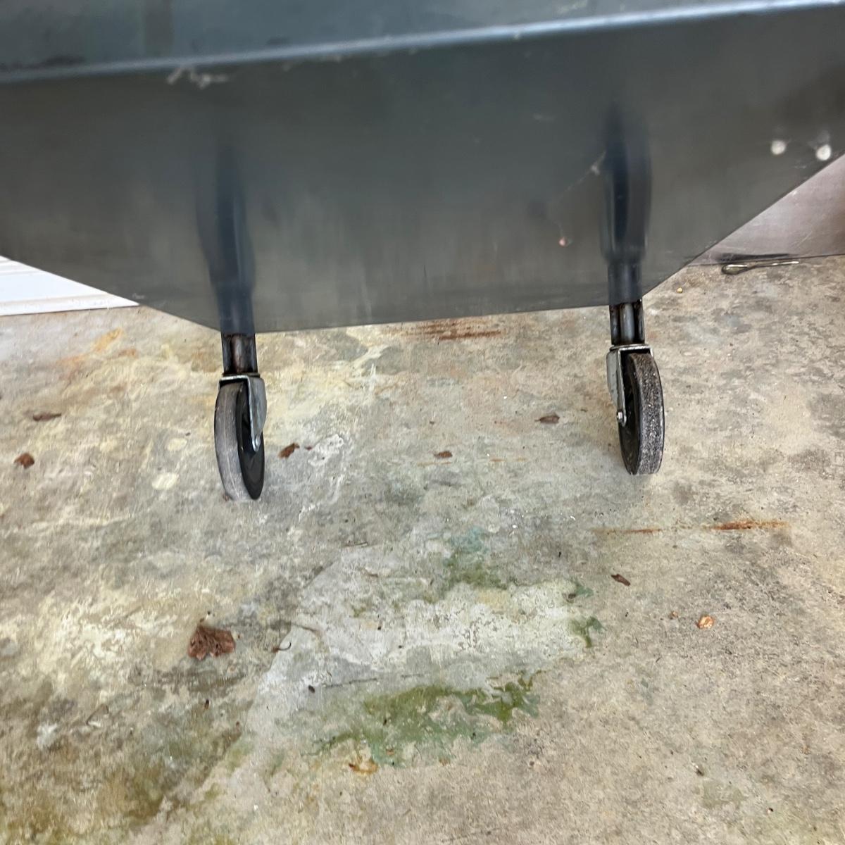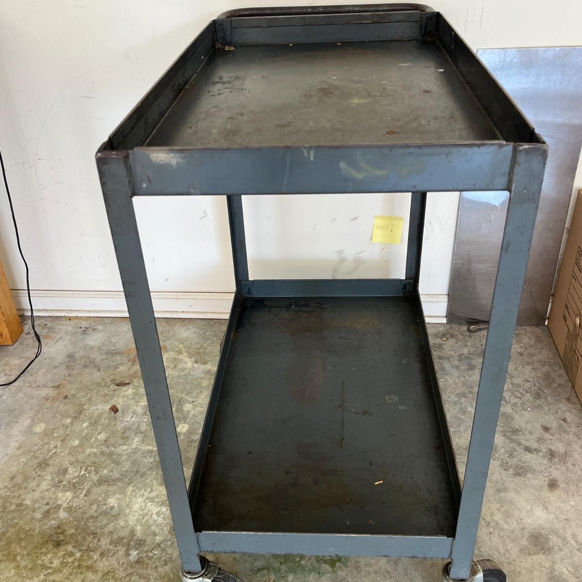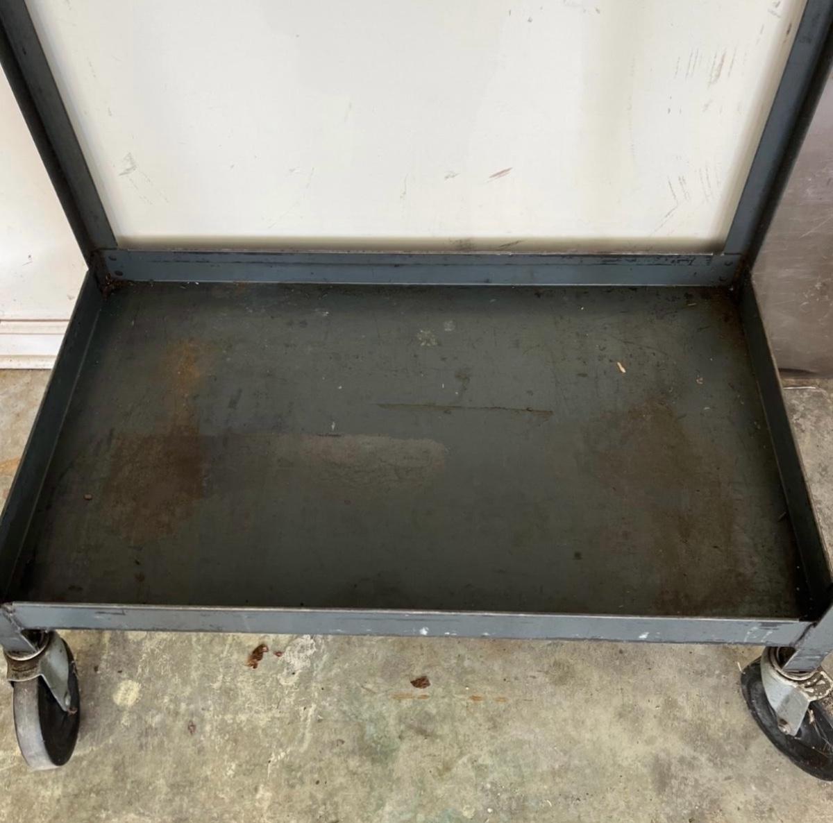 Lot includes a rolling metal industrial cart with two shelves. Cart measures 35” x 18” x 34”H. Cart has scratches and surface rust, see pictures.
