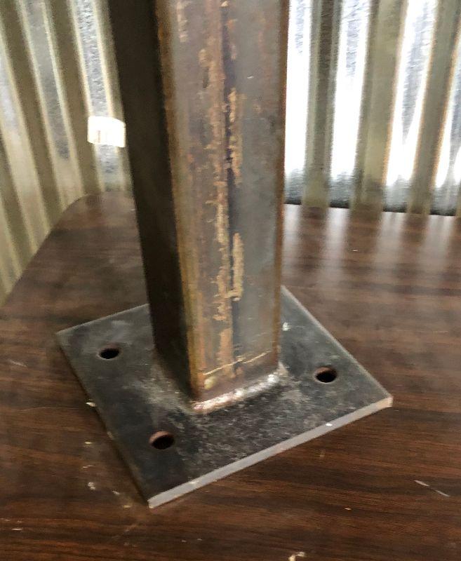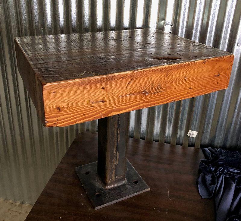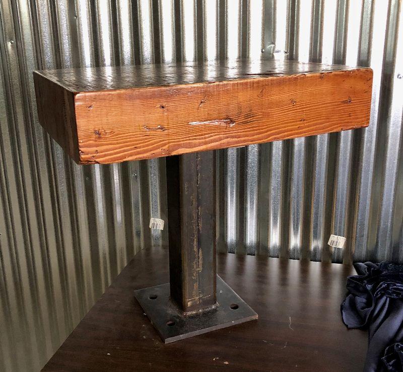 Here is a sturdy, heavy, handmade industrial style end table...20x20x25"...Wood and steel....