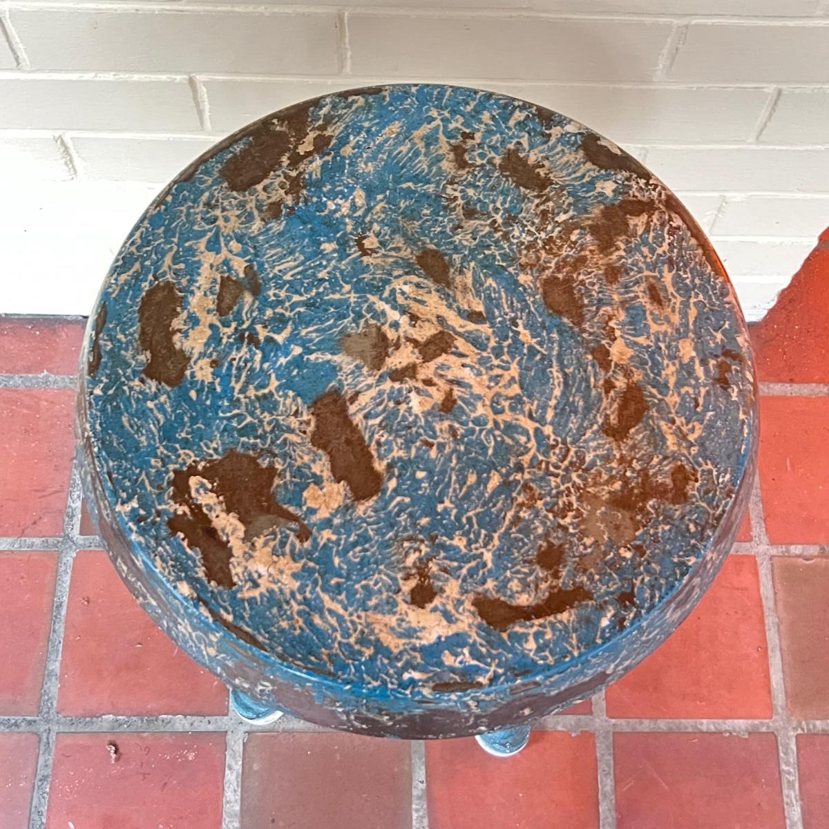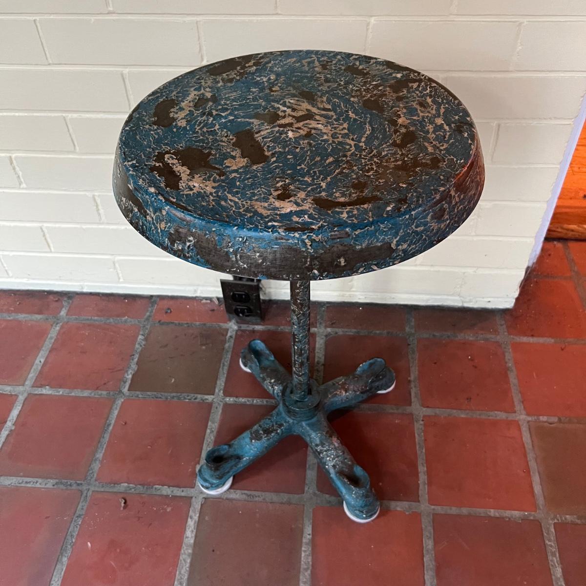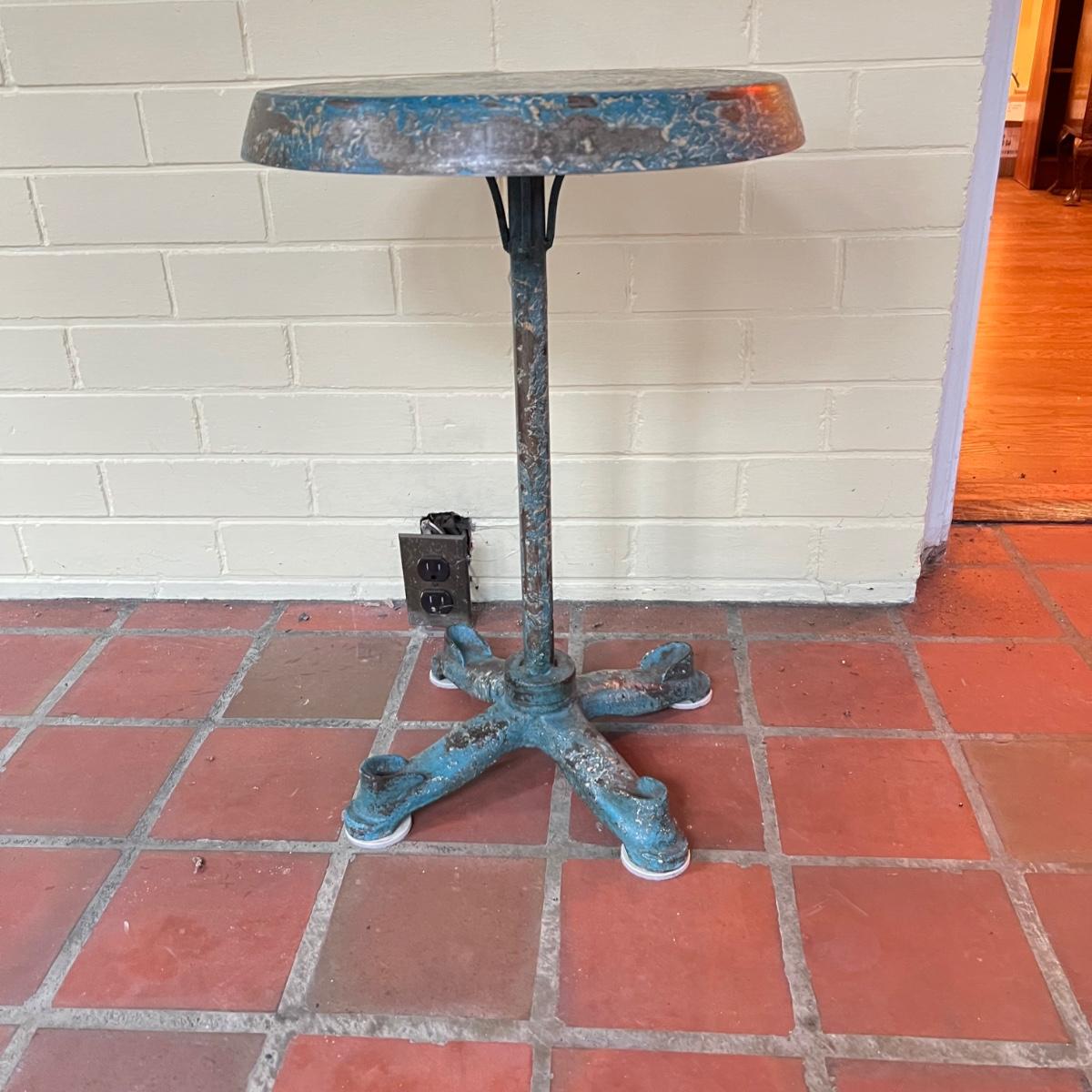 This deliberately distressed industrial stool is a heavy metal with an attractive patina. It does not swivel or adjust in height.