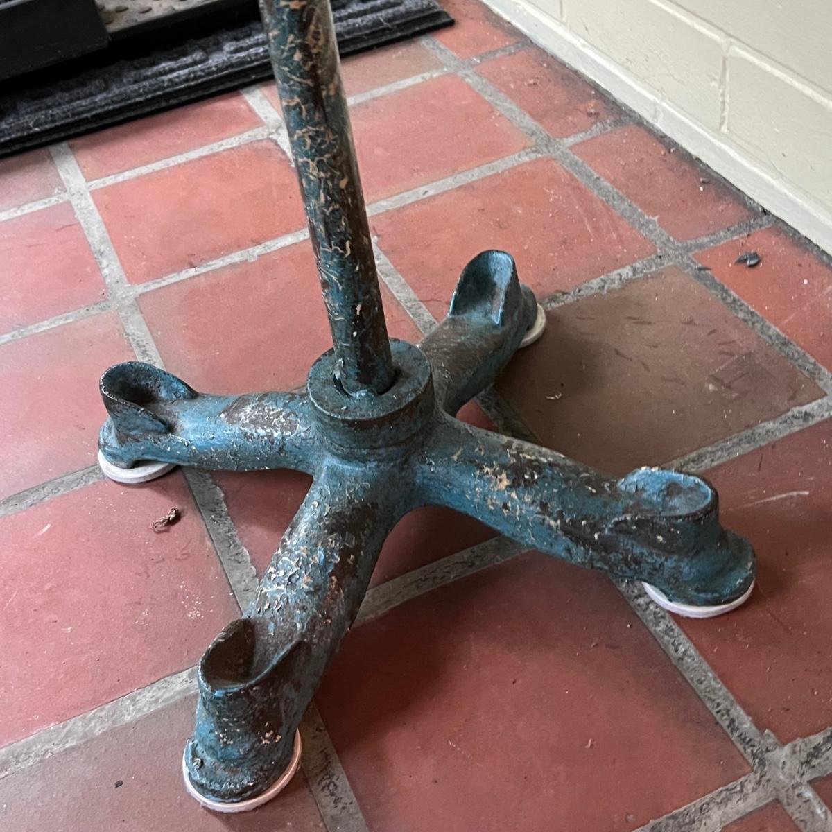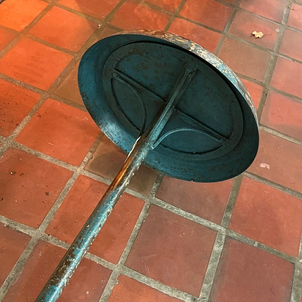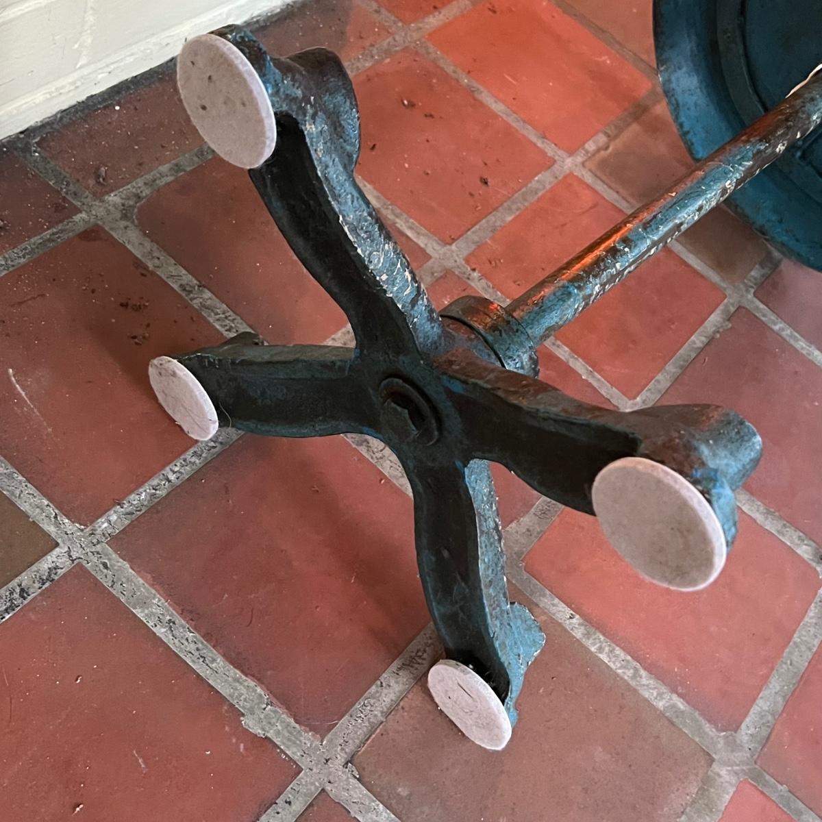 This deliberately distressed industrial stool is a heavy metal with an attractive patina. It does not swivel or adjust in height.