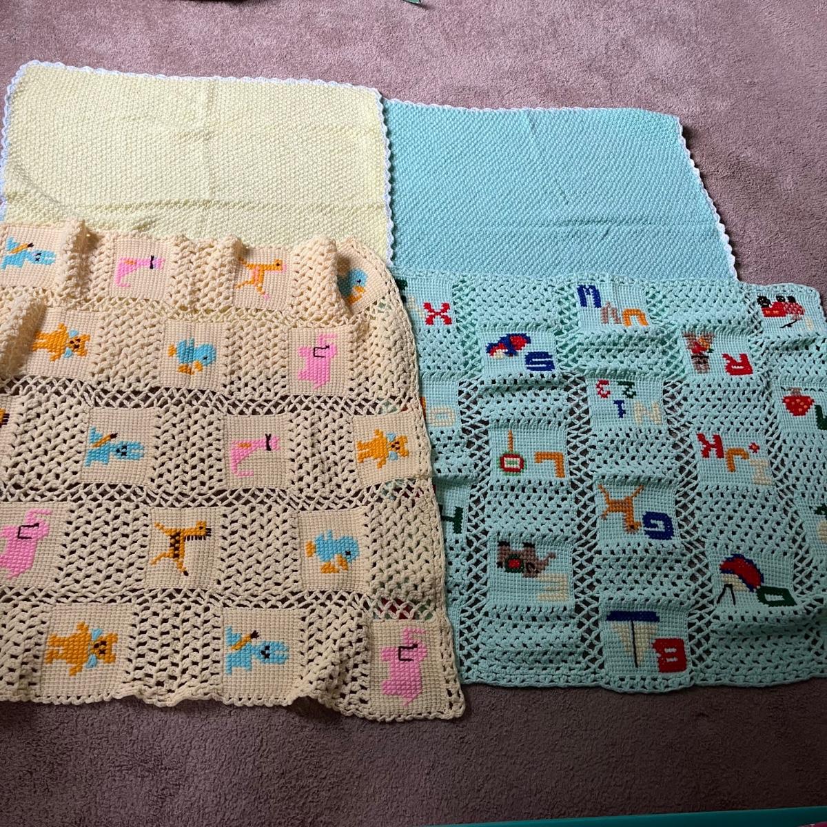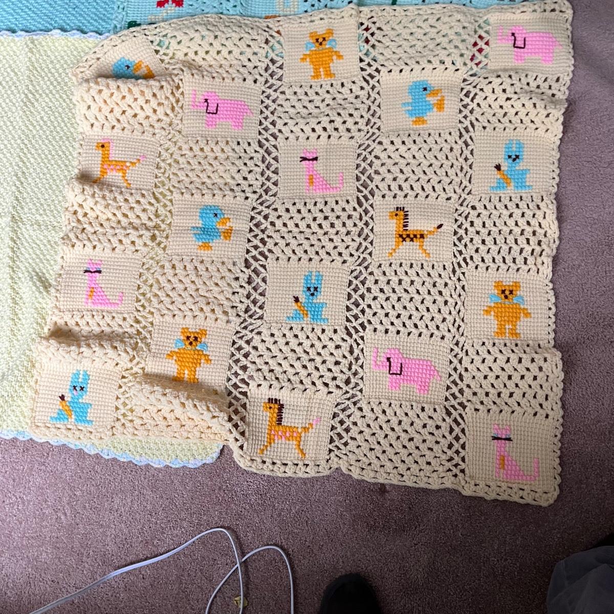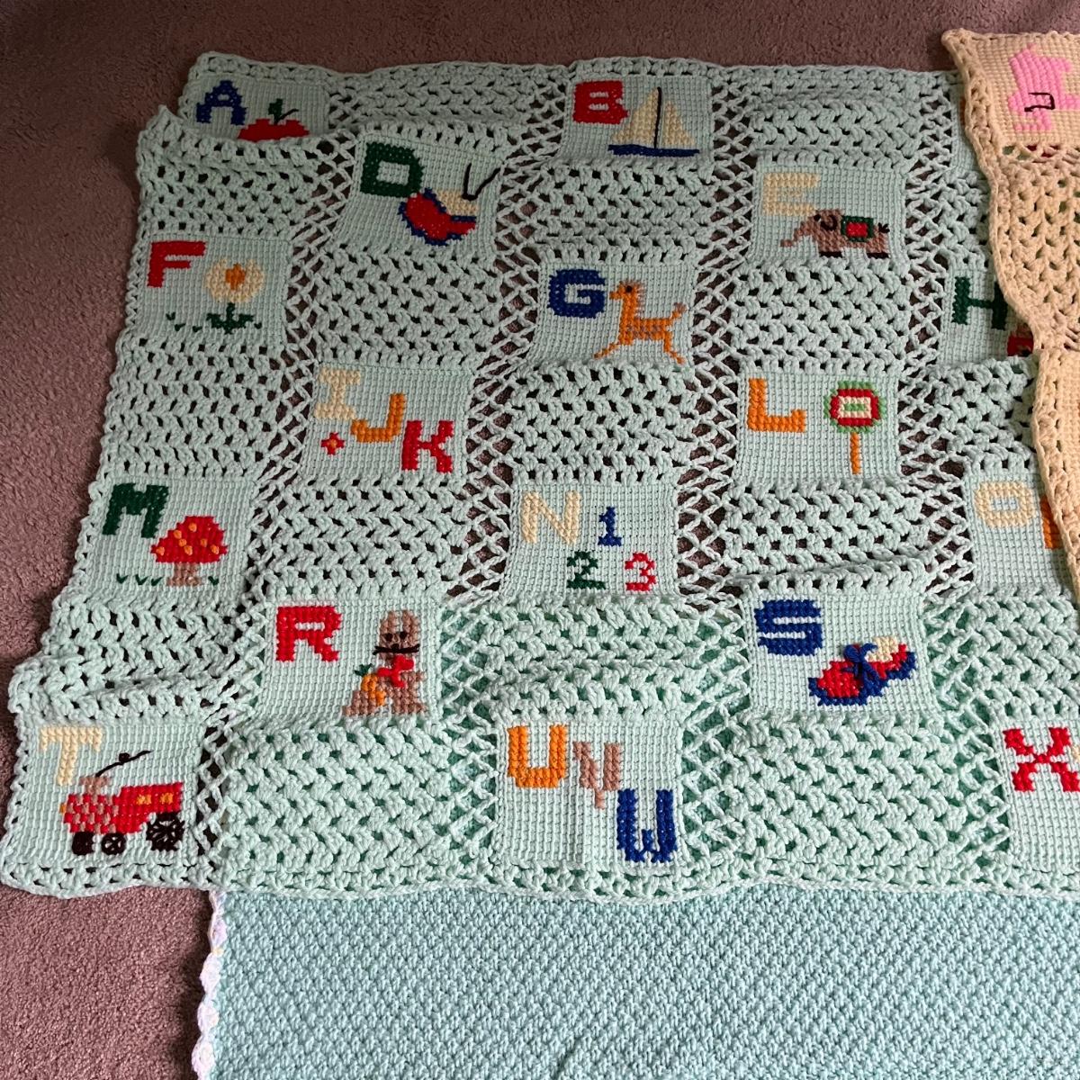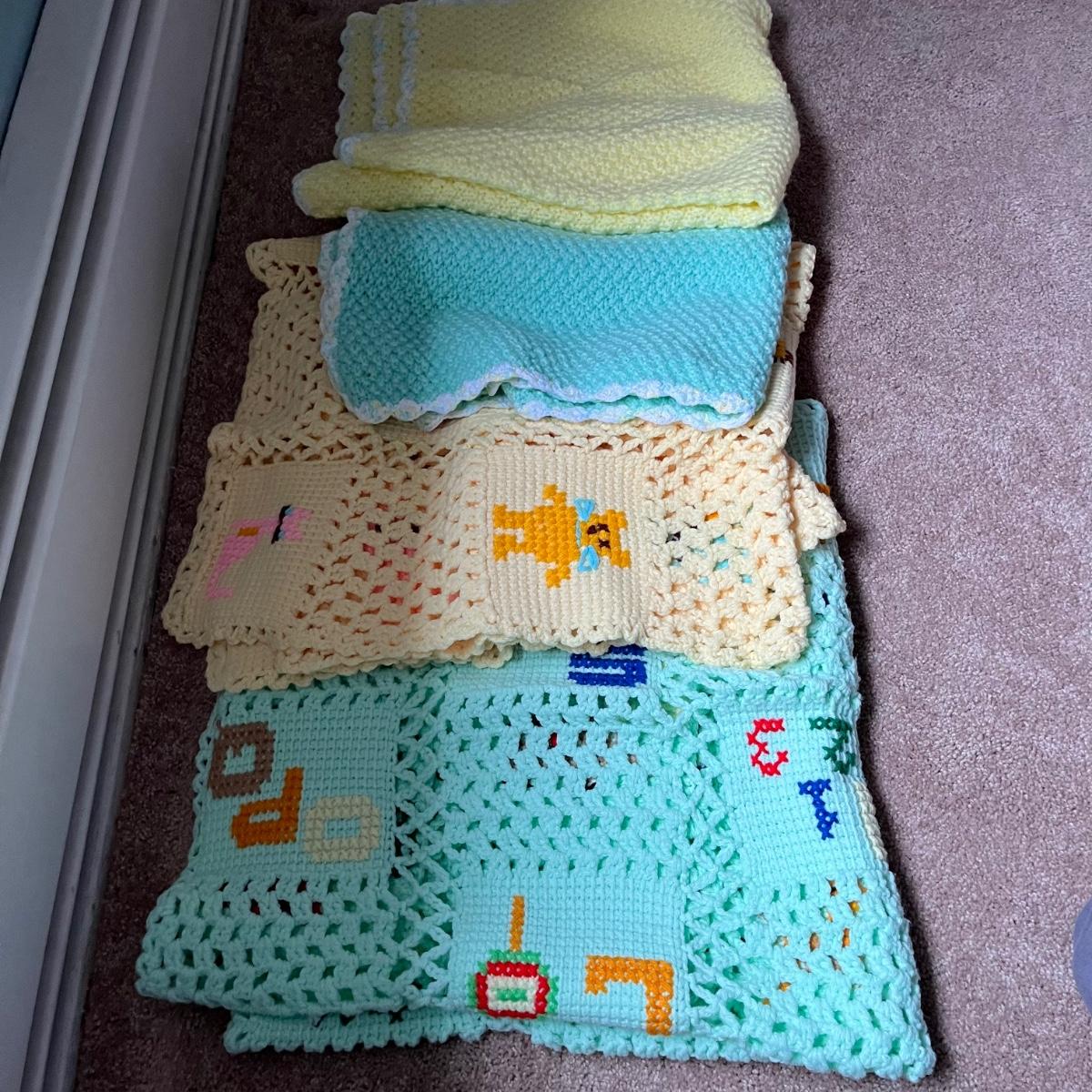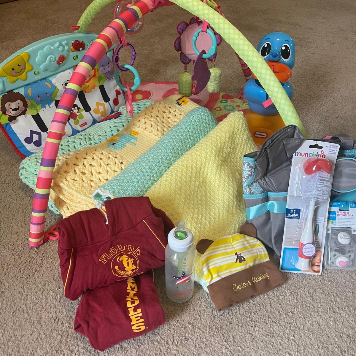 Lot includes four crochet blankets, playmat with Mobil, Fisher BBC Price musical toy, FSU hoodie and sweatpants size 18, bag and more. Largest blanket measures 36” x 38”.