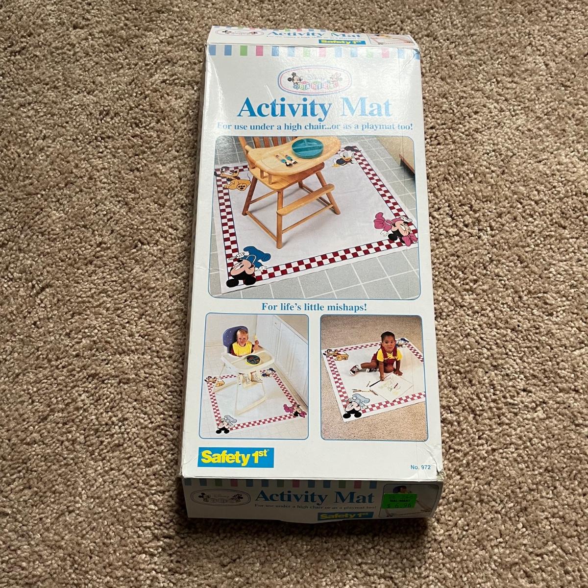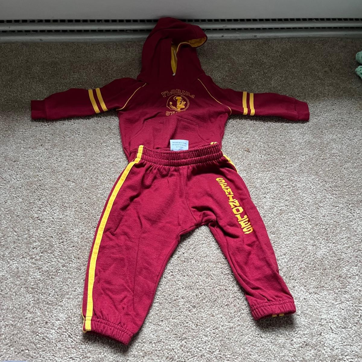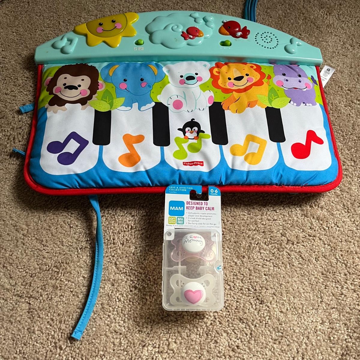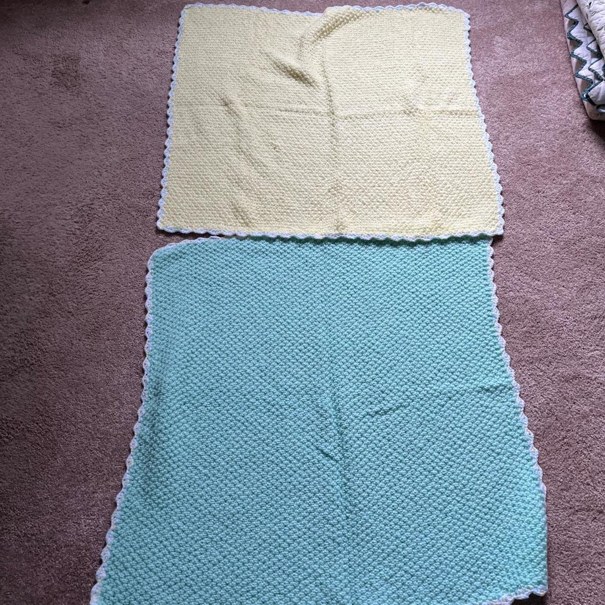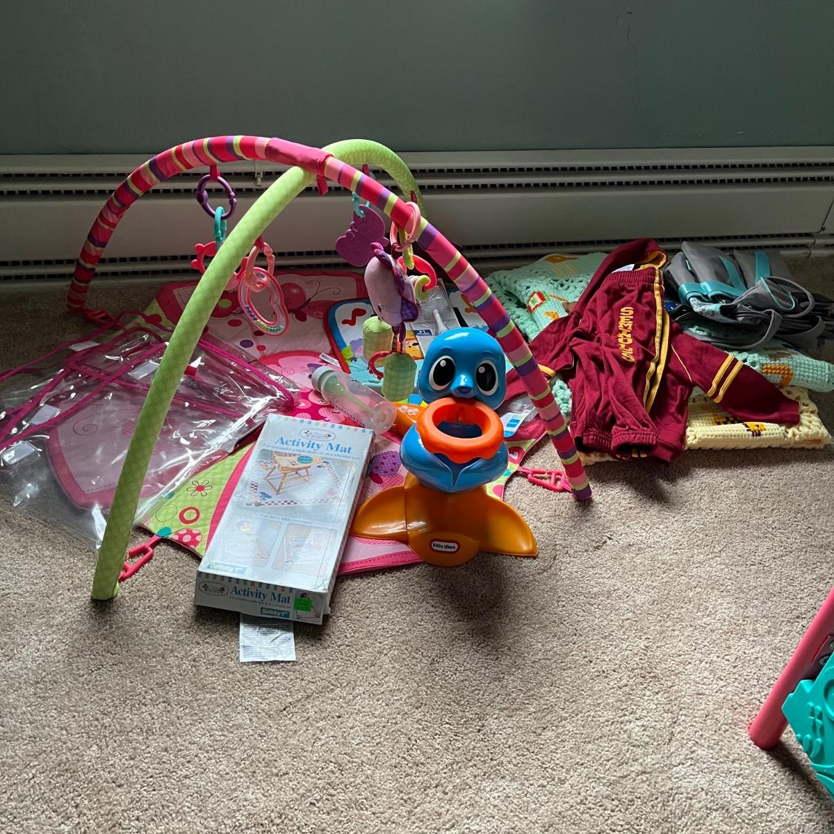 Lot includes four crochet blankets, playmat with Mobil, Fisher BBC Price musical toy, FSU hoodie and sweatpants size 18, bag and more. Largest blanket measures 36” x 38”.