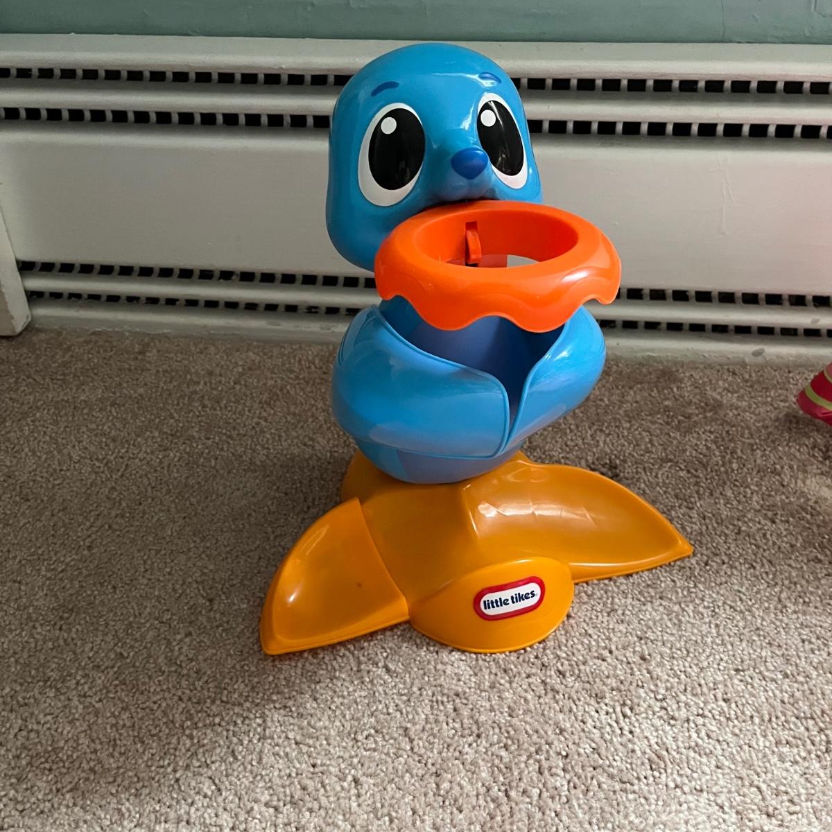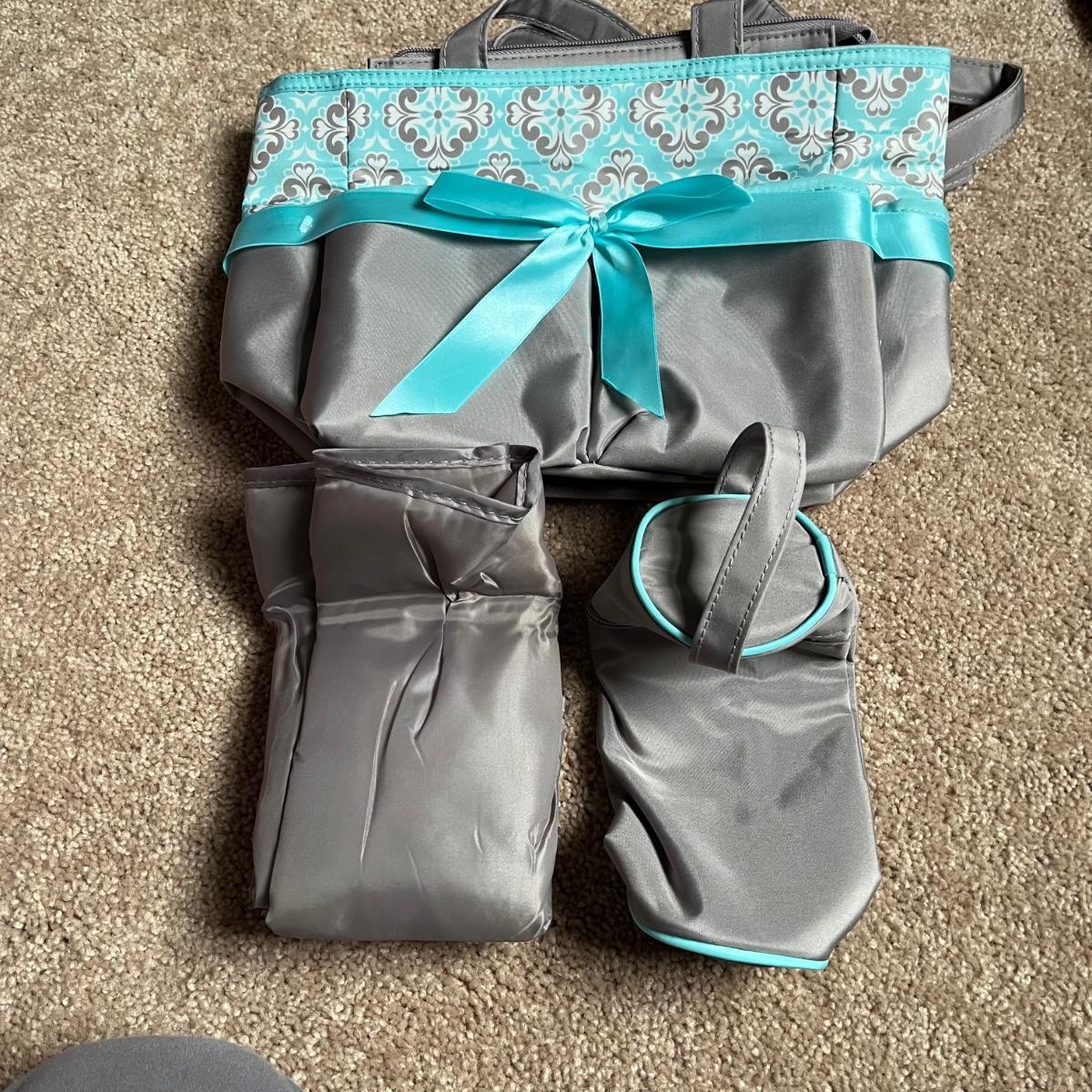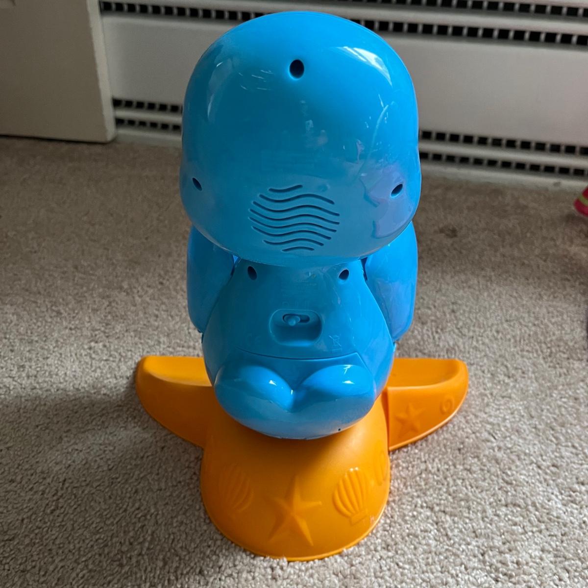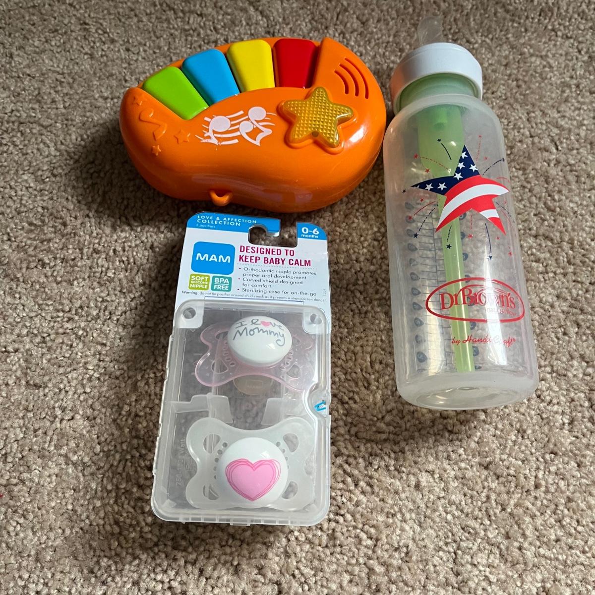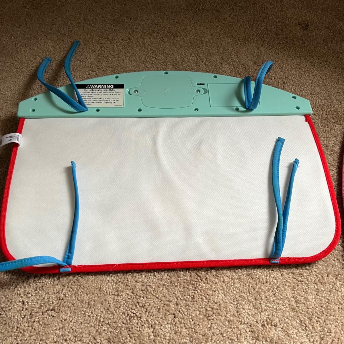 Lot includes four crochet blankets, playmat with Mobil, Fisher BBC Price musical toy, FSU hoodie and sweatpants size 18, bag and more. Largest blanket measures 36” x 38”.