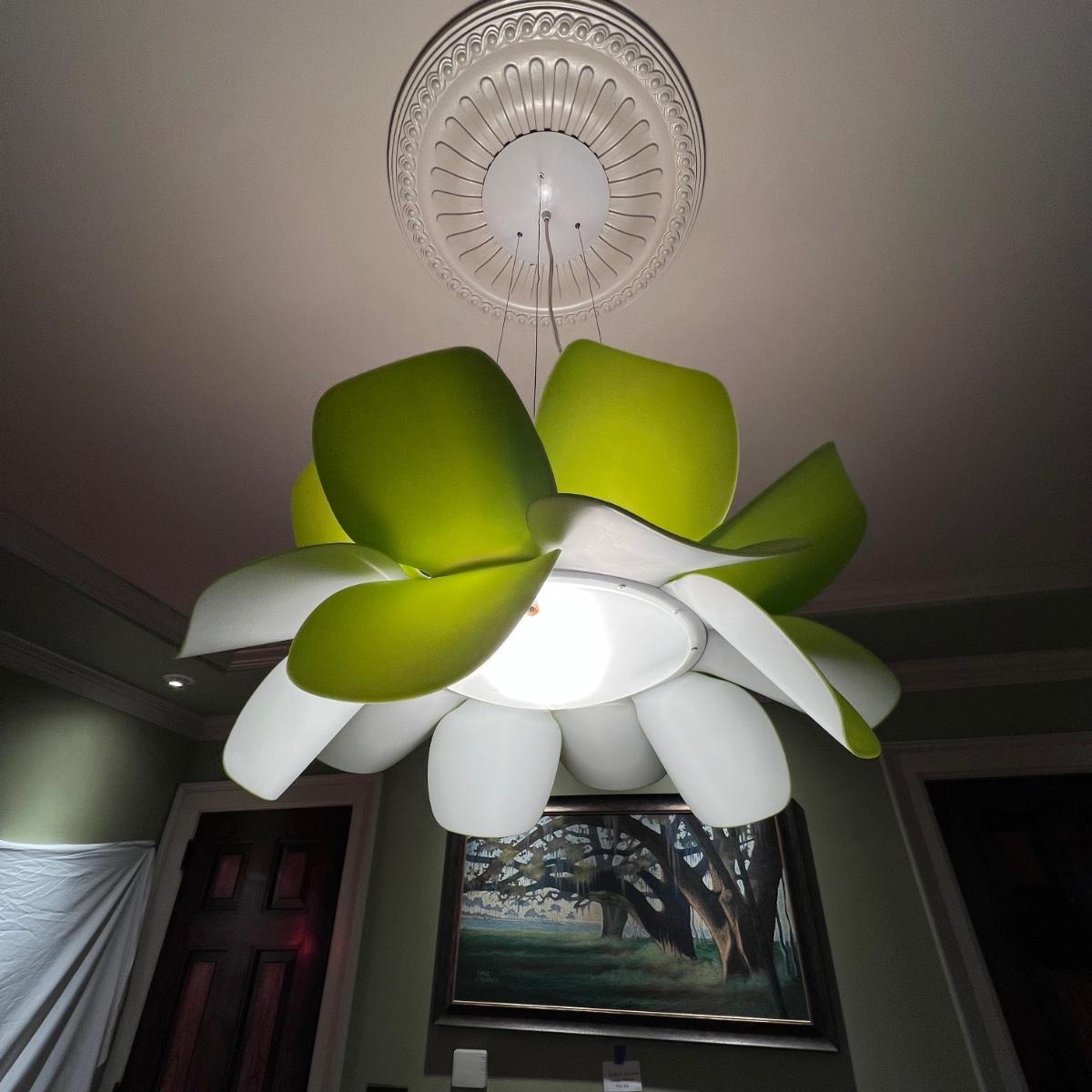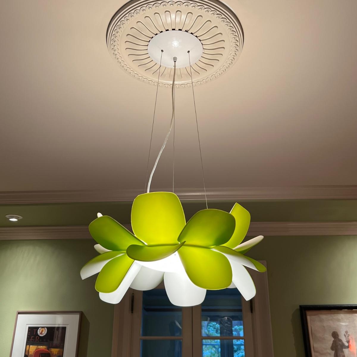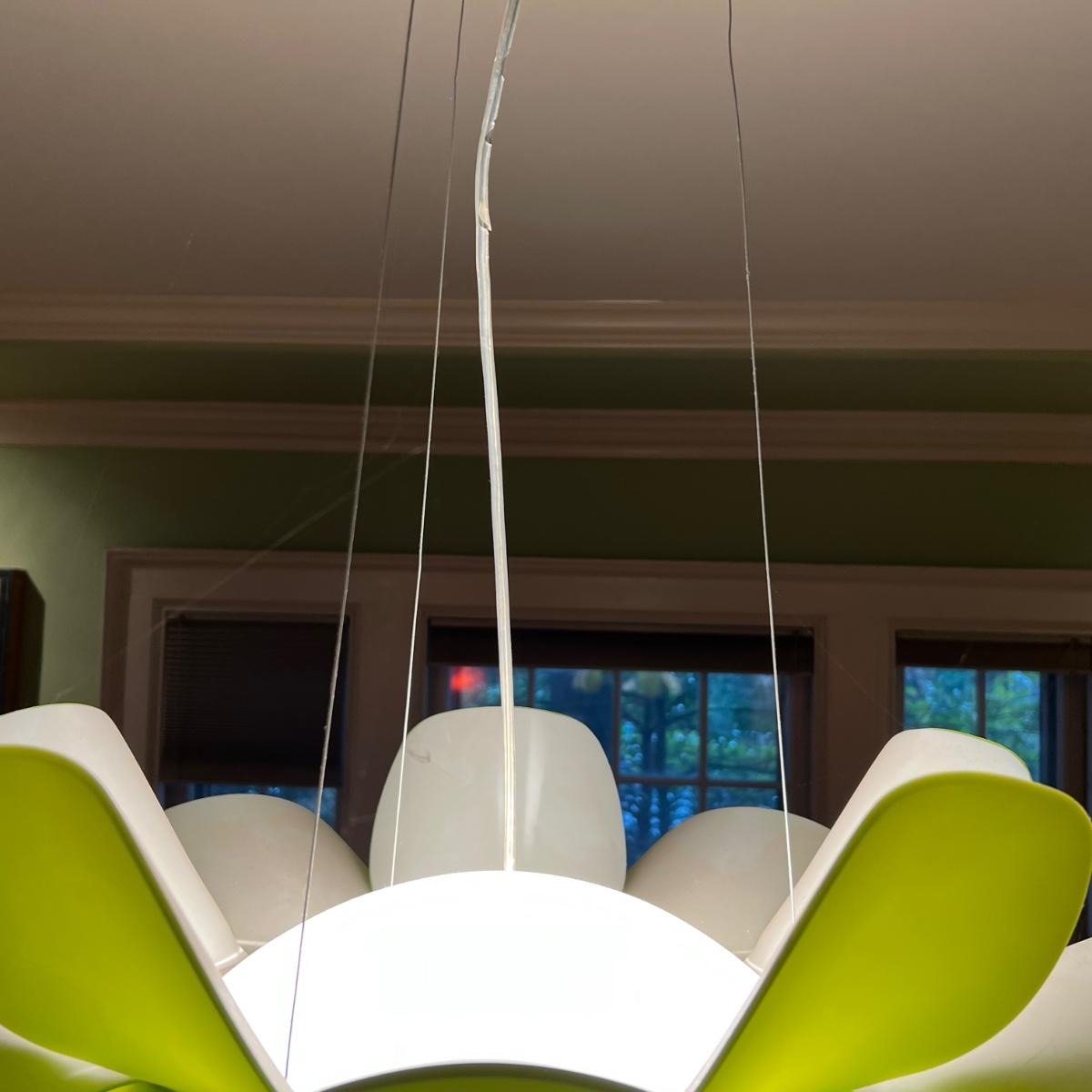 This modern light appears to be the Estiluz Infiore pendant lamp. It is shaped like a flower hence the Italian “Infiore” name. Pendant is composed of a group of petals in what appears to be bi-injected polycarbonate (this information was found online). Bulb is protected by a satin glass. It hangs off three wires. Winning bidder is responsible for removing the unit from the mount and wiring and must bring wire caps for loose wires. Power will be shut off for removal.