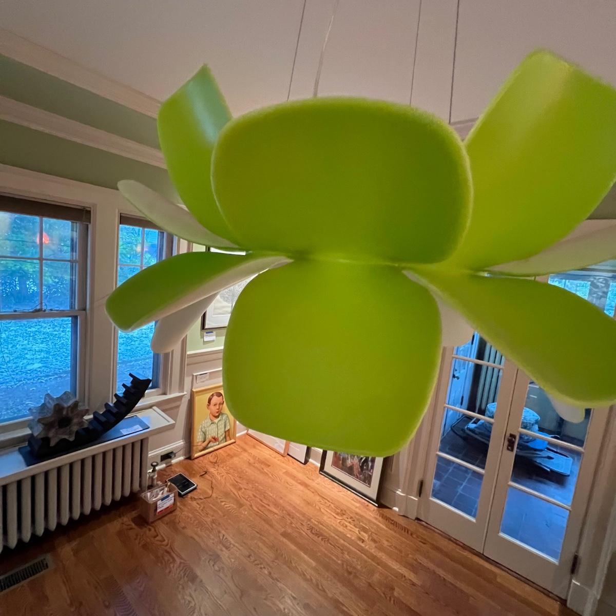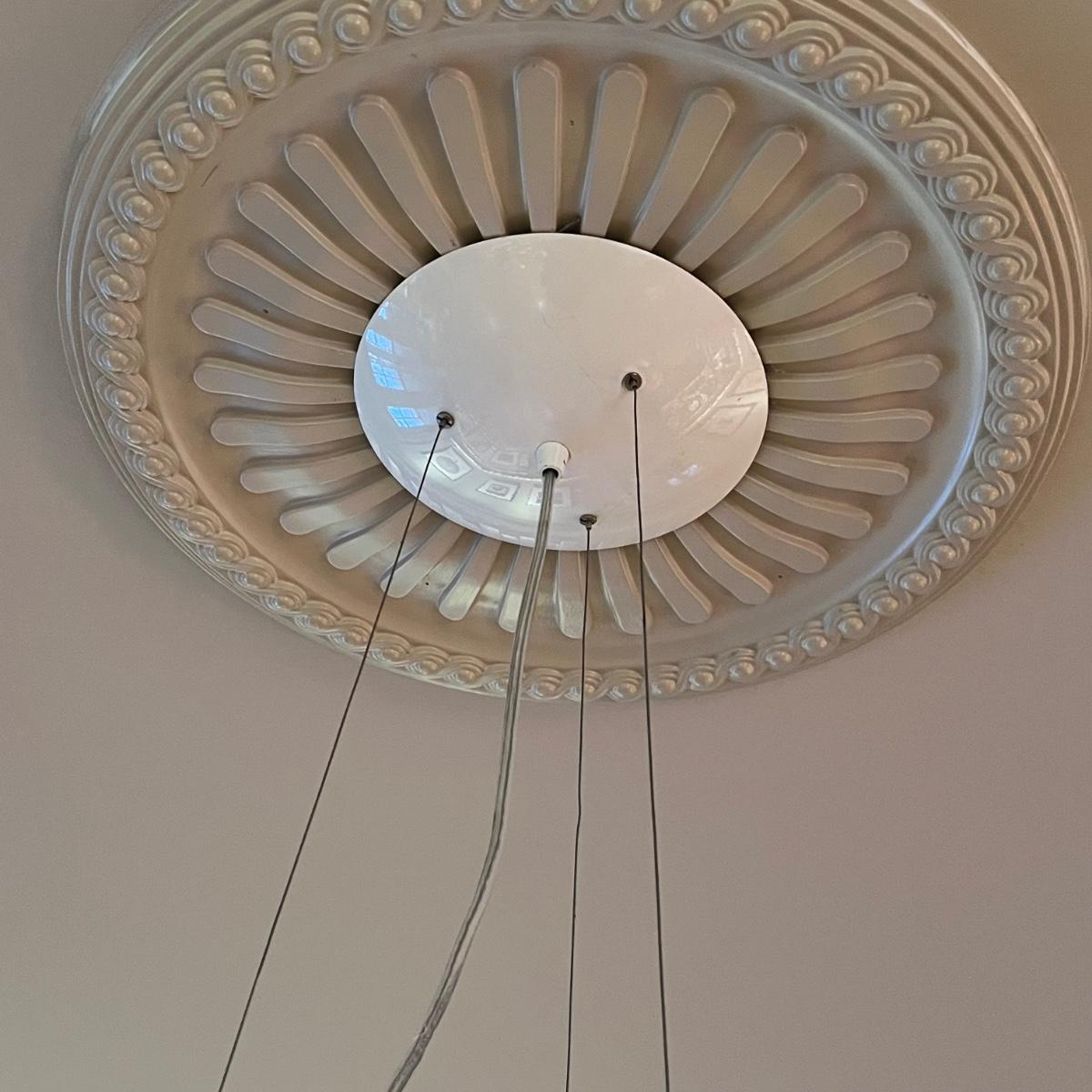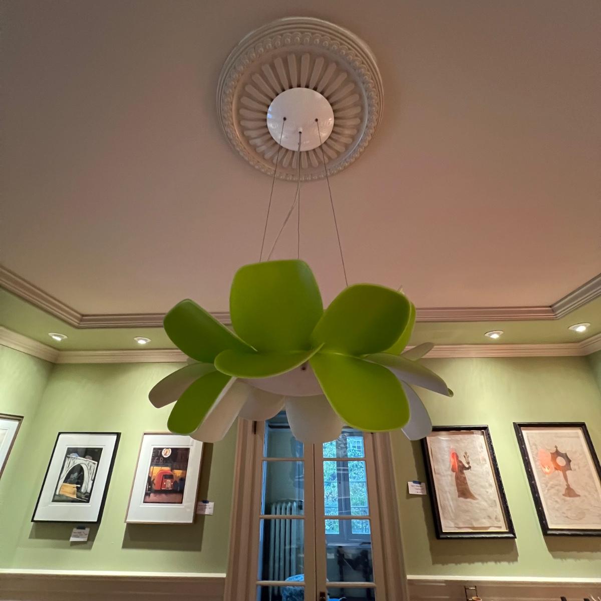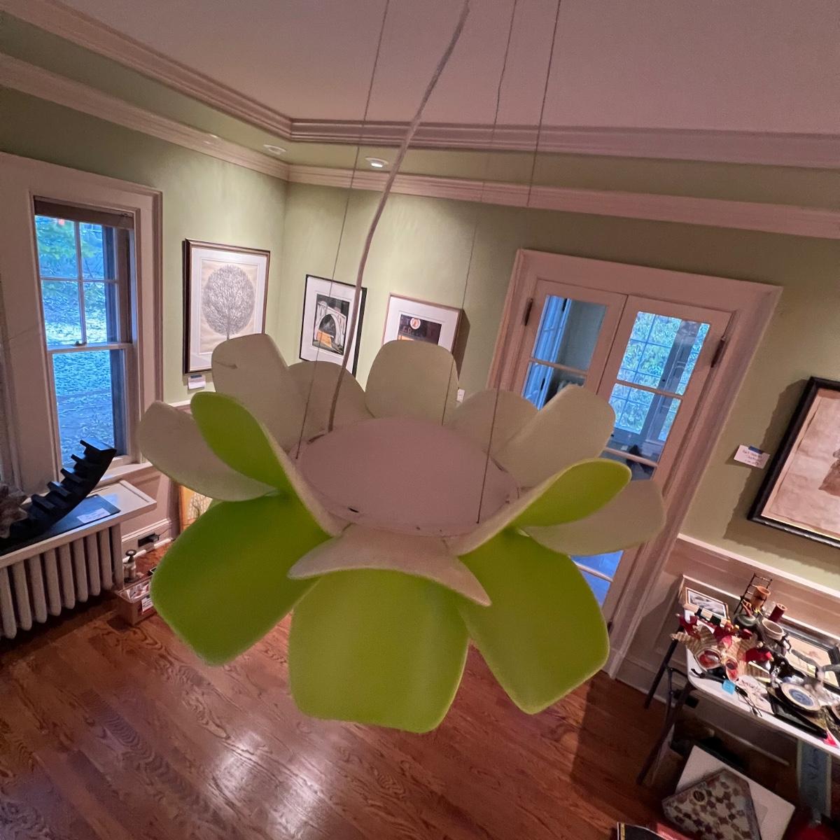 This modern light appears to be the Estiluz Infiore pendant lamp. It is shaped like a flower hence the Italian “Infiore” name. Pendant is composed of a group of petals in what appears to be bi-injected polycarbonate (this information was found online). Bulb is protected by a satin glass. It hangs off three wires. Winning bidder is responsible for removing the unit from the mount and wiring and must bring wire caps for loose wires. Power will be shut off for removal.