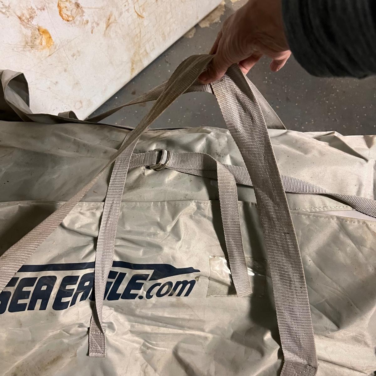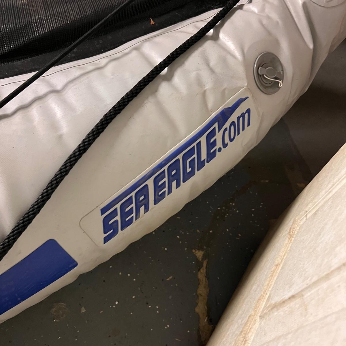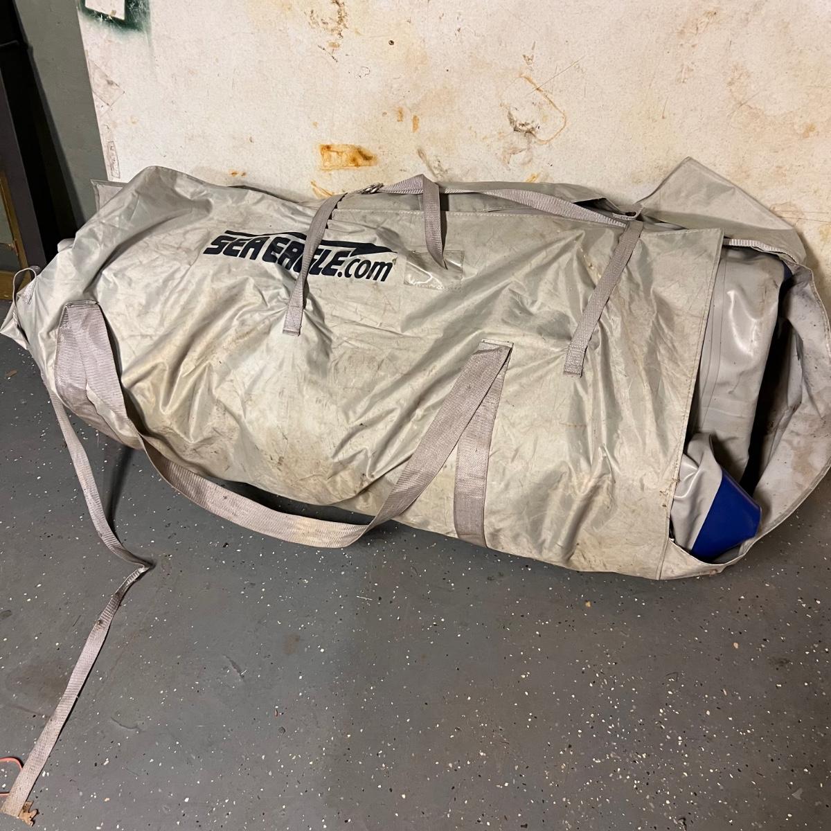 This Sea Eagle inflatable boat comes with oar, patch kit and a carry bag. See images for more information. It has been deflated for transportation. There are seats in other lots in this sale that would work for this boat.